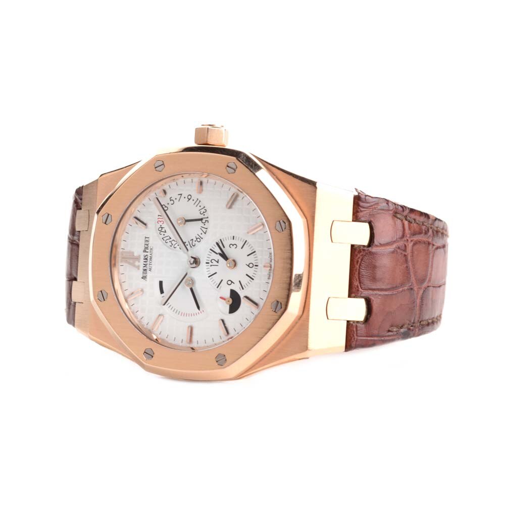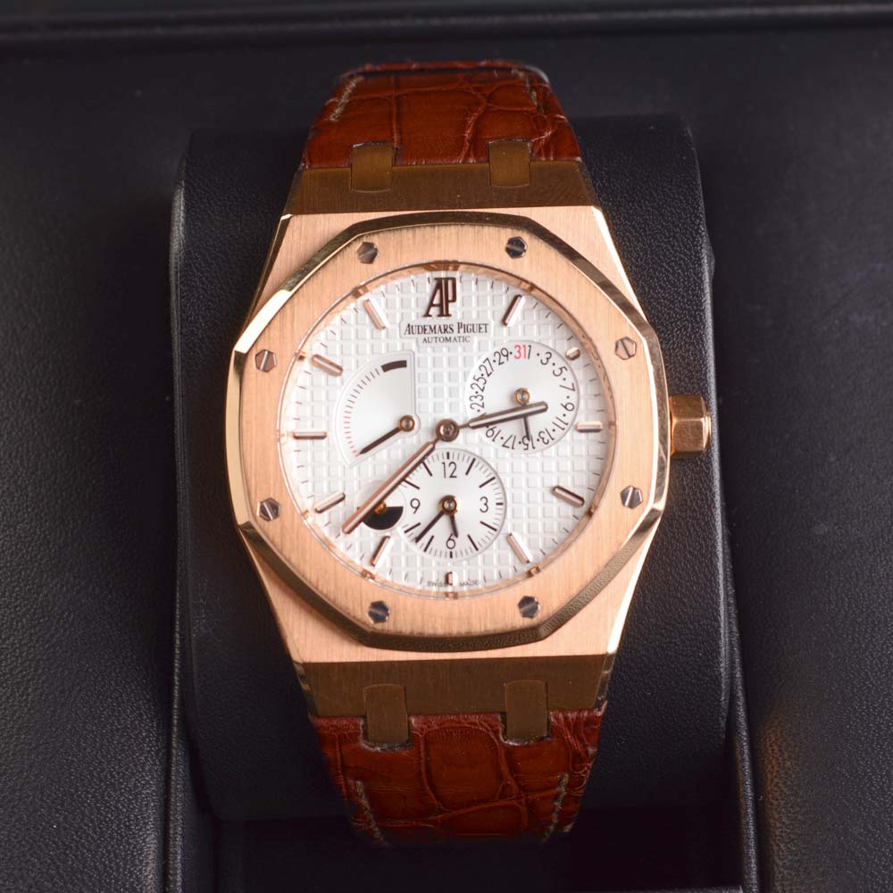 MOVEMENT : 오토매틱 CASE: 로즈골드(750) / GMT / 파워리저브 / 나사식용두 BAND: 가죽/ 접이식 버클(로즈골드750) 상태 : 각진프레임이 시크해보이며, 세련된 디자인으로 포인트로 착용하시기 좋습니다. 착용에 의한 잔스크래치 외 상태 양호합니다. 스트랩 주름감과 약간의 때탐 등 자연스러운 착용감 있습니다. 부속품 : 케이스, 보증서, 북렛 Made In SWISS