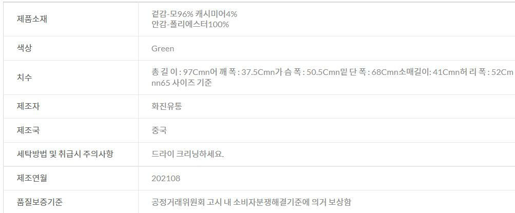 제품소재 겉감-모96% 캐시미어4% 안감-폴리에스터100% 색상 Black 치수 총 길 이 : 97Cmn어 깨 폭 : 37.5Cmn가 슴 폭 : 50.5Cmn밑 단 폭 : 68Cmn소매길이: 41Cmn허 리 폭 : 52Cmnn65 사이즈 기준 제조자 화진유통 제조국 중국 세탁방법 및 취급시 주의사항 드라이 크리닝하세요. 제조연월 202108 품질보증기준 공정거래위원회 고시 내 소비자분쟁해결기준에 의거 보상함 A/S 책임자와 전화번호 02 2067 2207