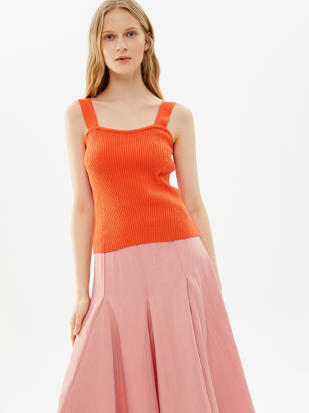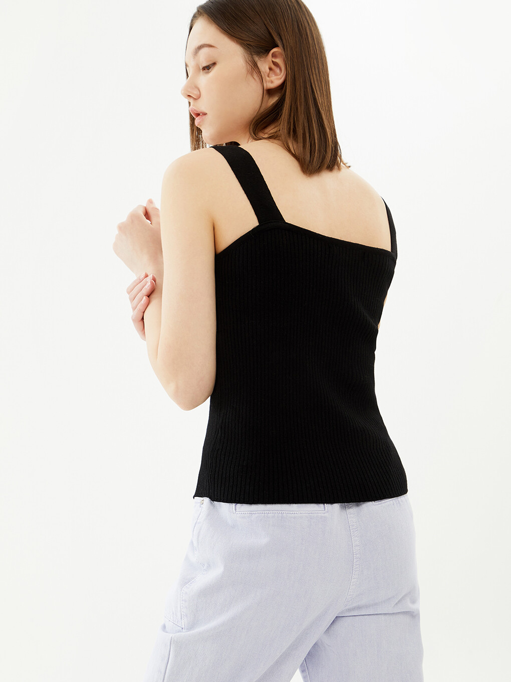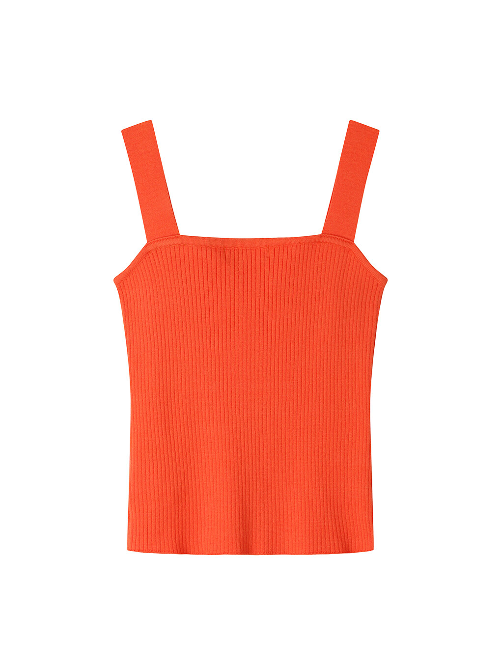 전체 리브 짜임으로 슬림한 실루엣이 연출되어지는 슬리브리스 니트 탑입니다.