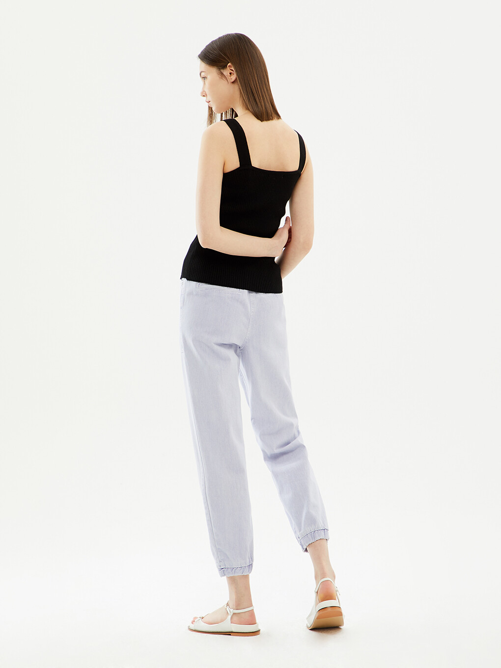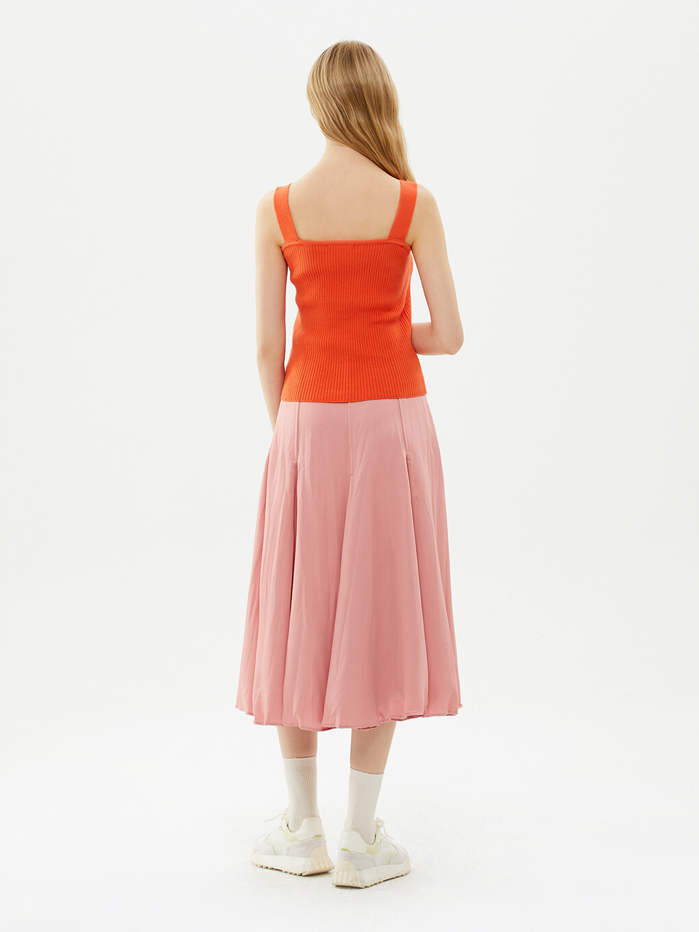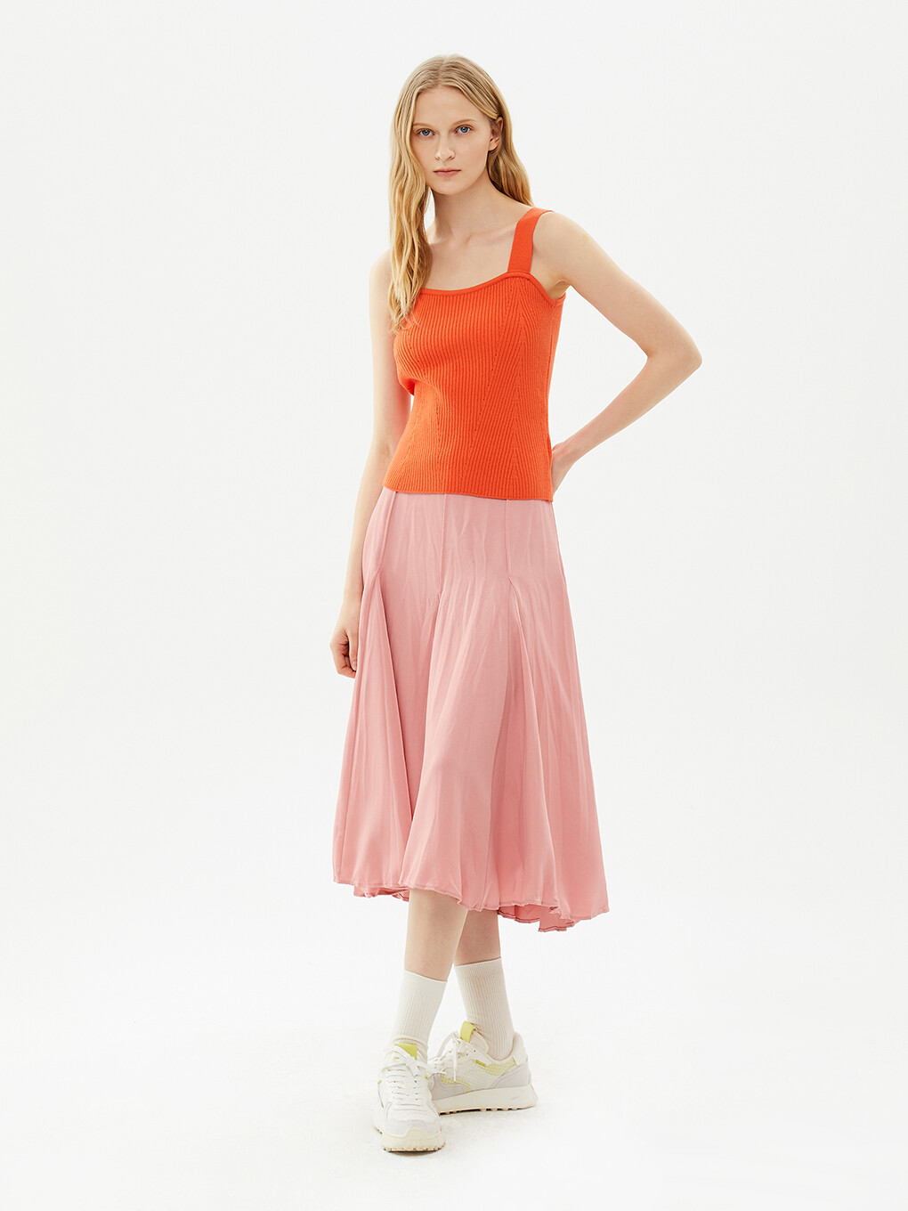 전체 리브 짜임으로 슬림한 실루엣이 연출되어지는 슬리브리스 니트 탑입니다.