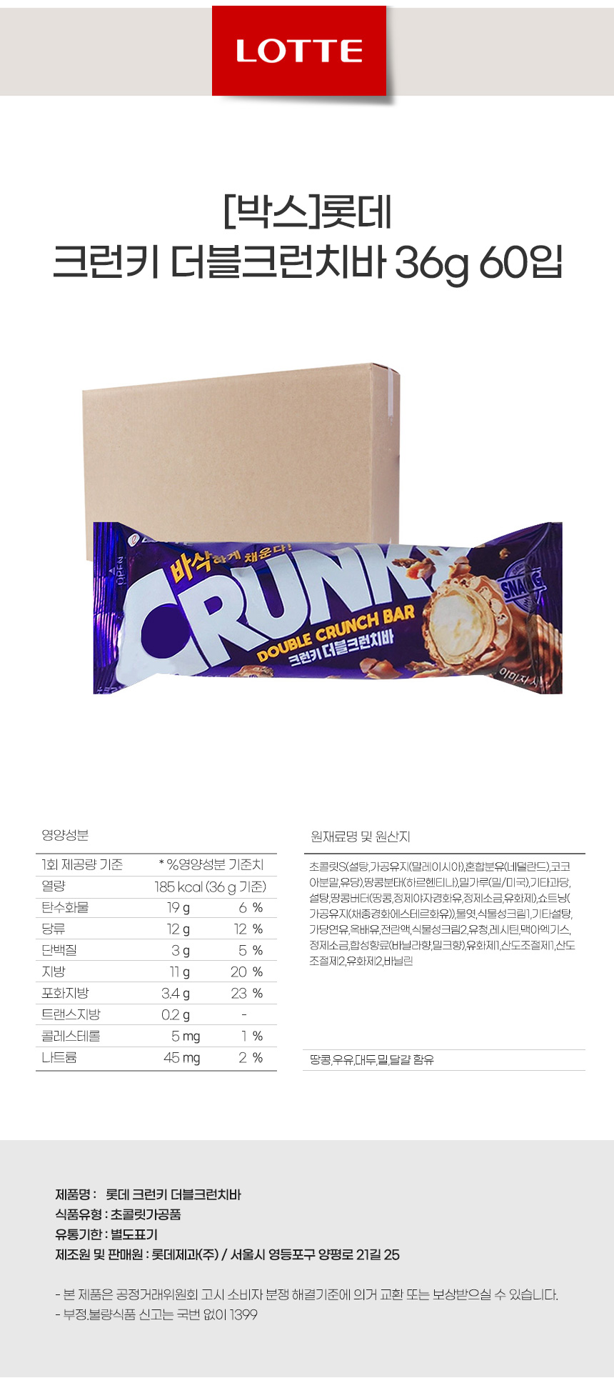 해당 상품은 [[박스]롯데 크런키 더블크런치바 36g 60입 (2160g) ] 구성의 상품입니다.