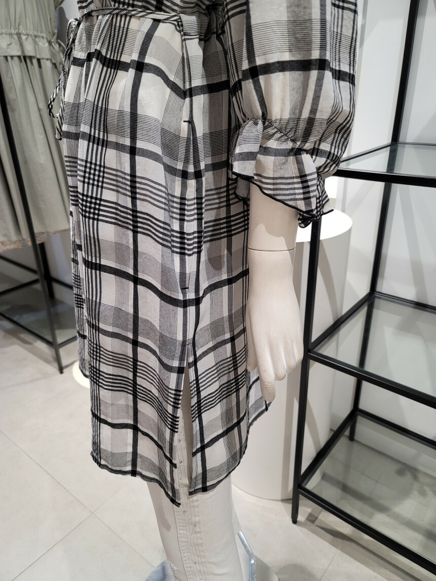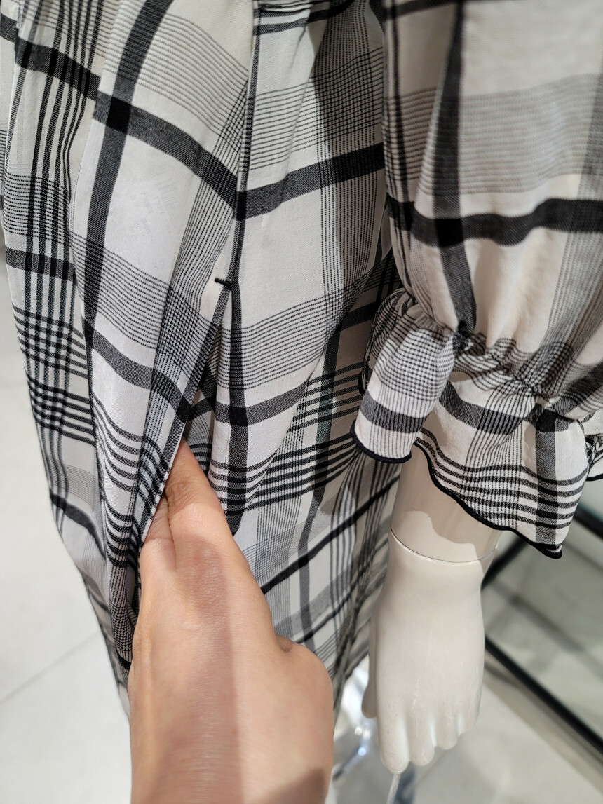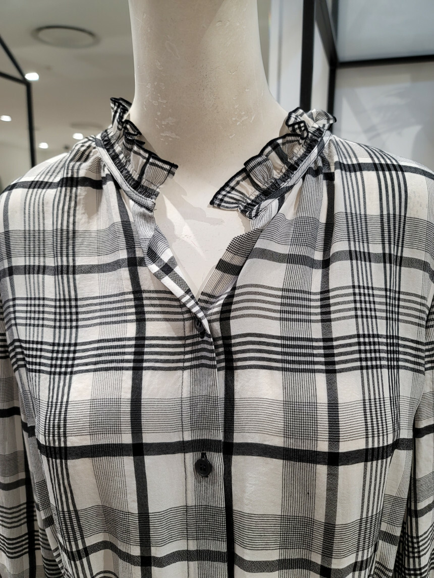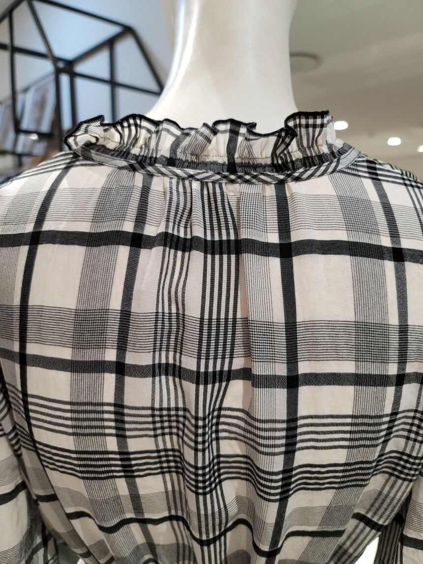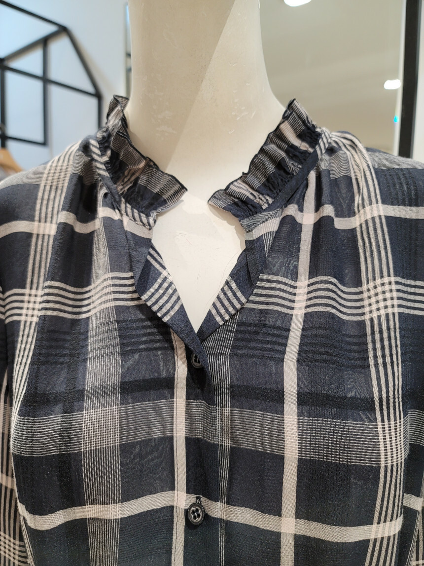 루주핏으로 깔끔하게 떨어지는 핏감이 예쁘고 체크 패턴과 러플 포인트로 여성스럽고 세련된 시원한 아이템입니다.