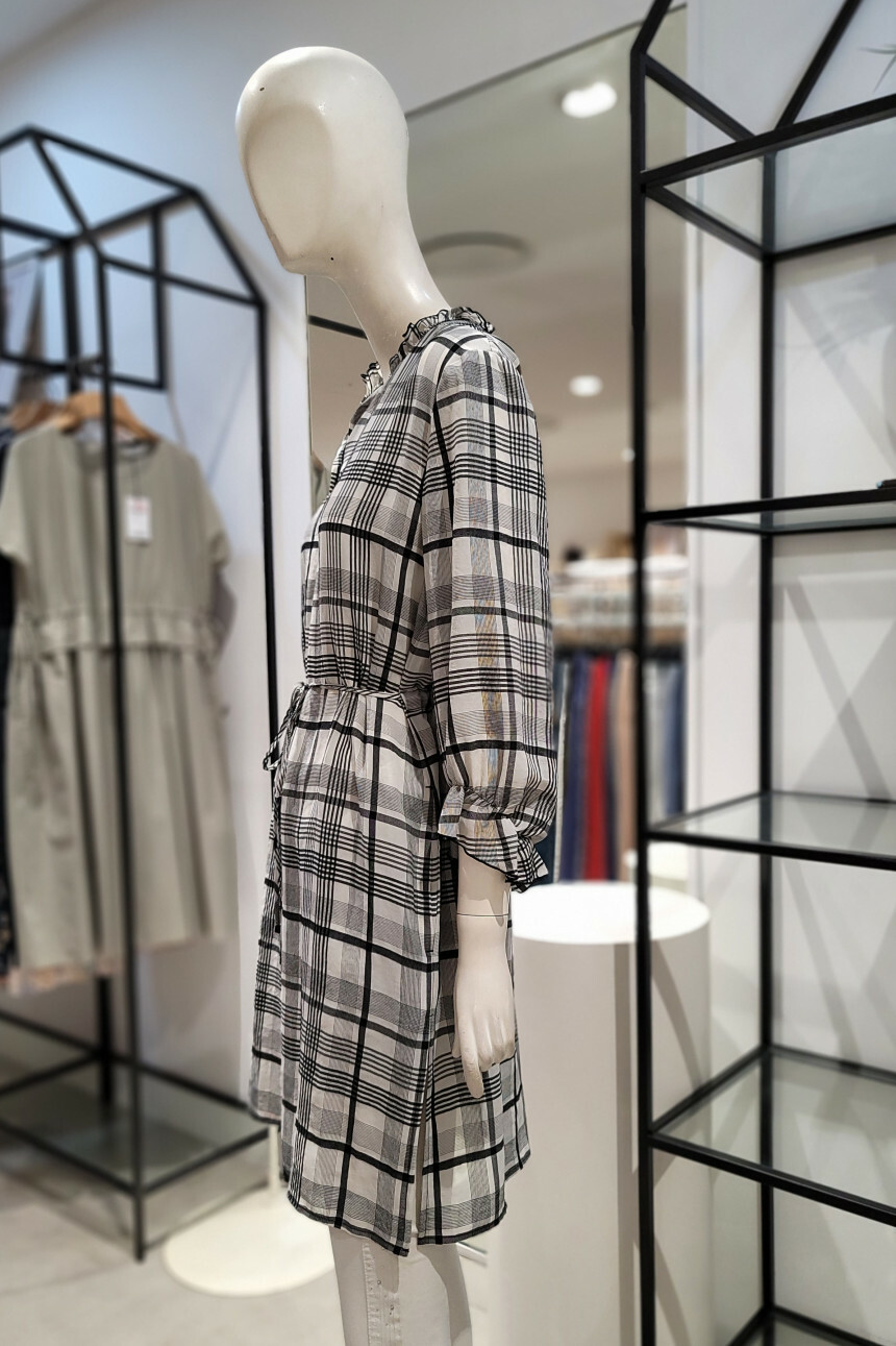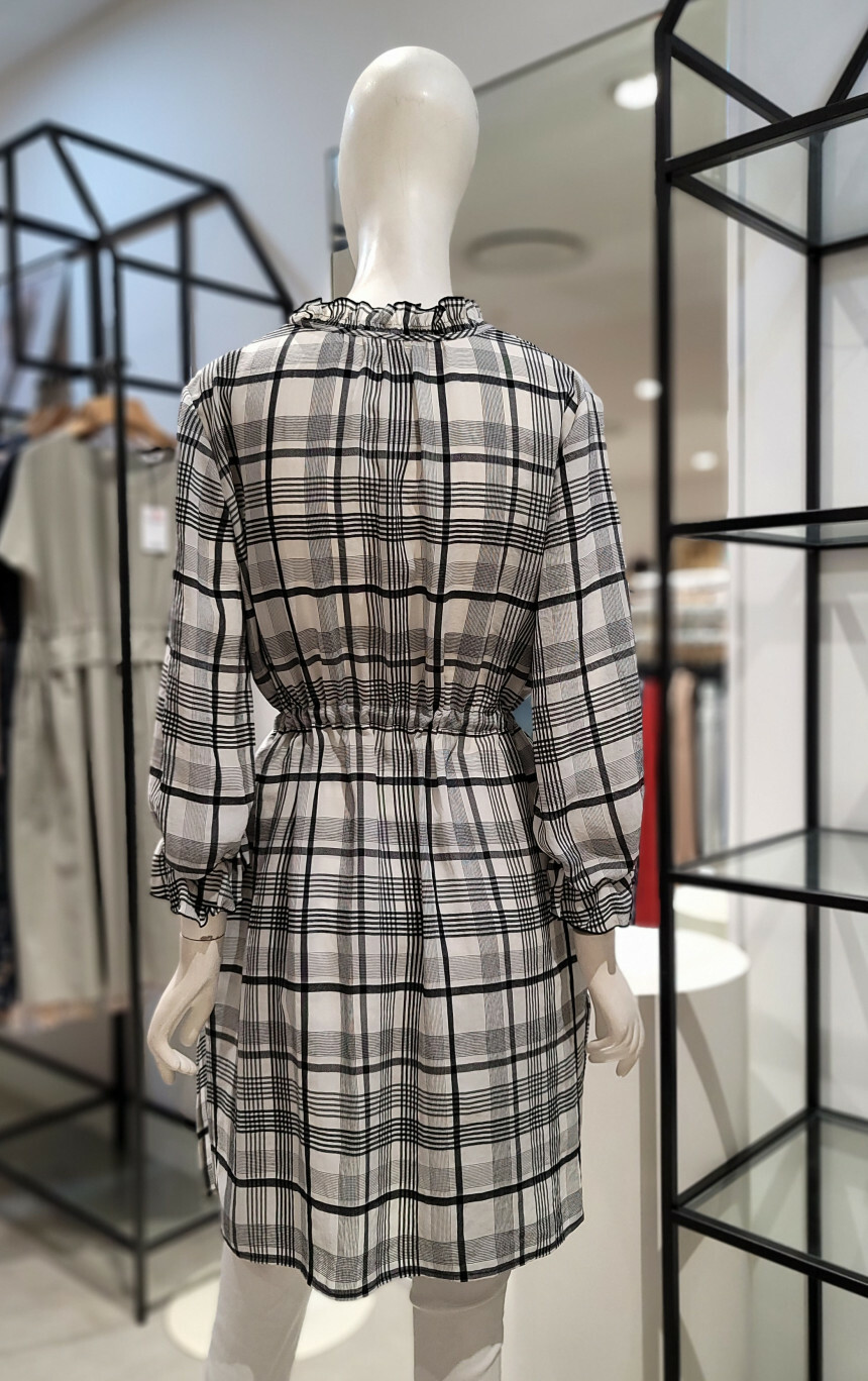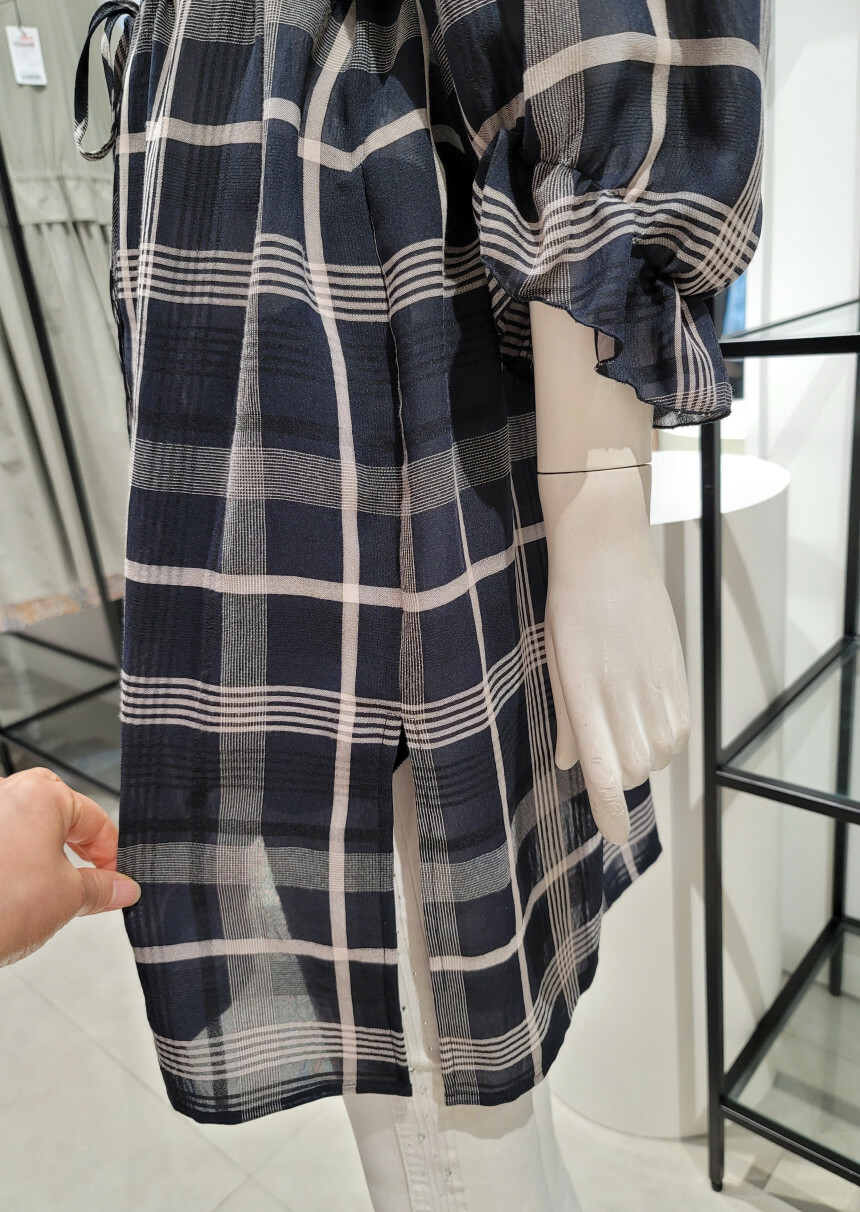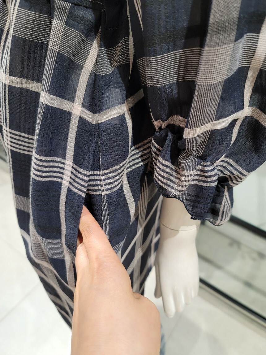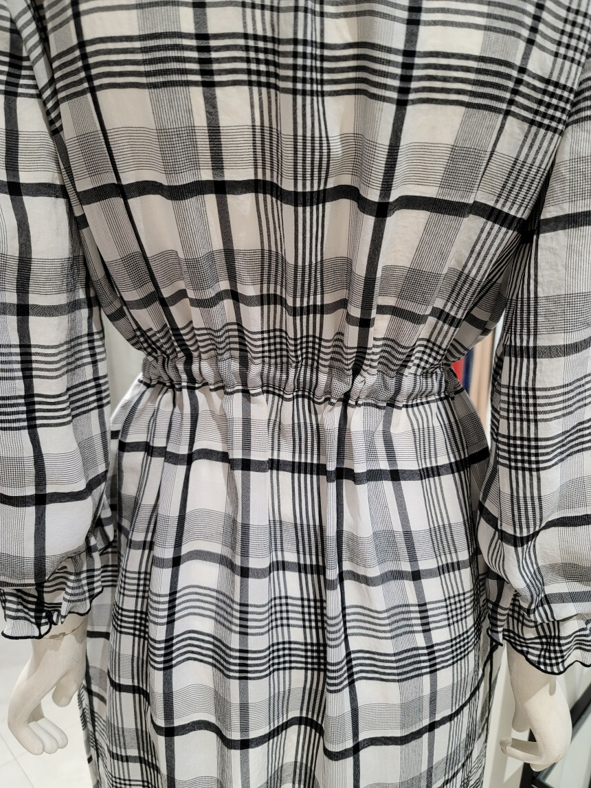 루주핏으로 깔끔하게 떨어지는 핏감이 예쁘고 체크 패턴과 러플 포인트로 여성스럽고 세련된 시원한 아이템입니다.