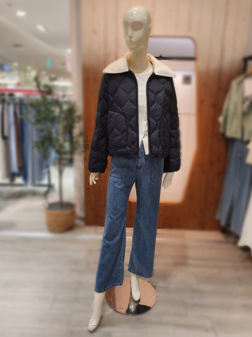 울이 50% 이상 혼방된 따뜻한 니트 카라와 물결 퀼팅의 조화로 페미닌한 룩을 연출할 수 있습니다.