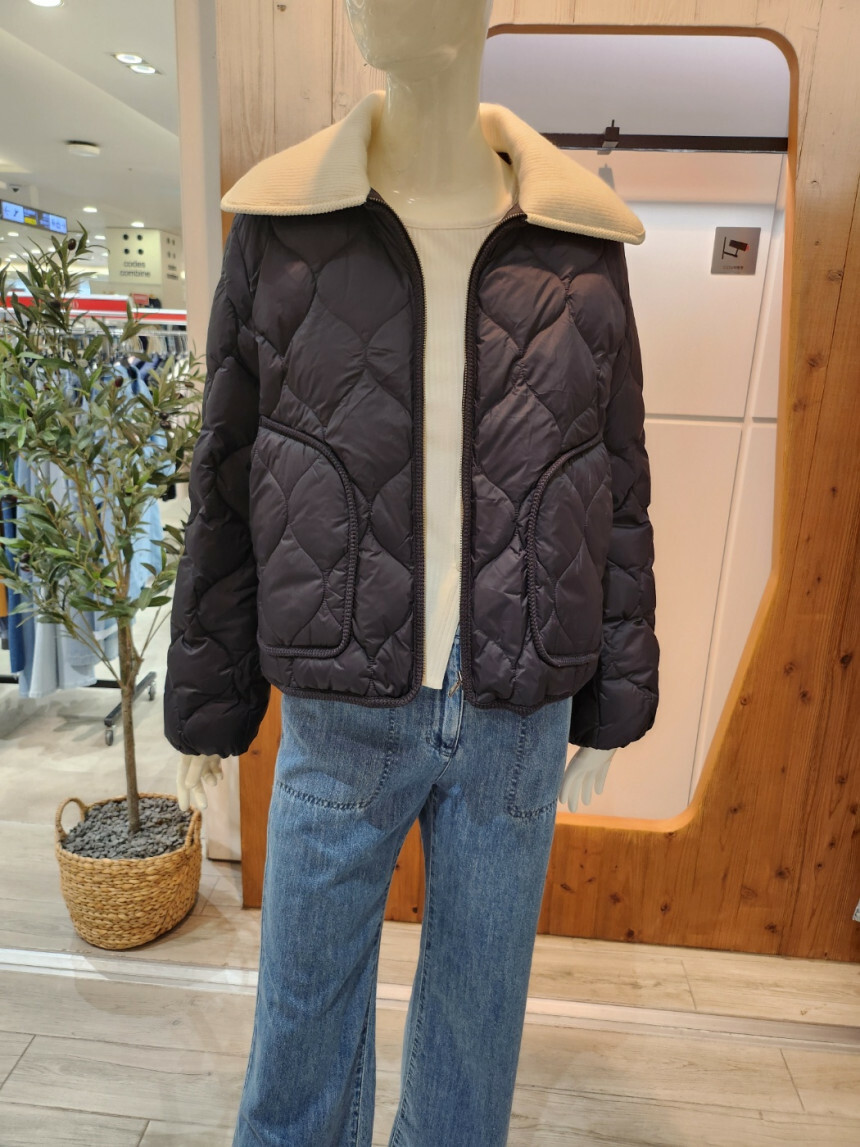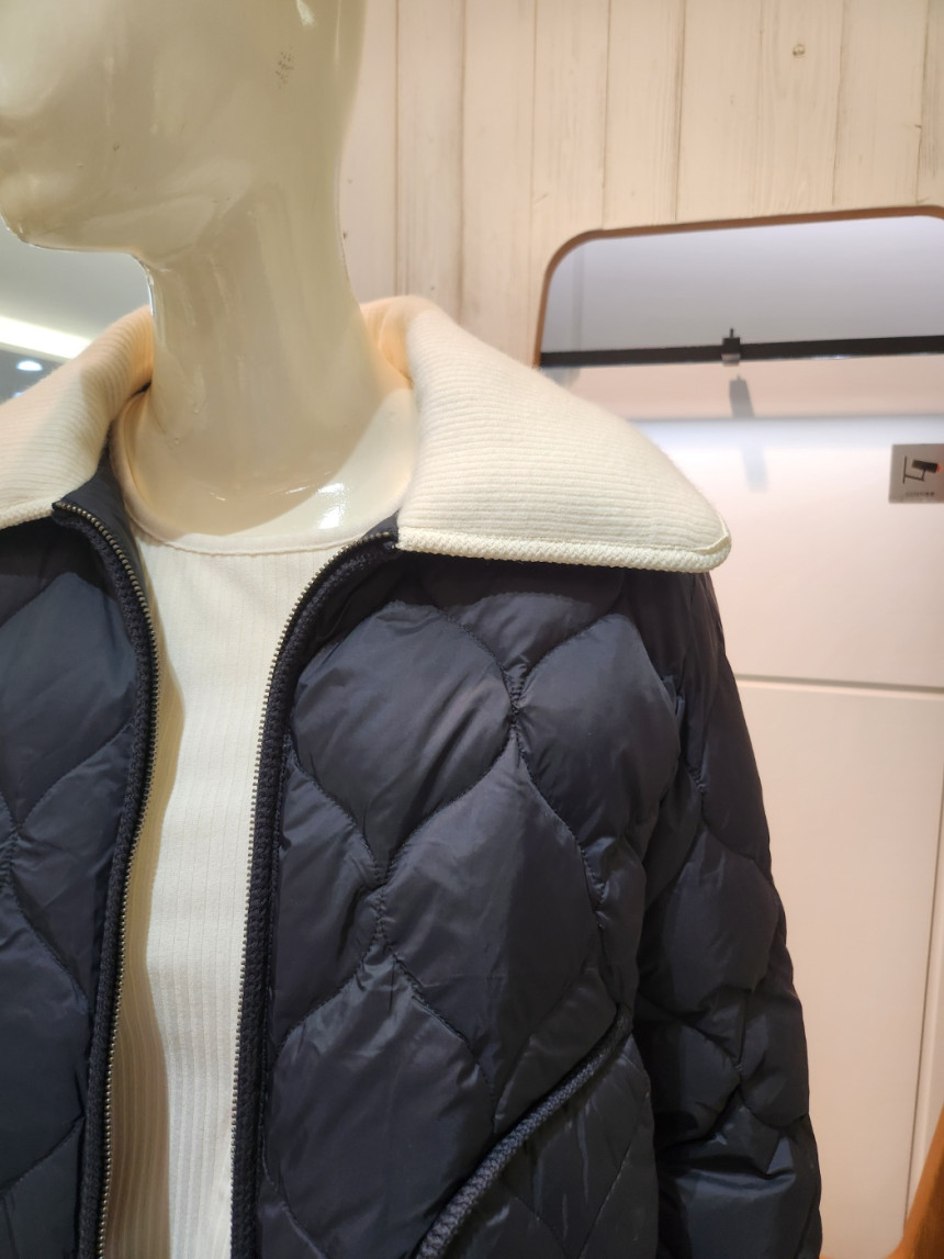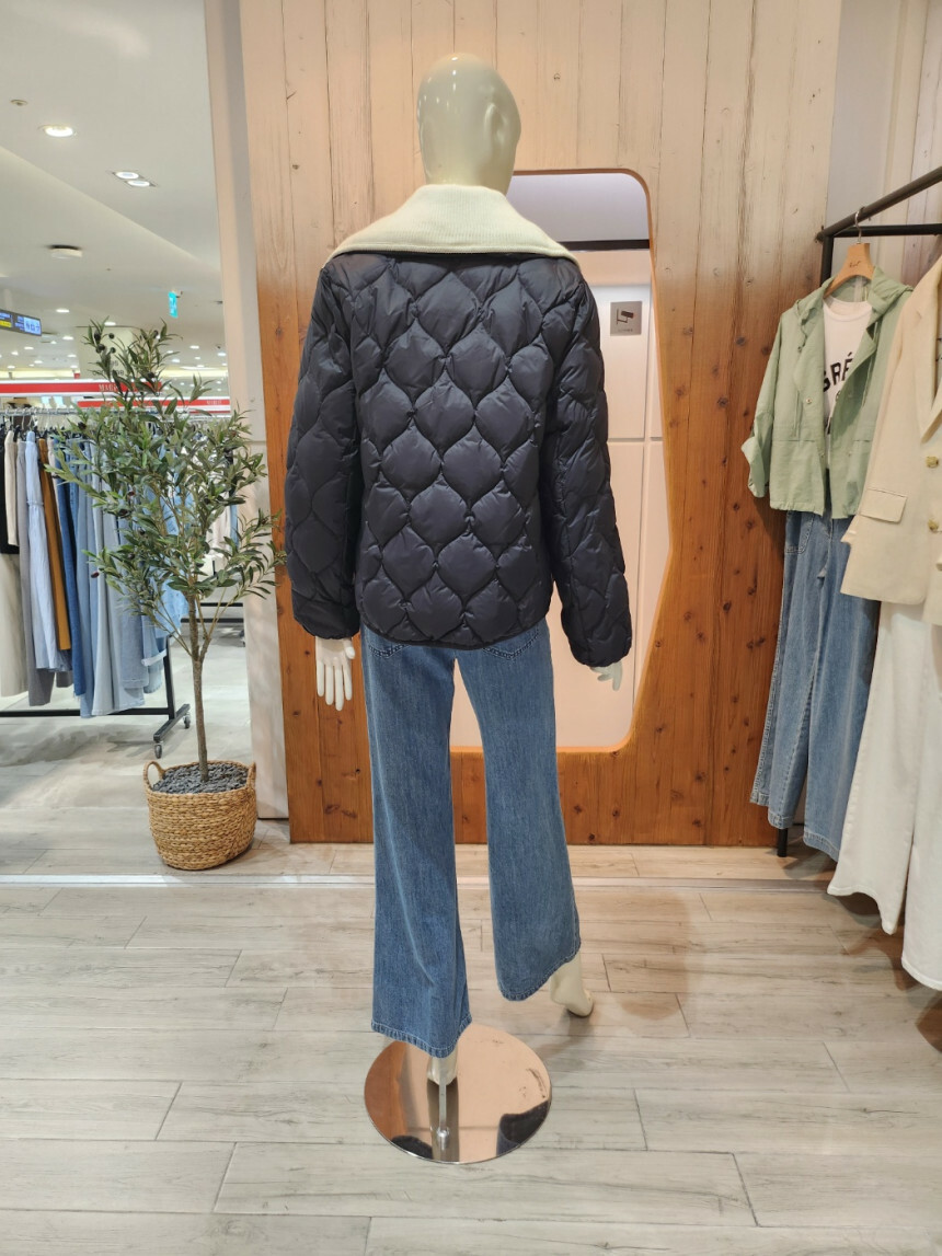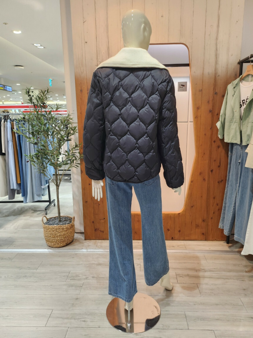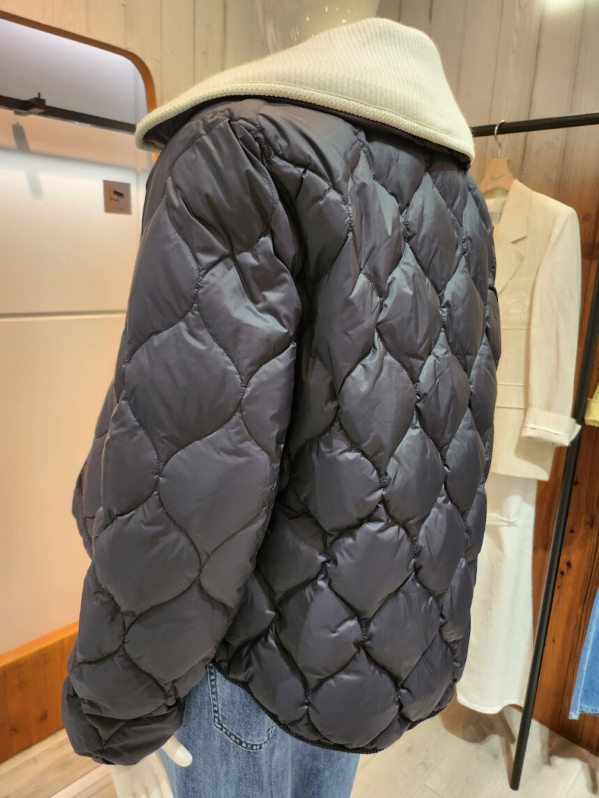 니트 카라 및 바인딩으로 포인트를 준 물결 퀼팅 숏 다운입니다.