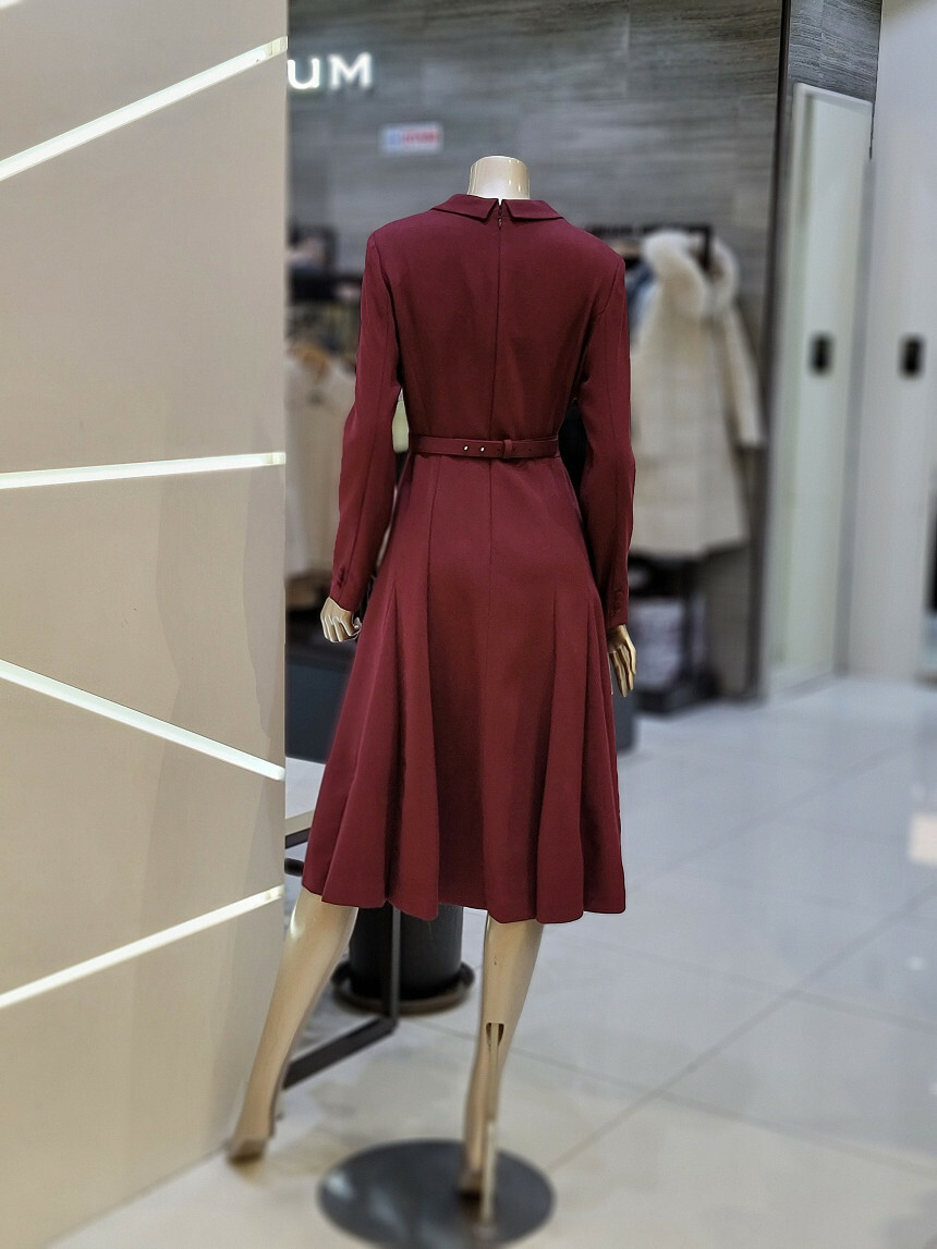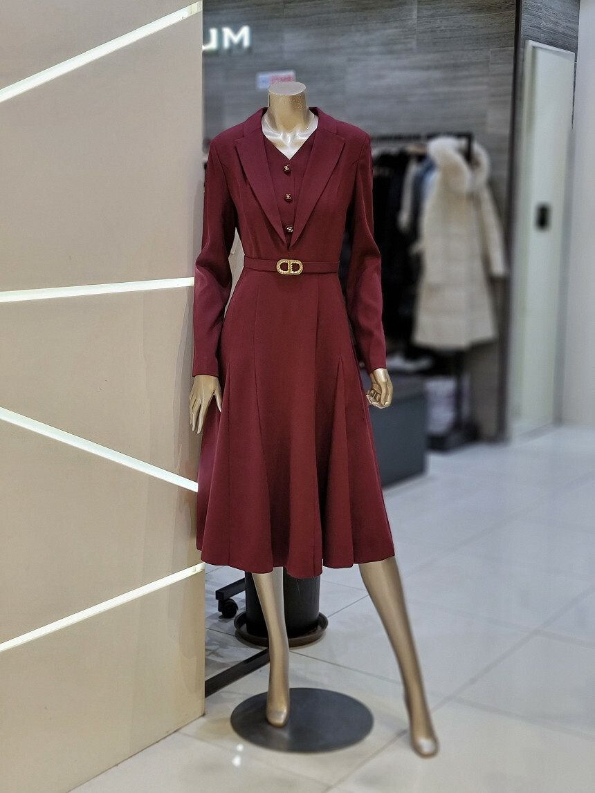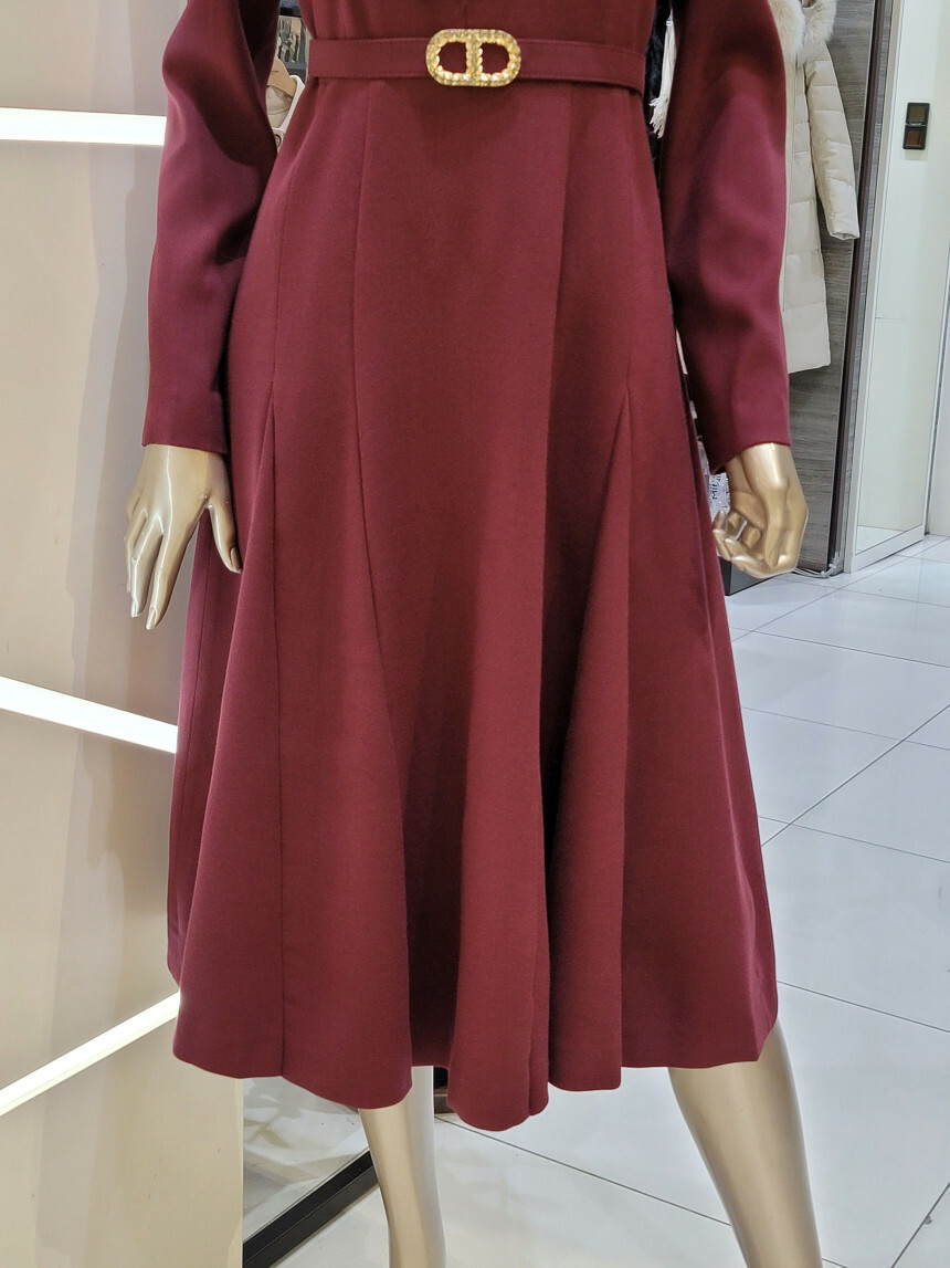 A 라인의 풍성한 플레어스커트와 레이어드 카라 디자인으로