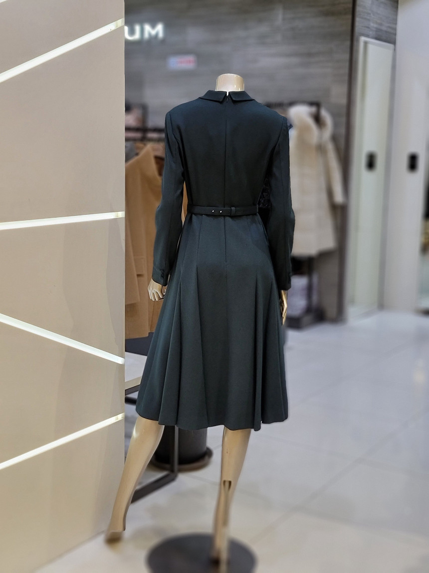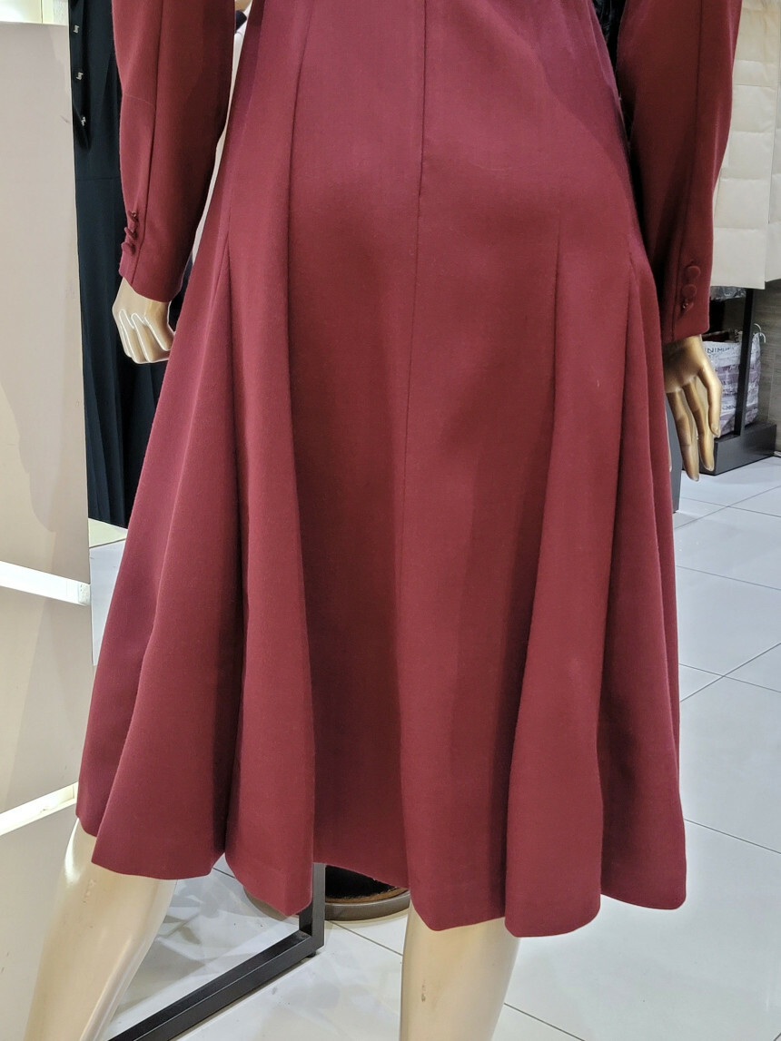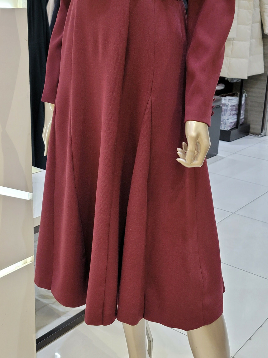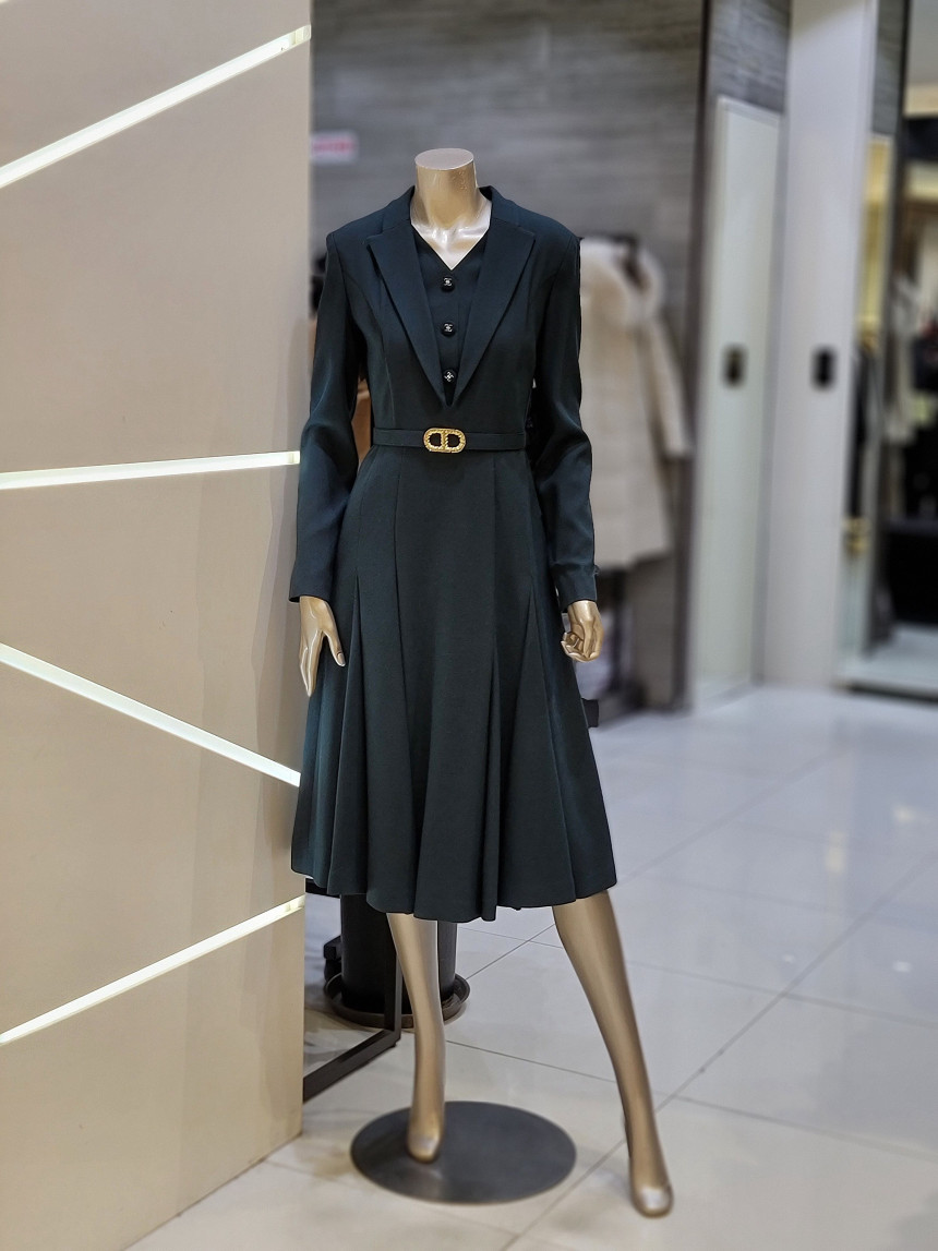 A 라인의 풍성한 플레어스커트와 레이어드 카라 디자인으로
