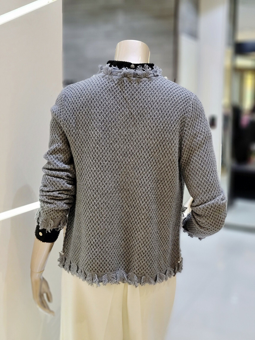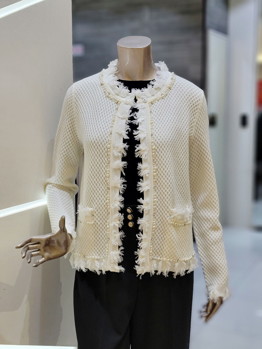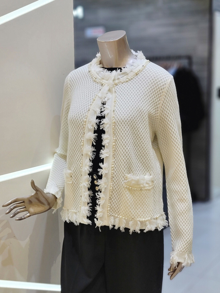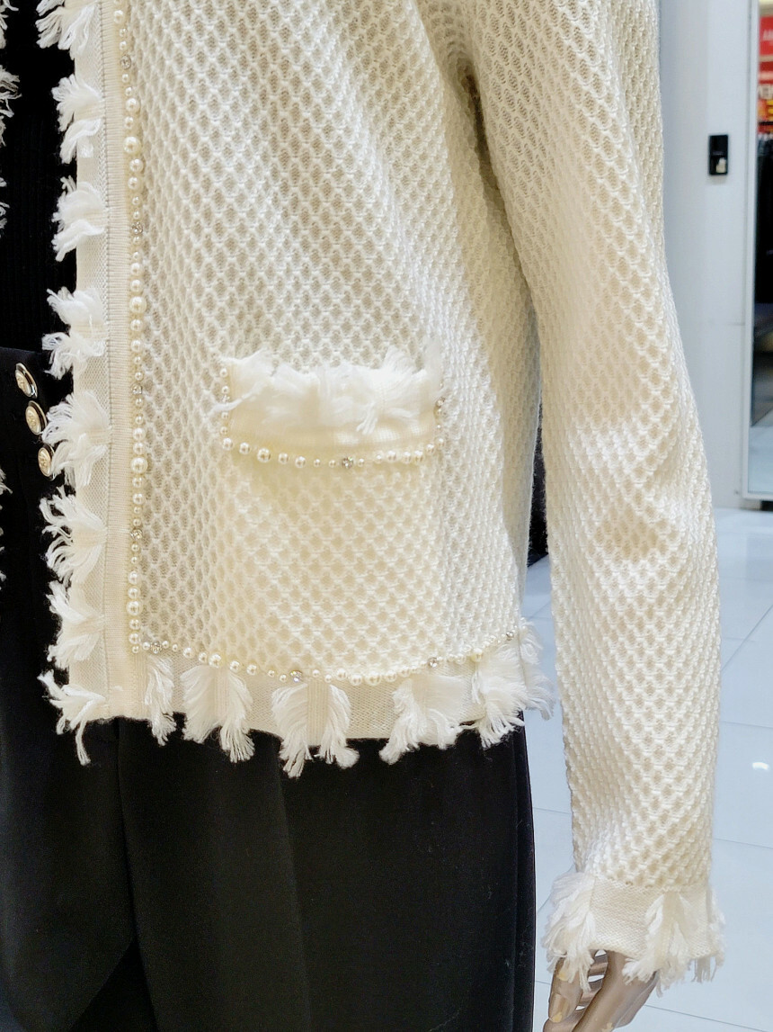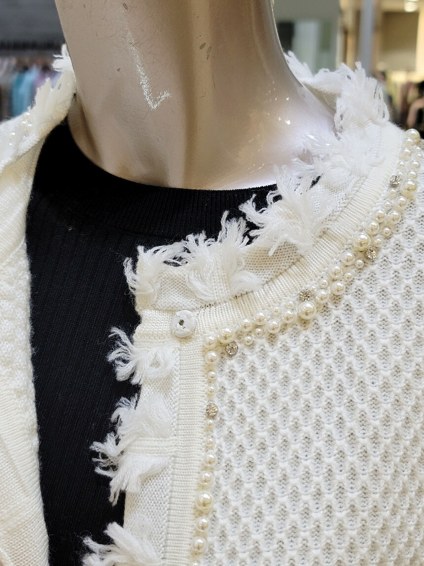 네크라인에서 프런트 라인 펄 장식과 부분 프린지 디테일로