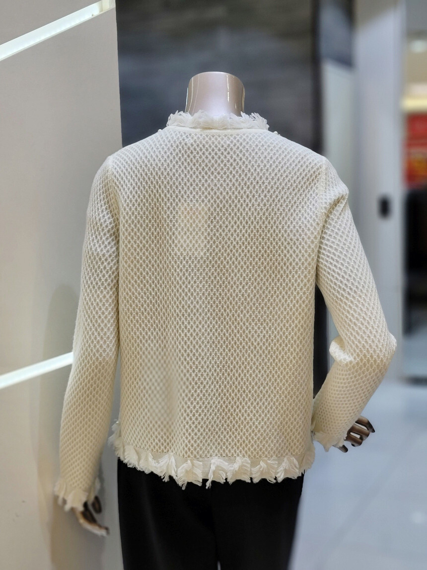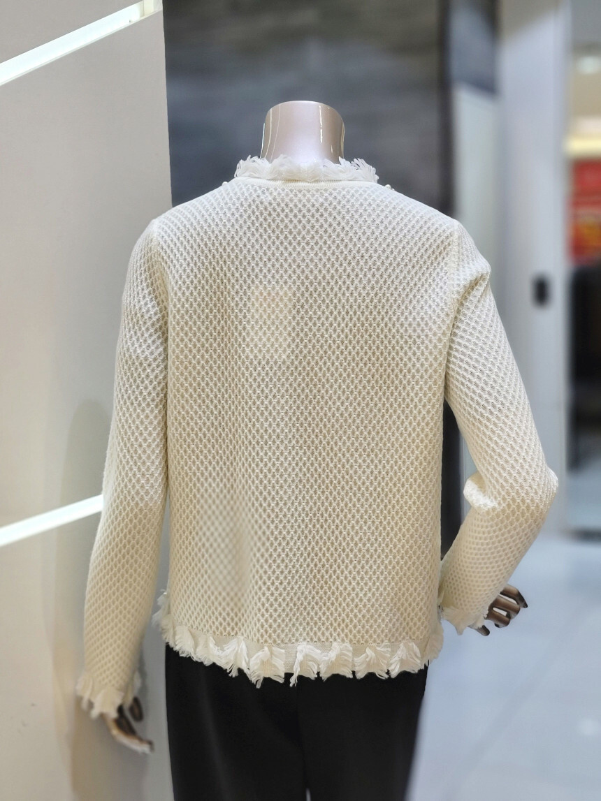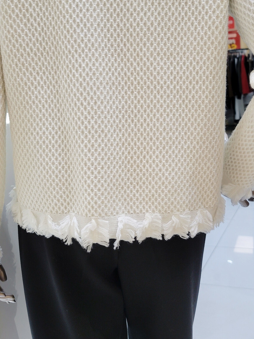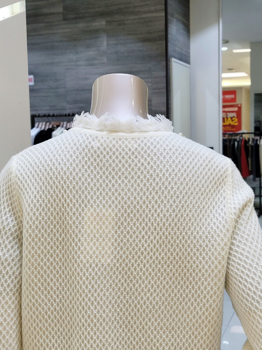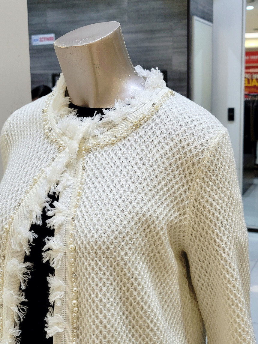 네크라인에서 프런트 라인 펄 장식과 부분 프린지 디테일로