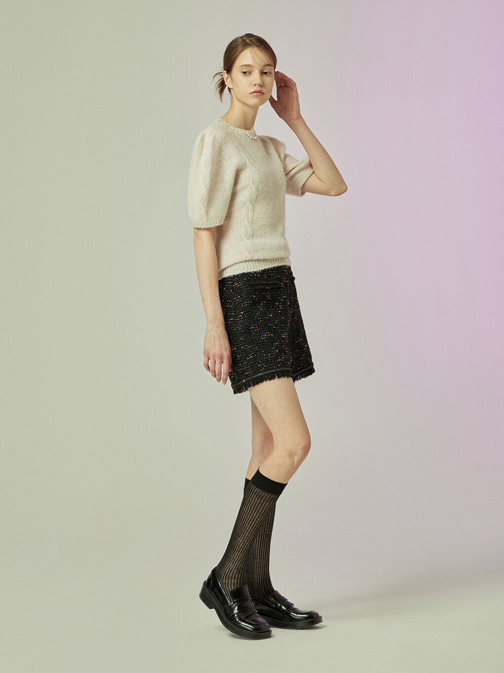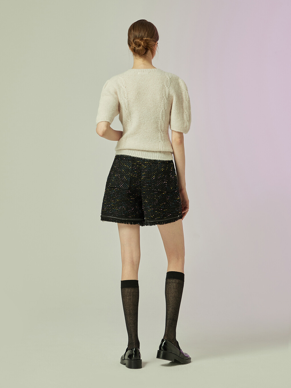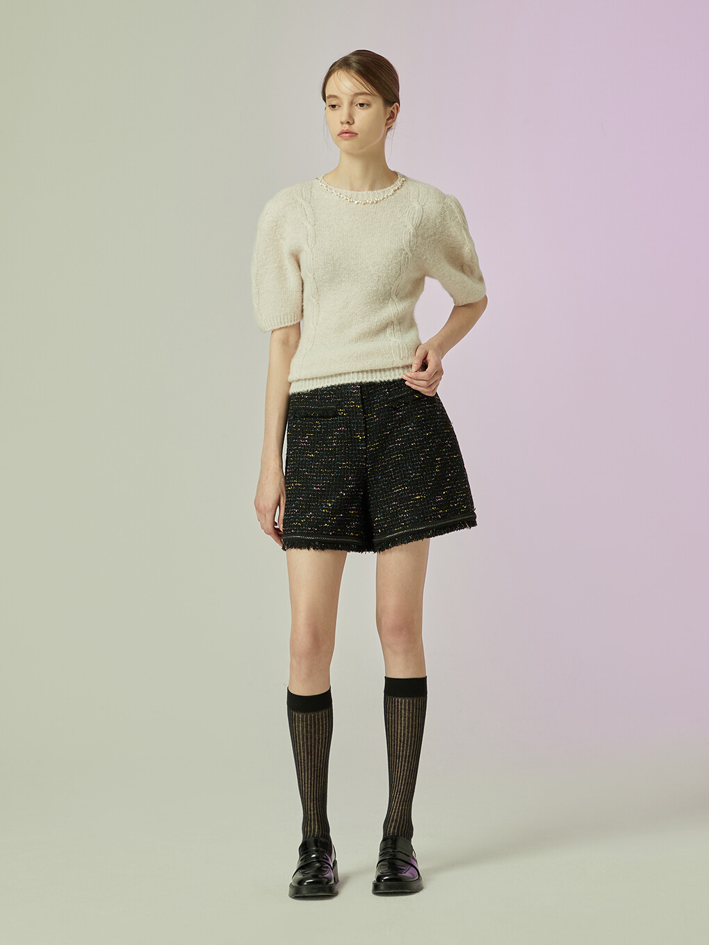 - 트위드 소재의 숏팬츠로 뒤 허리에 밴딩을 넣어 착용감이 편안합니다.