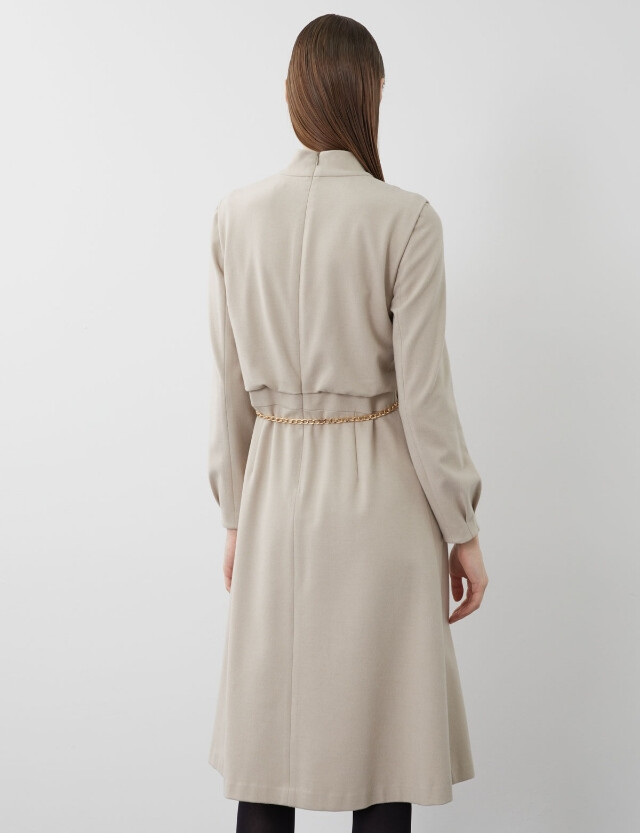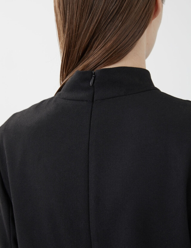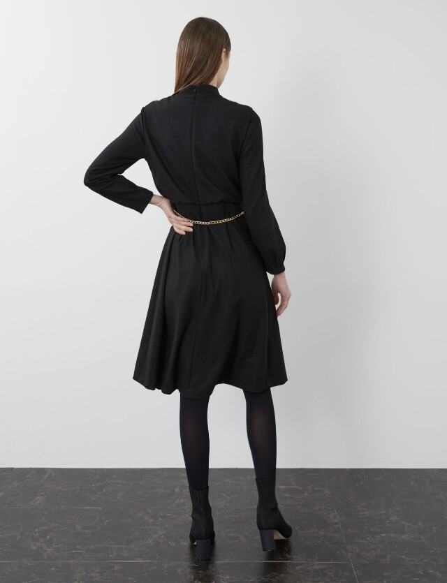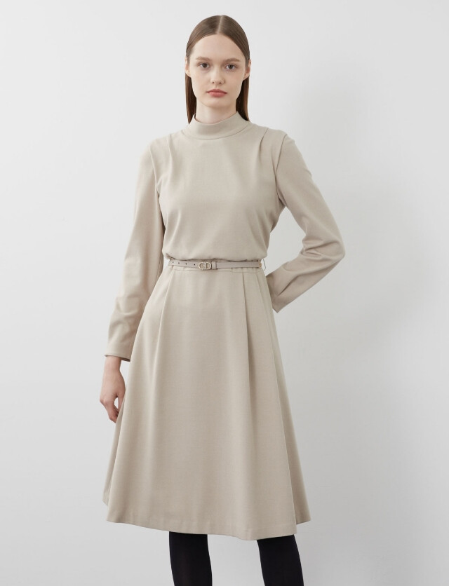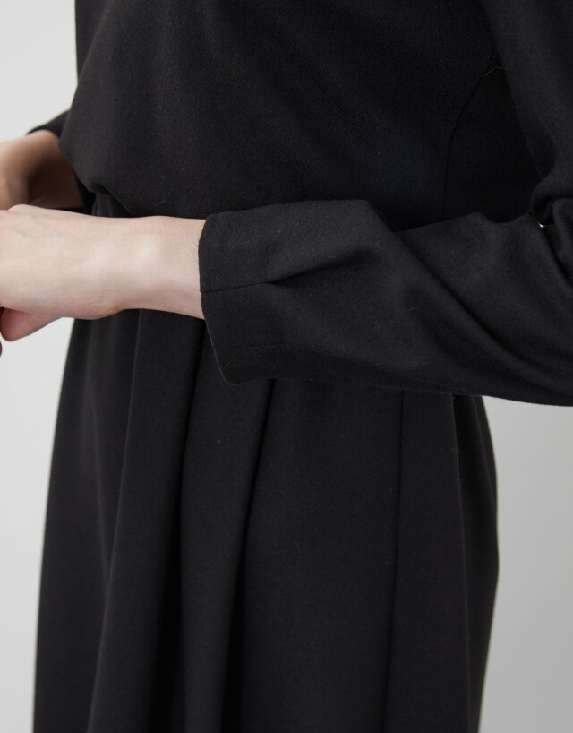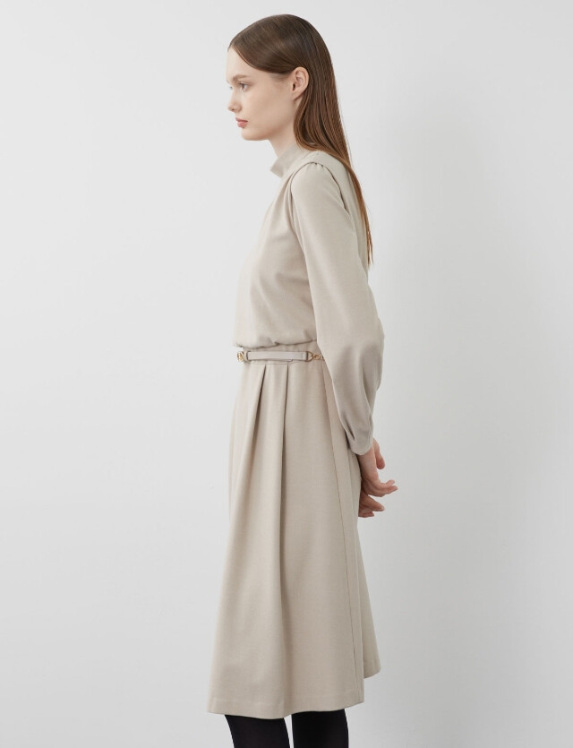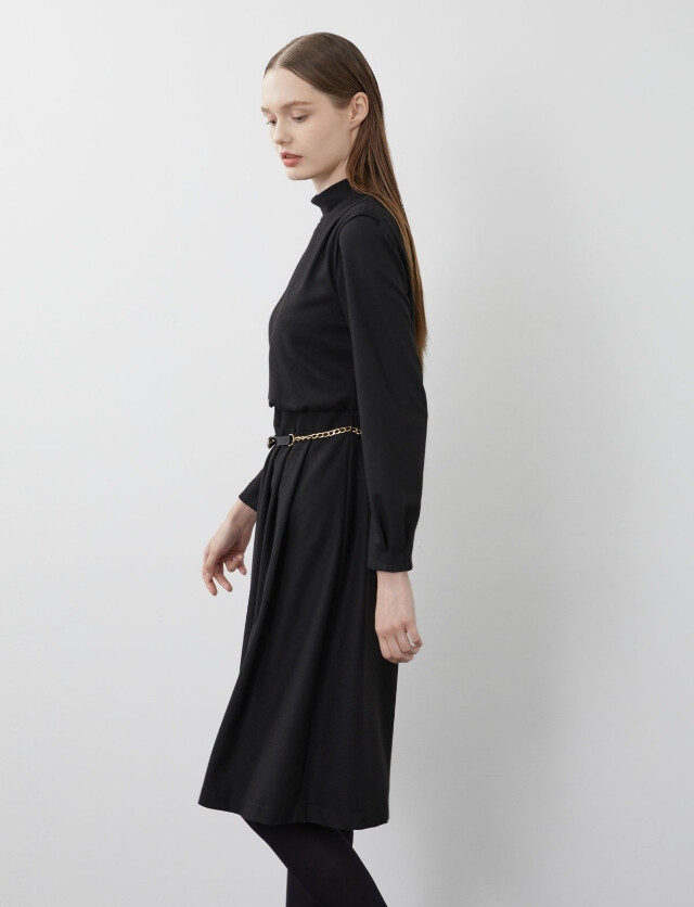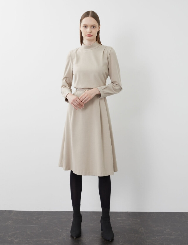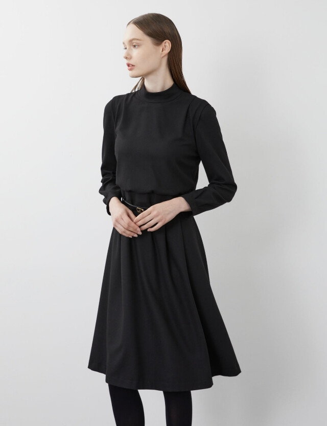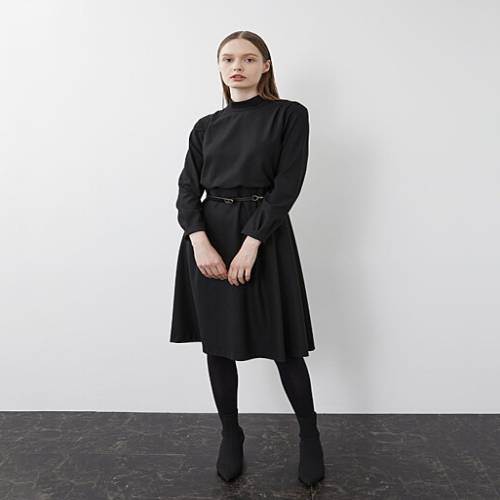 부드러운 터치감의 소재를 사용한 플레어 원피스 입니다 낮은 밴드넥에 블루종 디테일일로 볼륨감 있는