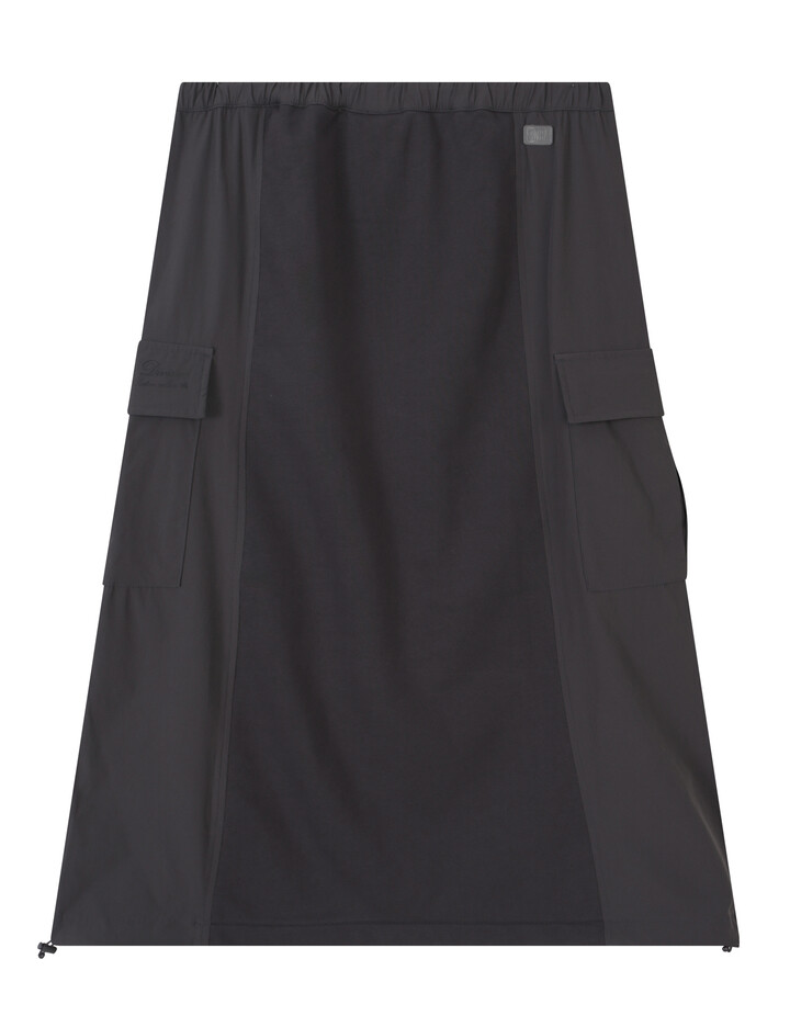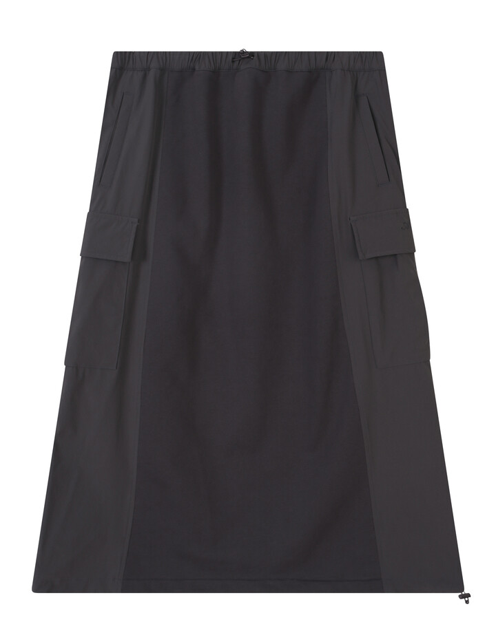 져지와 우븐원단을 배색으로 사용한 무릎밑으로 떨어지는 롱기장의 카고 스커트로 편안하면서도 트렌디한 룩으로 연출 가능한 데일리 아이템
