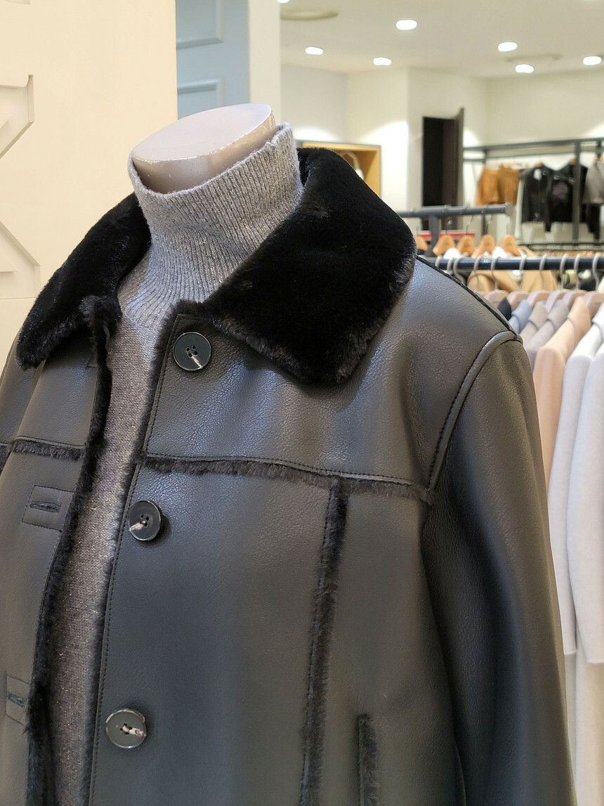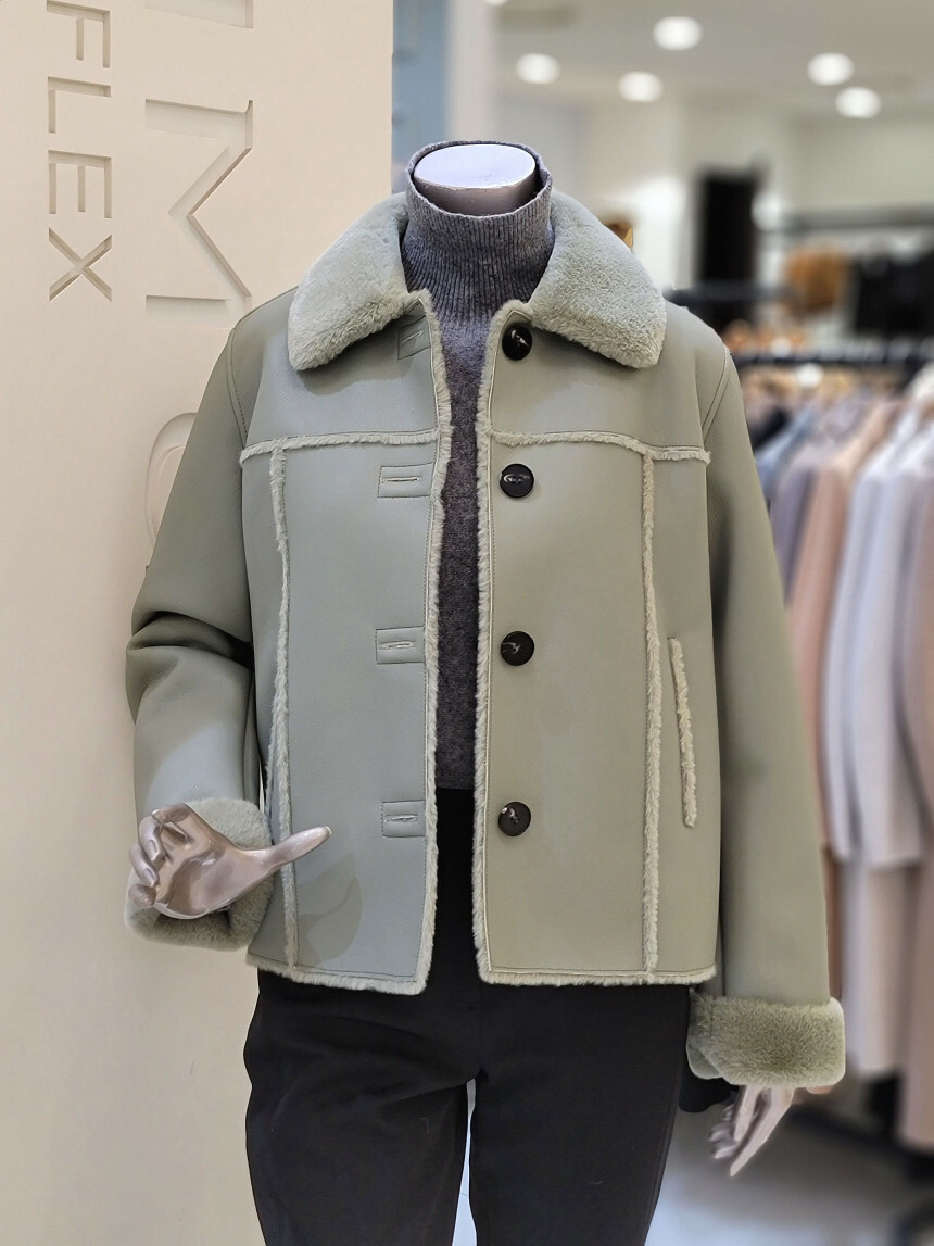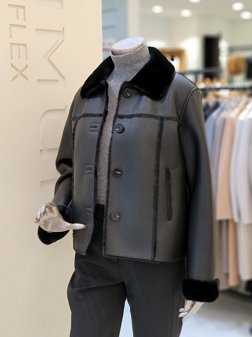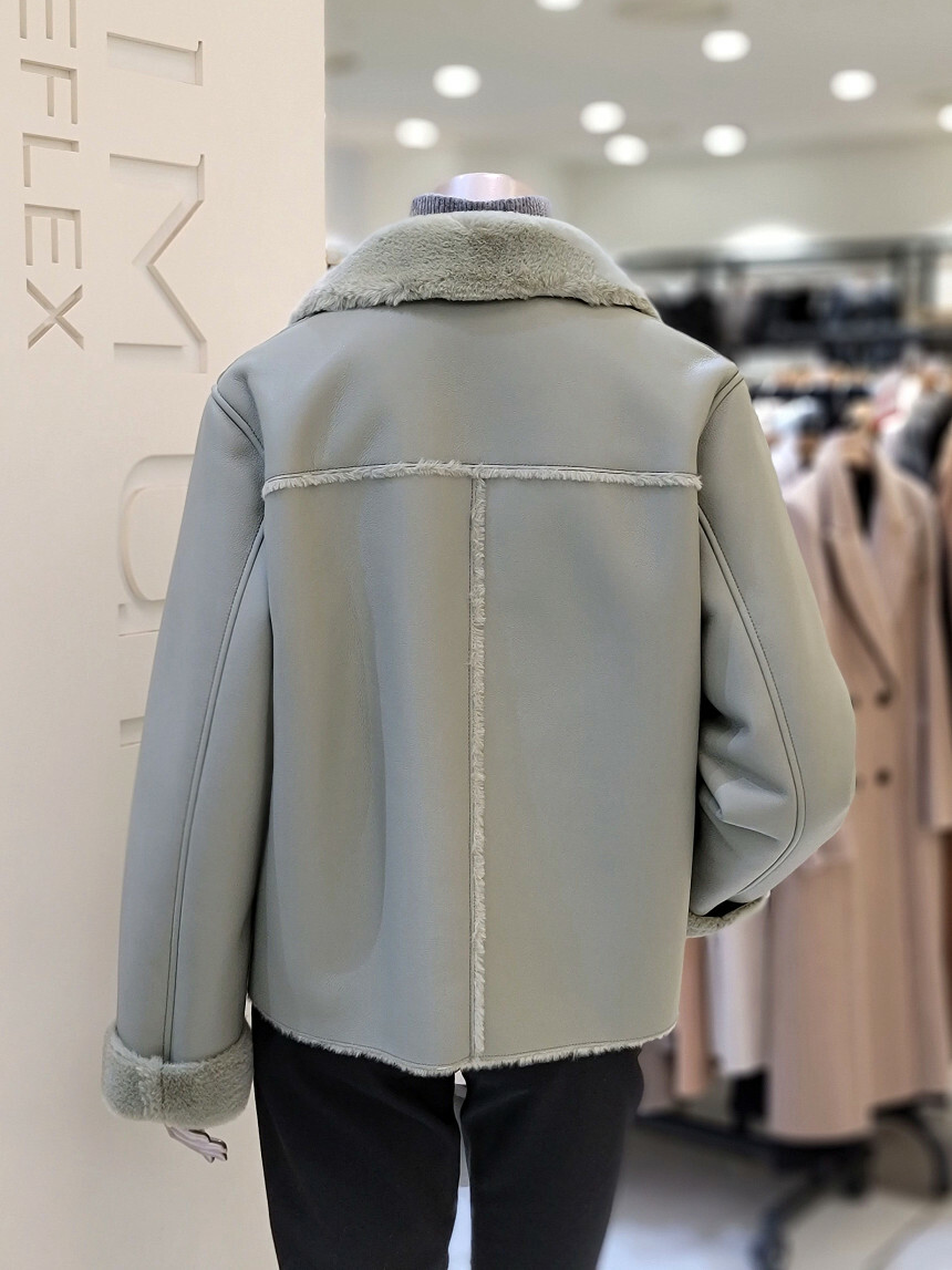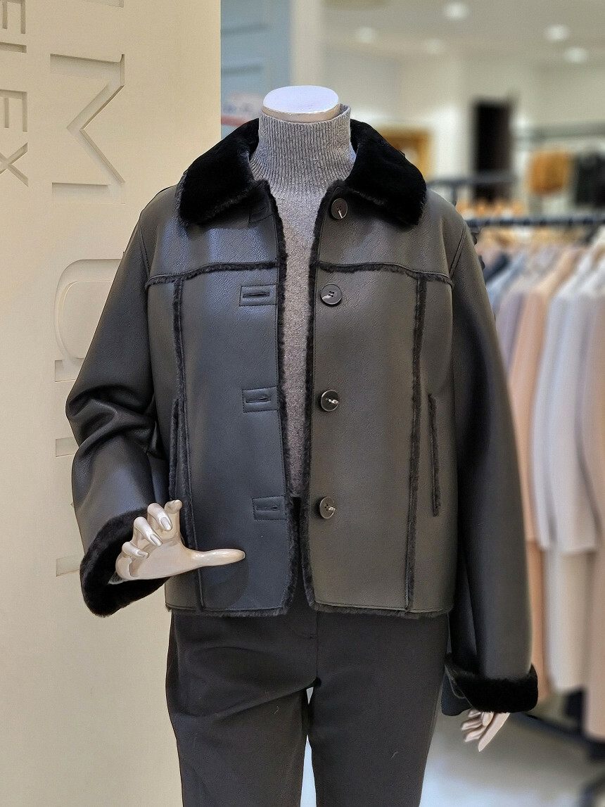 이면 시어링 소재로 칼라와 슬리브 헴 롤업 배색을