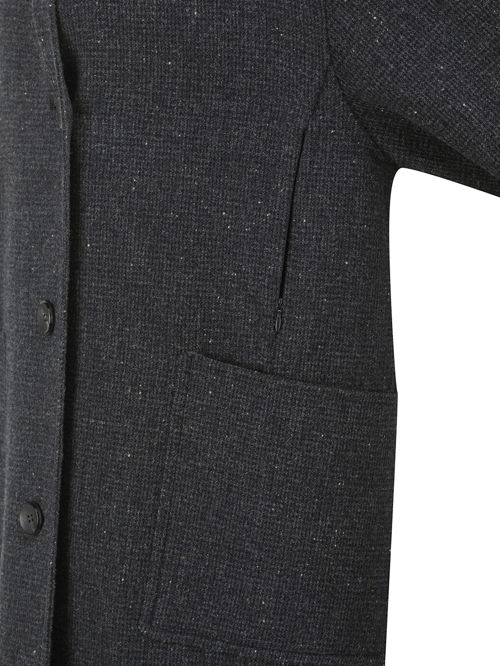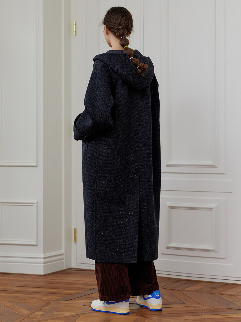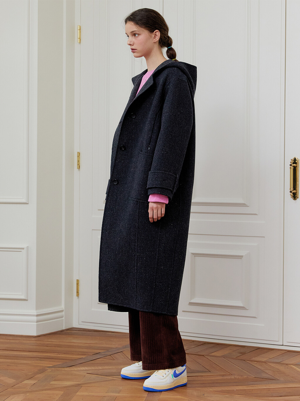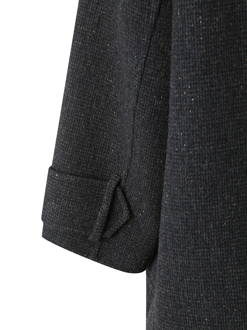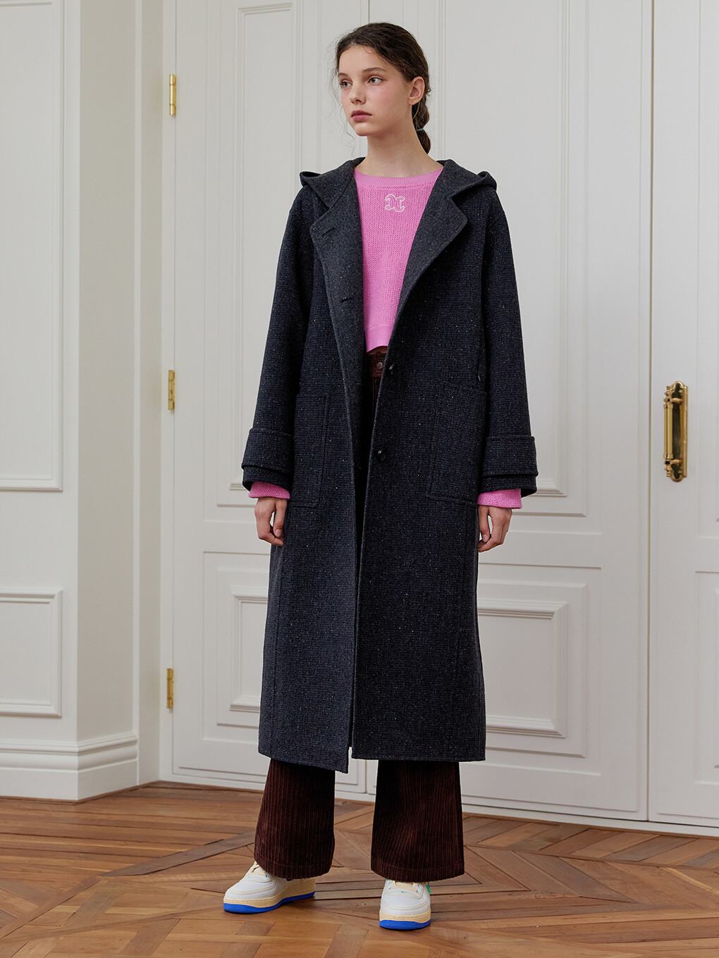무릎을 충분히 덮는 롱 기장감이 돋보이는 핸드메이드 코트입니다.
