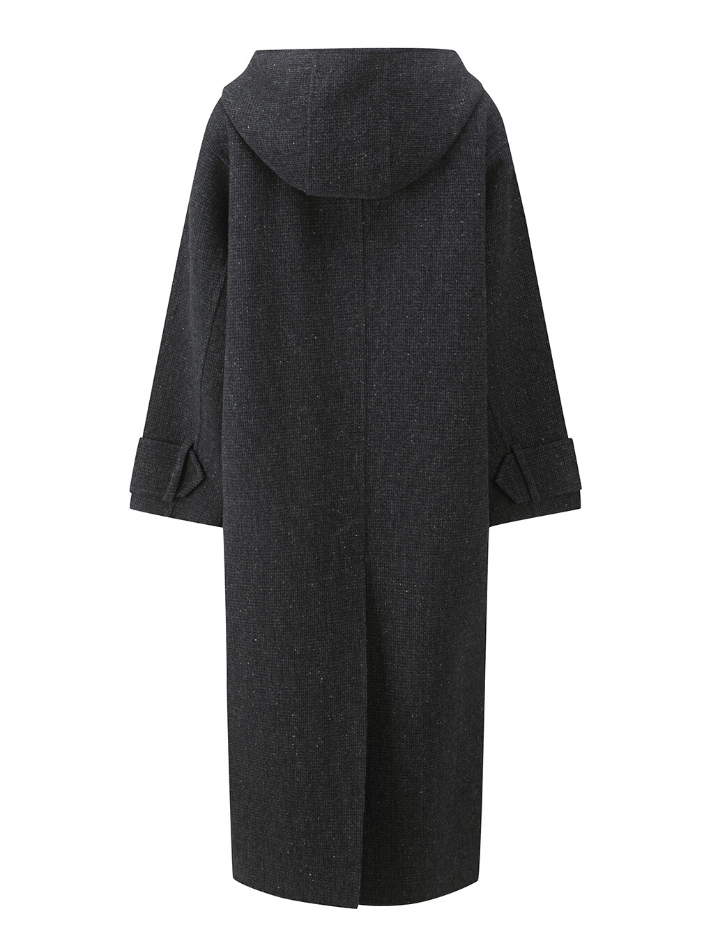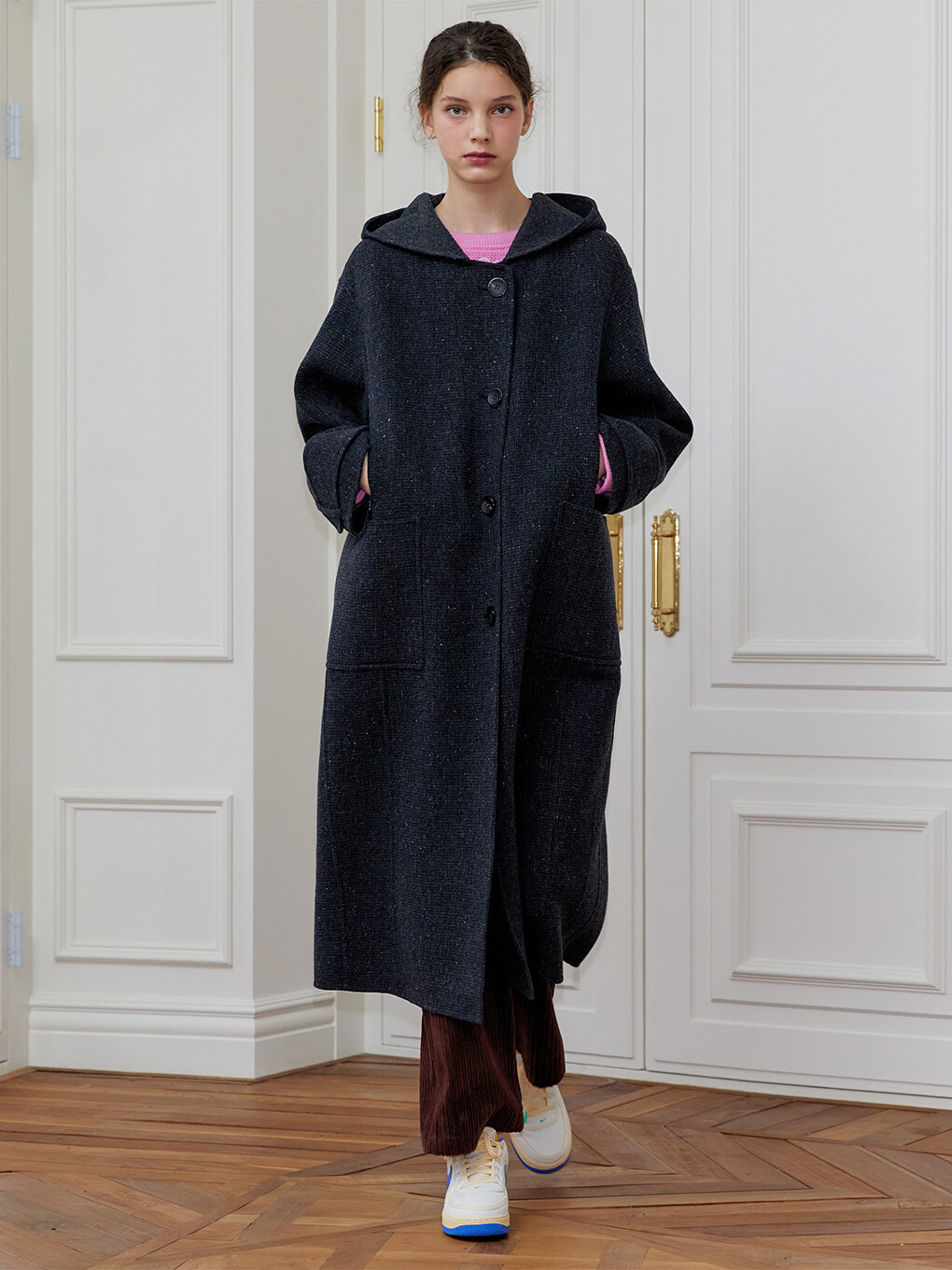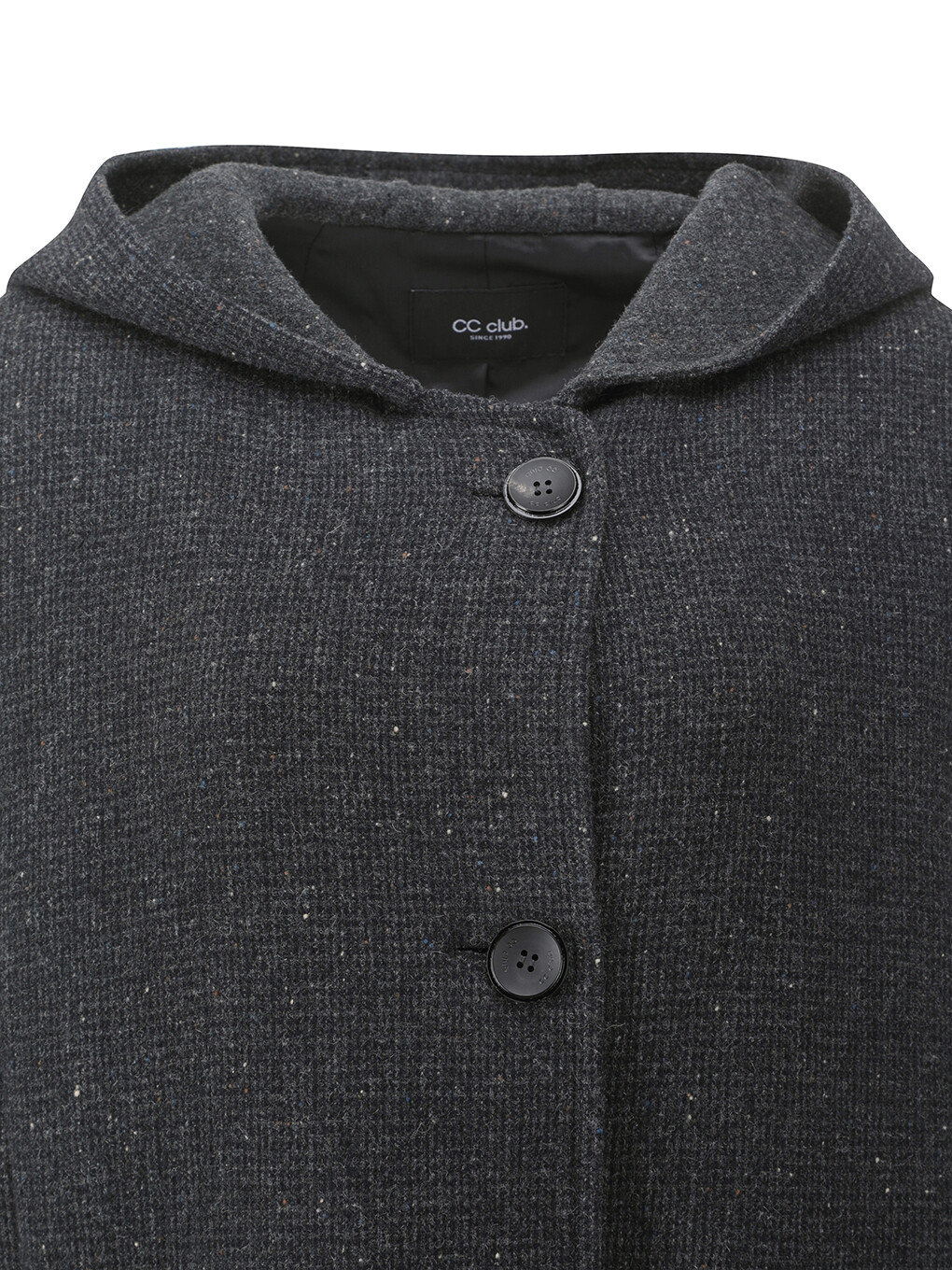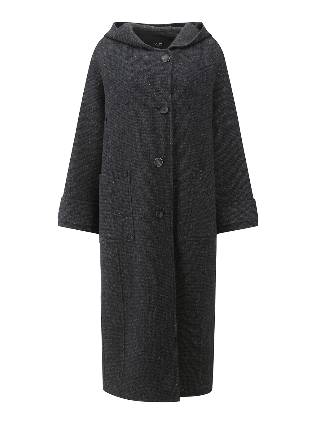 - 싱글 여밈의 박시한 실루엣의 몸판에 후드를 부착하여 캐쥬얼한 느낌을 줍니다.