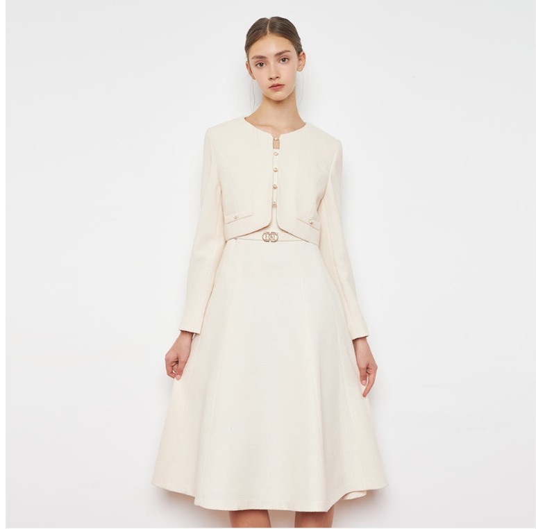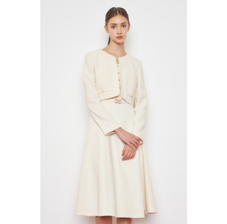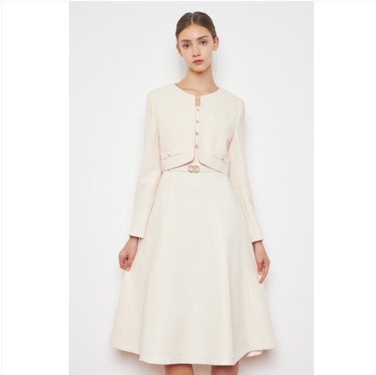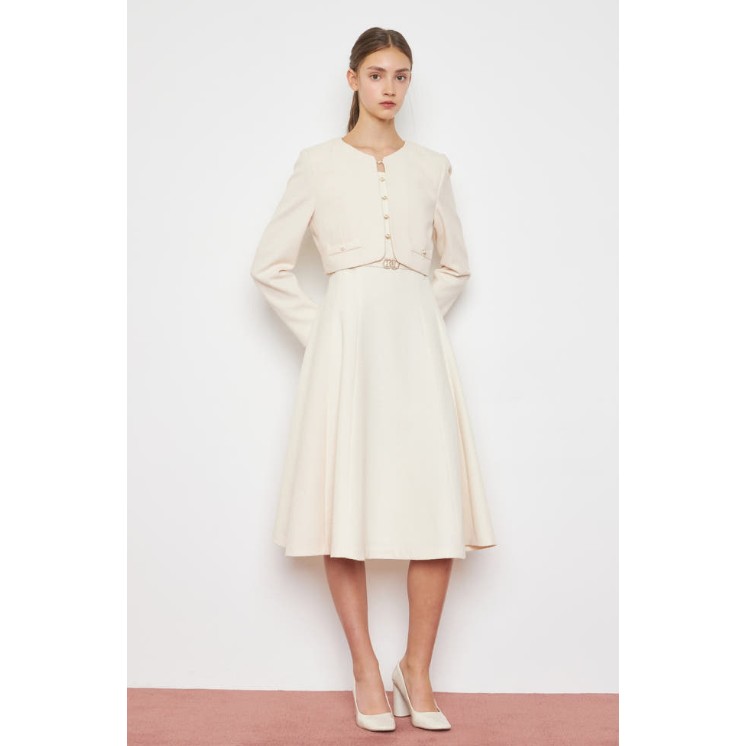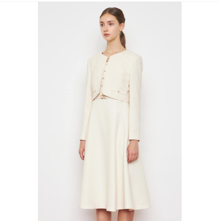 전면의 진주 버튼과 포인트 벨트로 페미닌한 무드를 연출합니다.