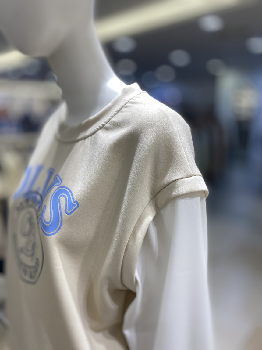 배색 소매 레터링 티셔츠
