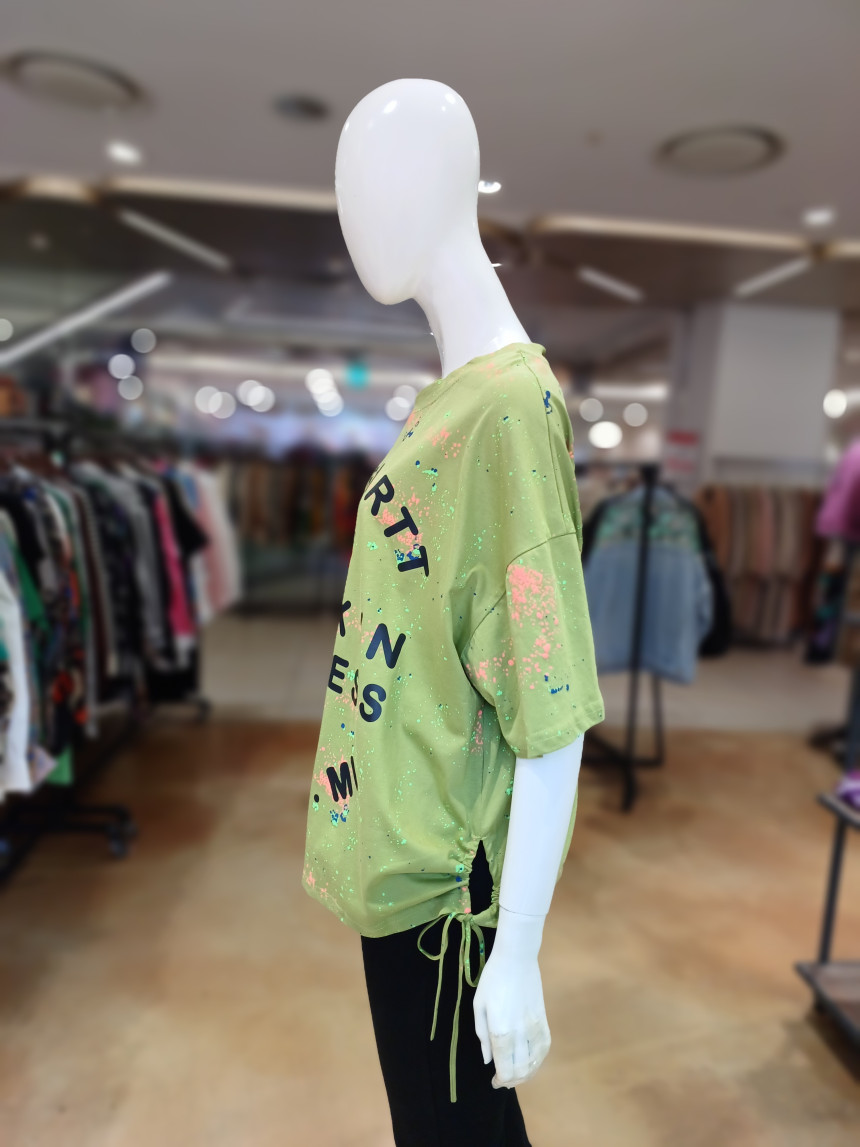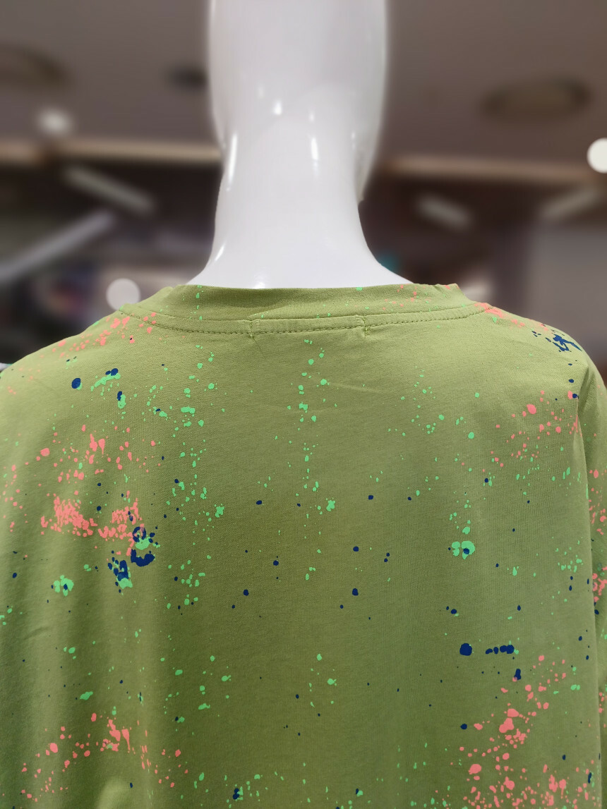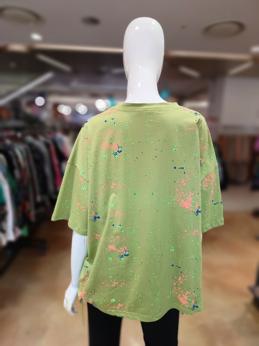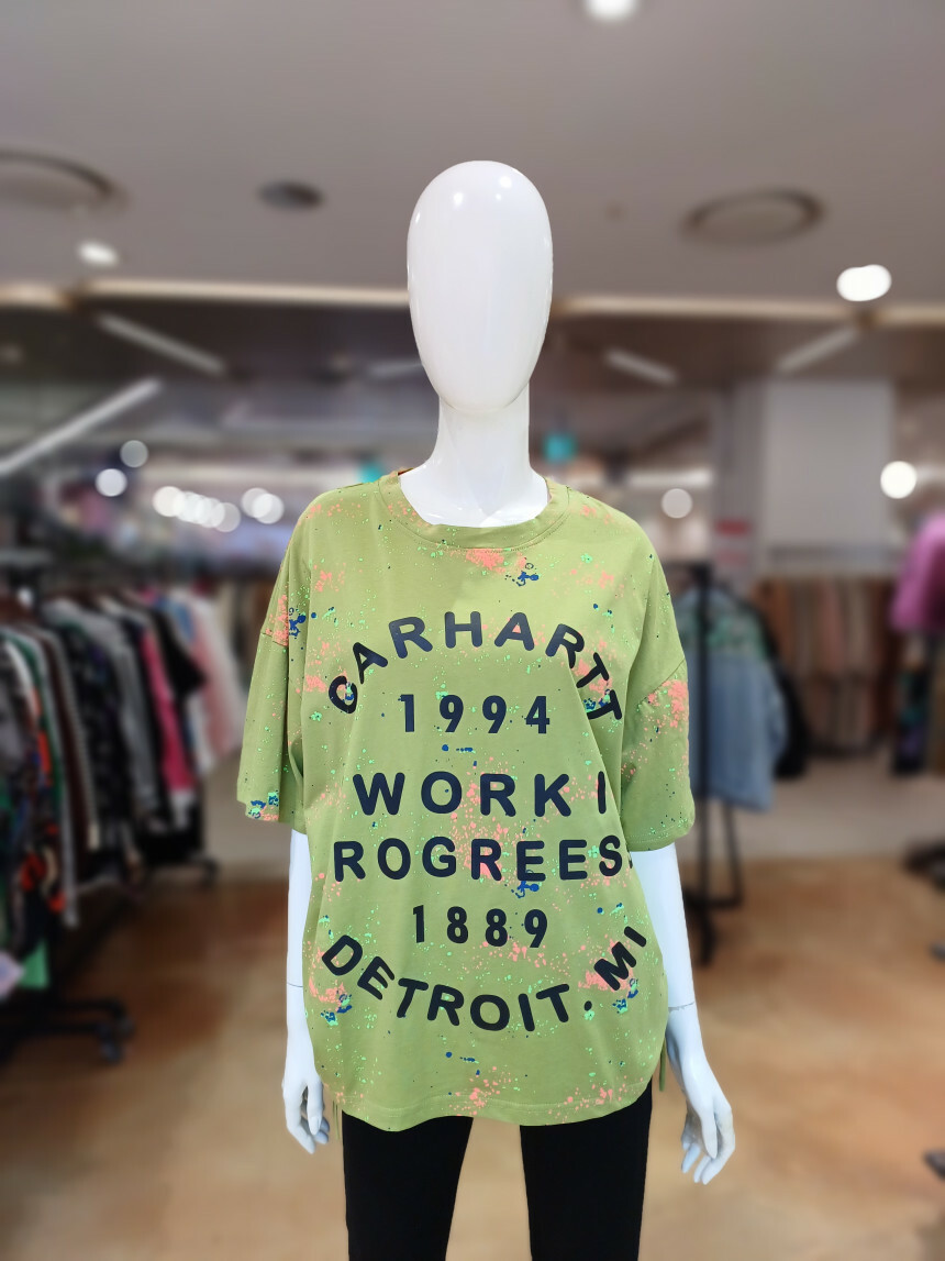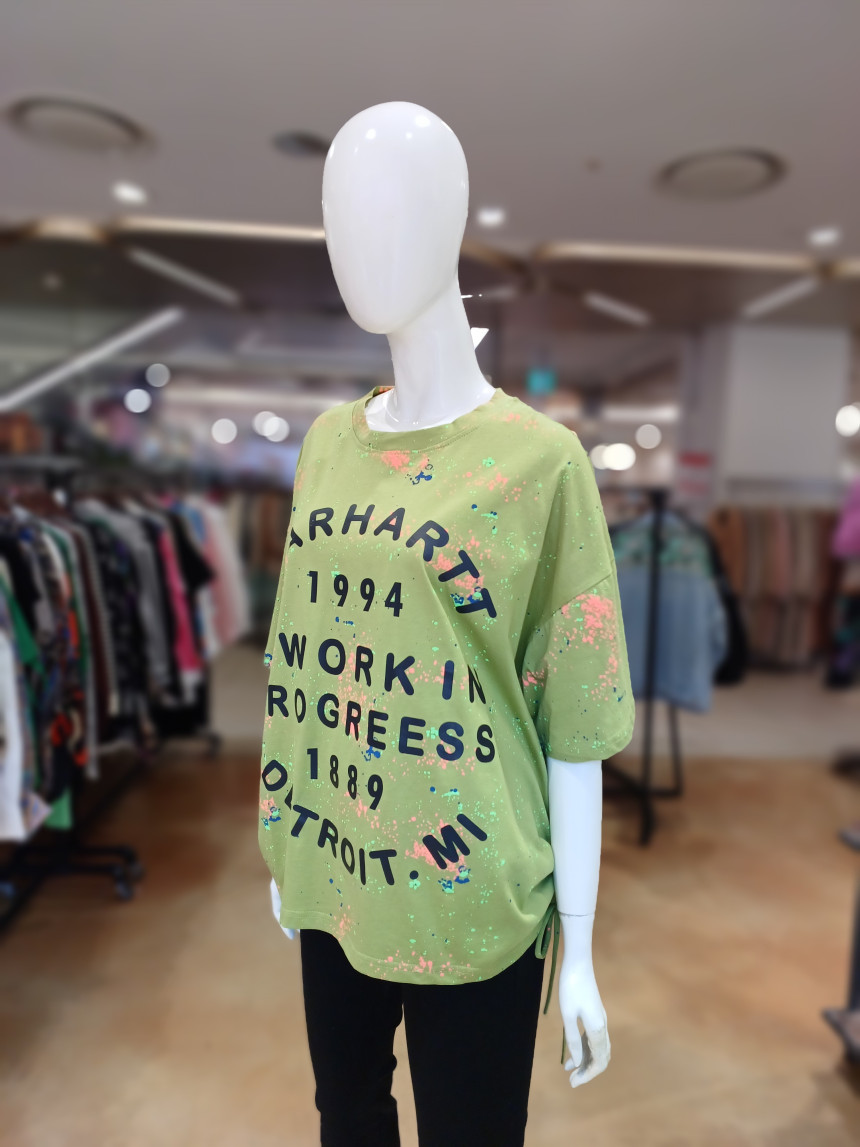 레터링 나염프린트 라운드넥 반팔 티셔츠입니다