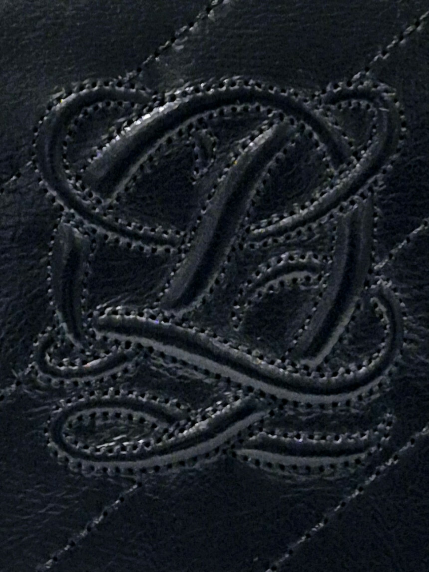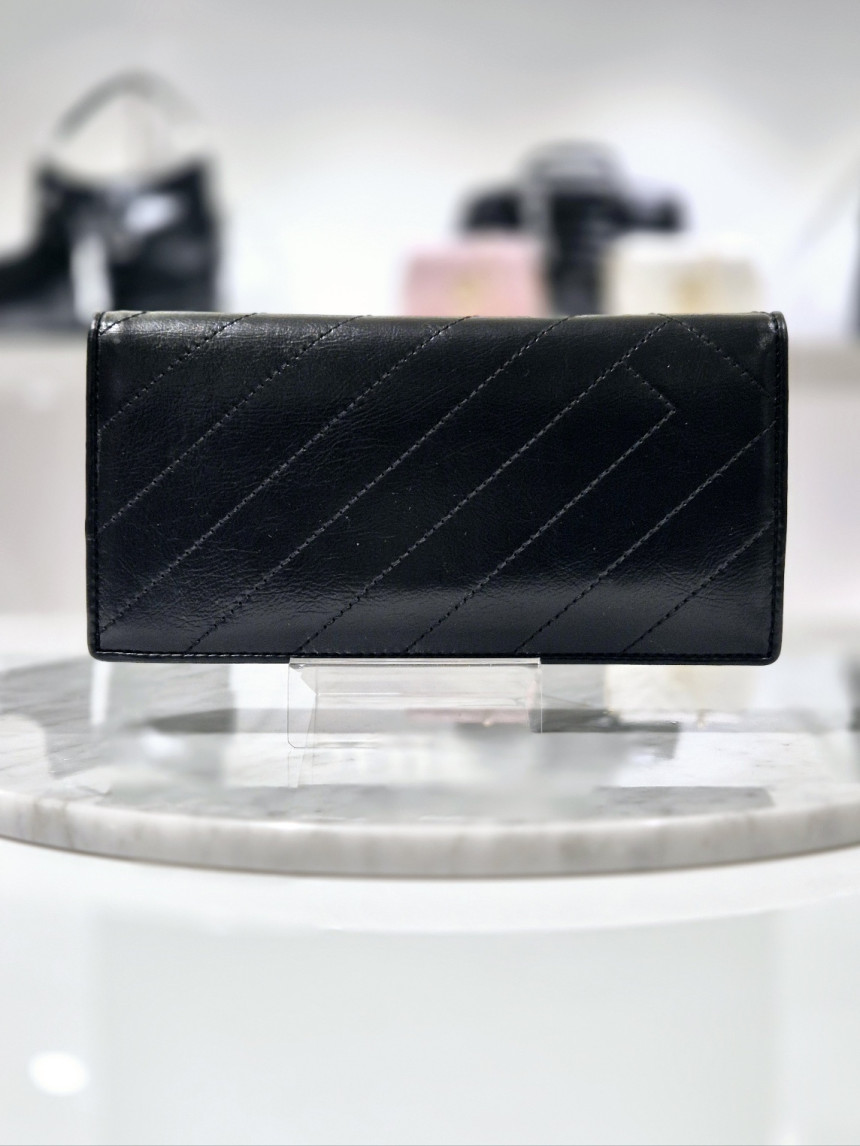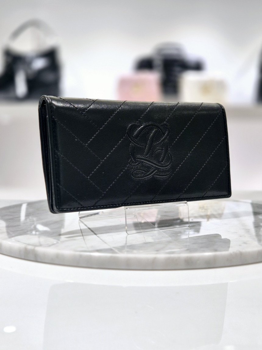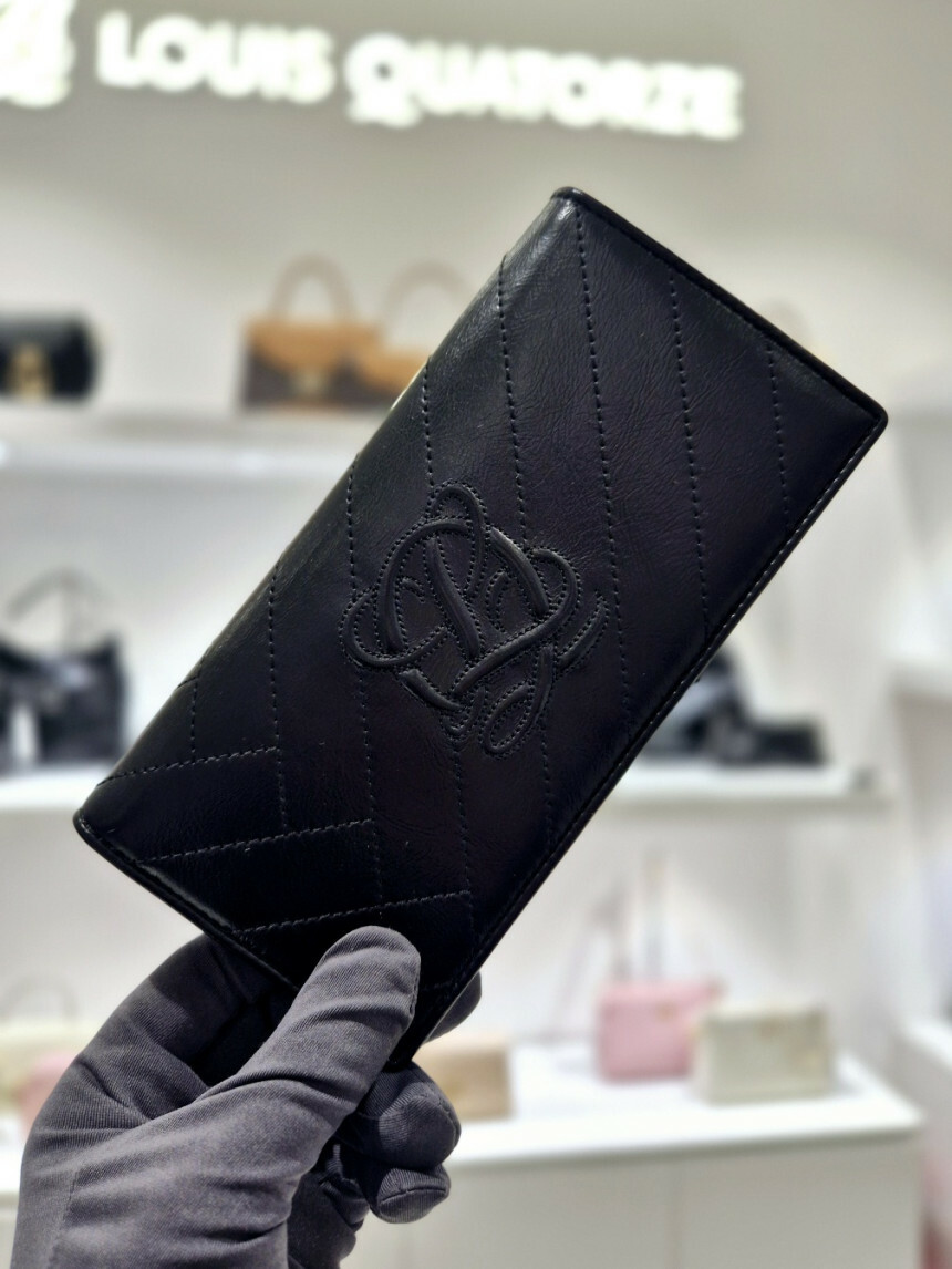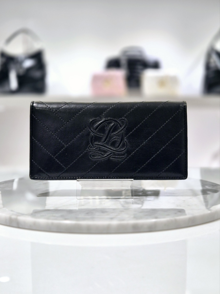 볼륨감있는 심볼 자수가 포인트 되는 페미닉 무드의 크랙 소재 장지갑.