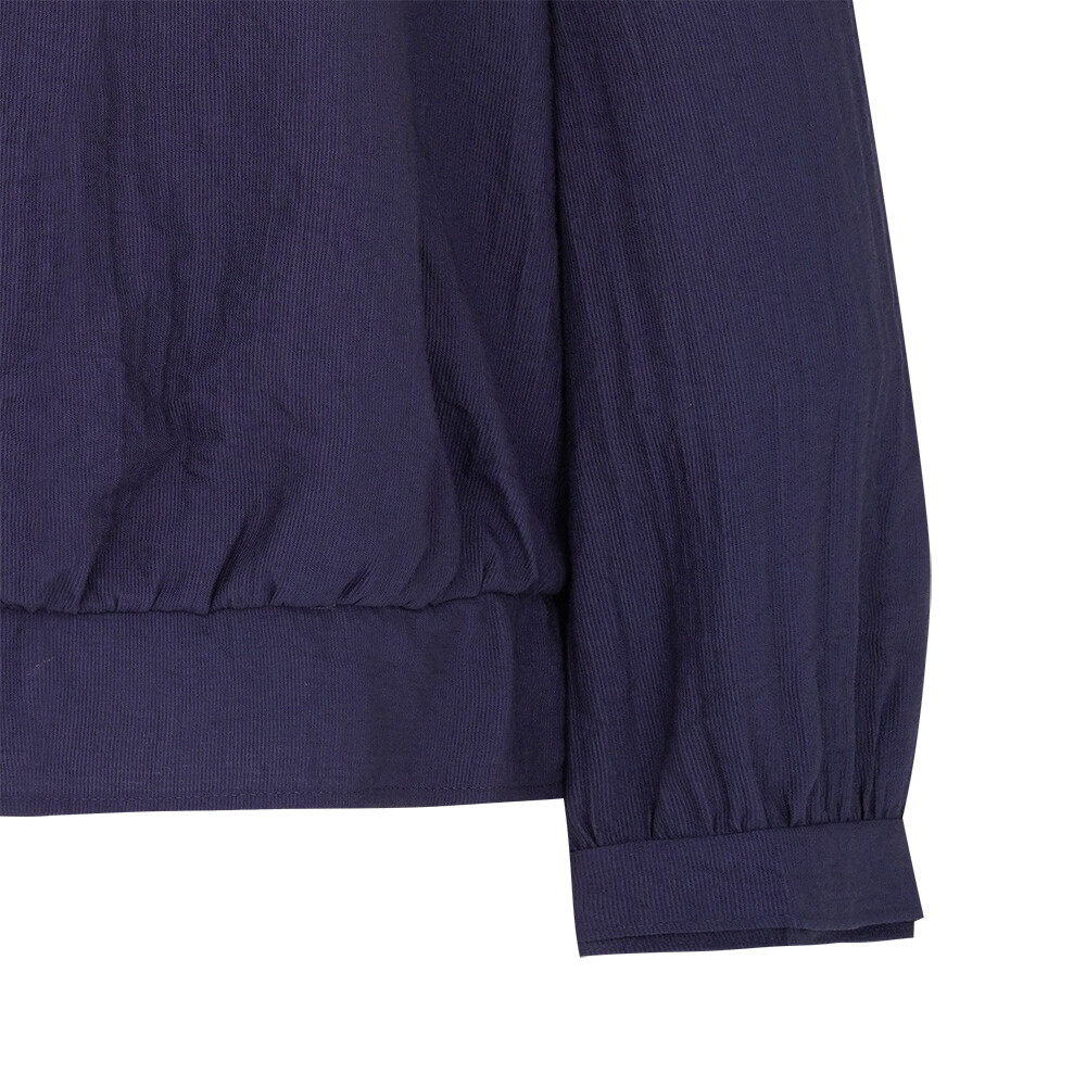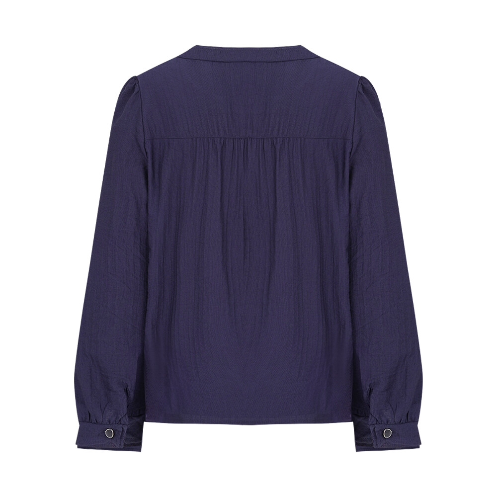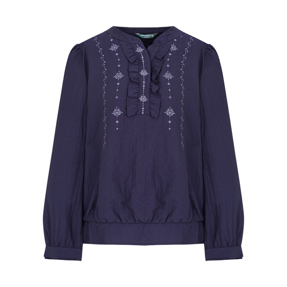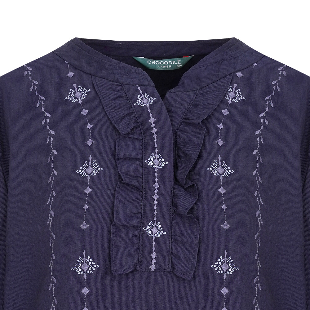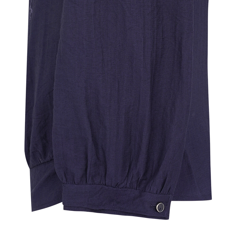 CLDFBL104 솔리드 버전. 몸판과 하프 플라켓의 자수로 에스닉한 무드의 풀오버 블라우스입니다. 블루종 디테일로 허리를 한 번 잡아주었습니다. 오픈넥 카라와 하프 플라켓의 셔링 디테일로 포인트를 주었습니다.