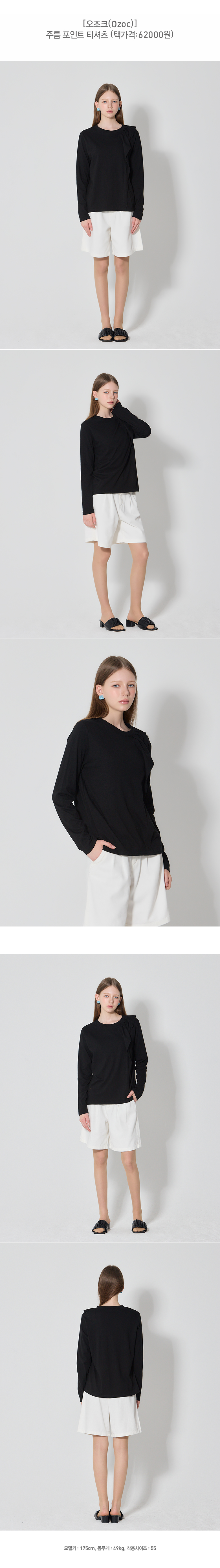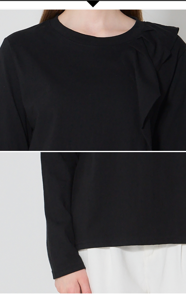 어깨선부터 내려오는 주름 프릴 디테일이 유니크한 티셔츠입니다.