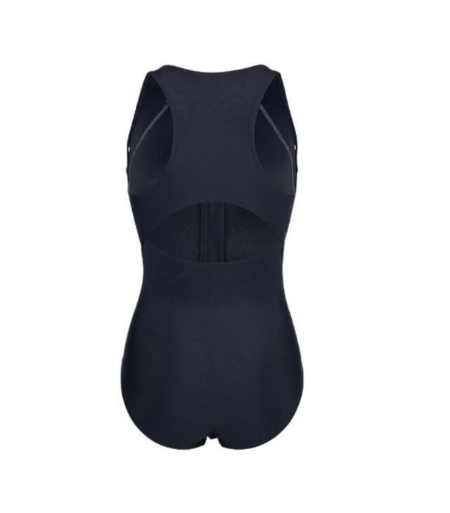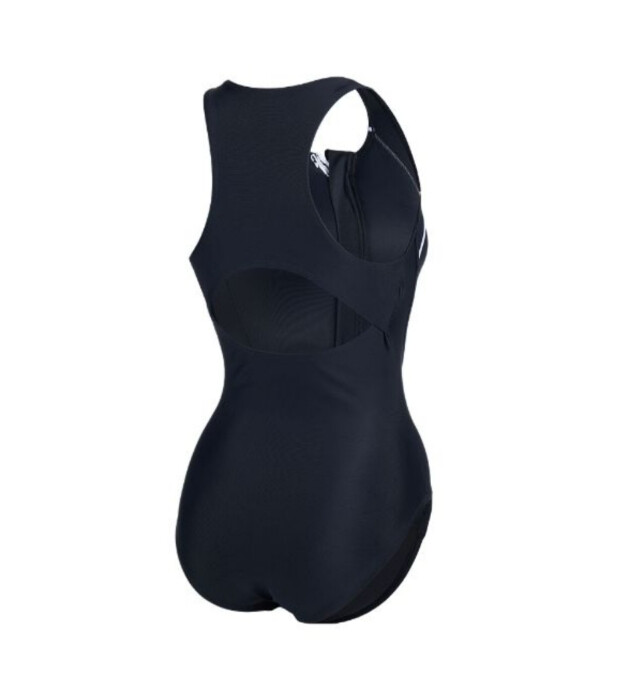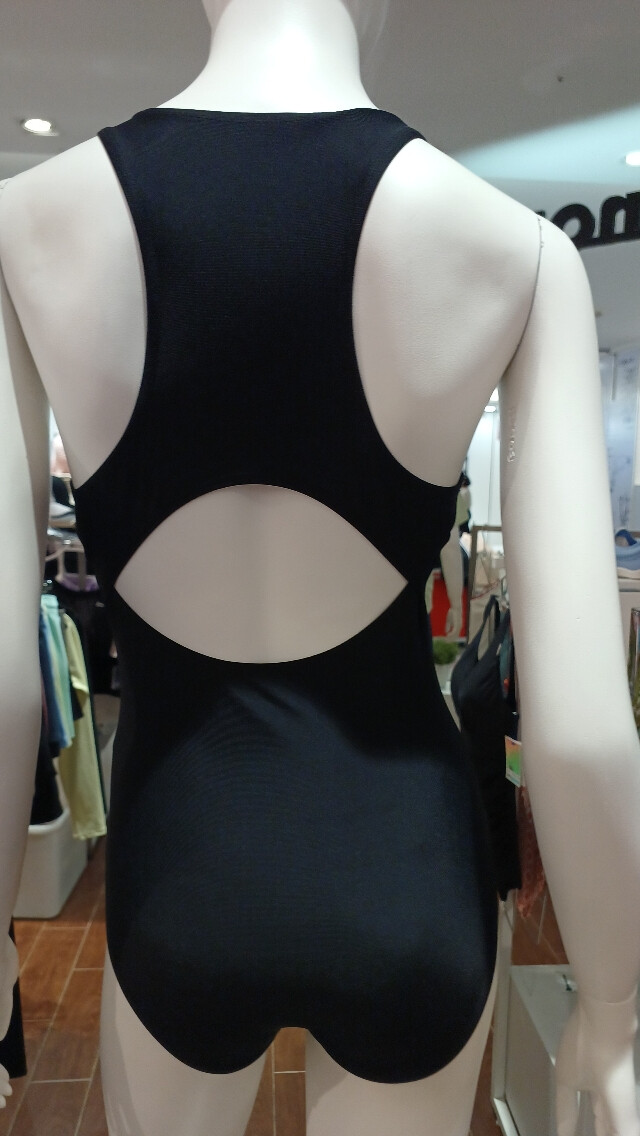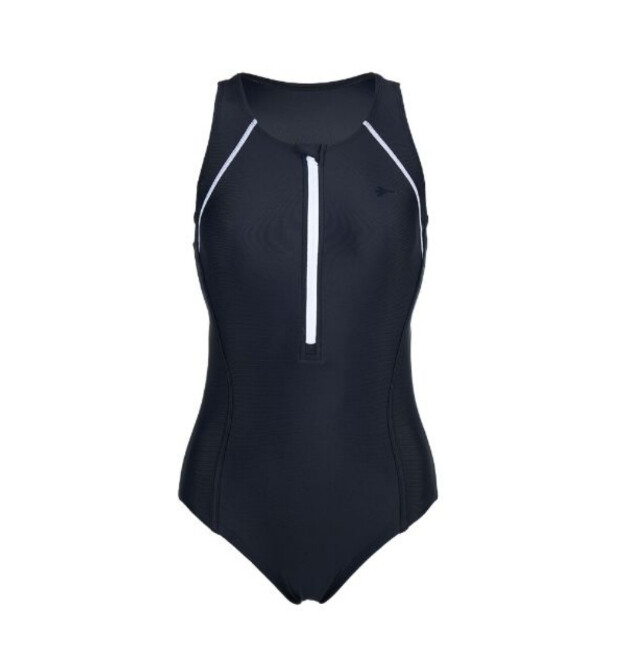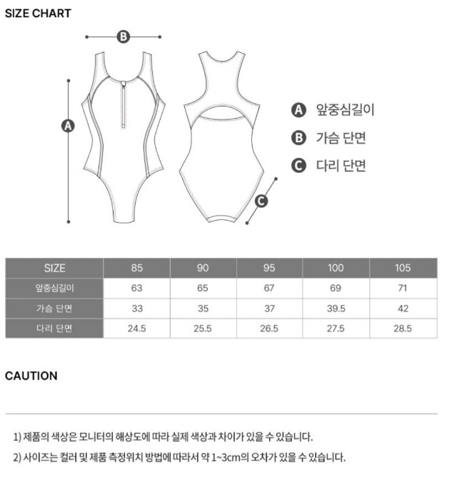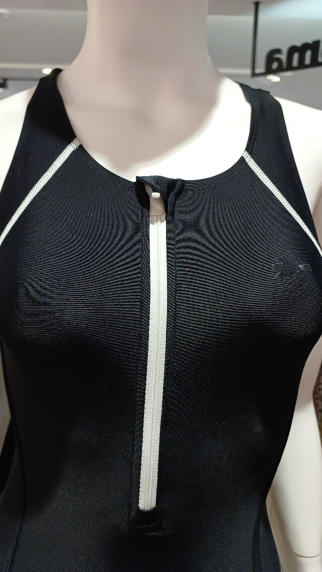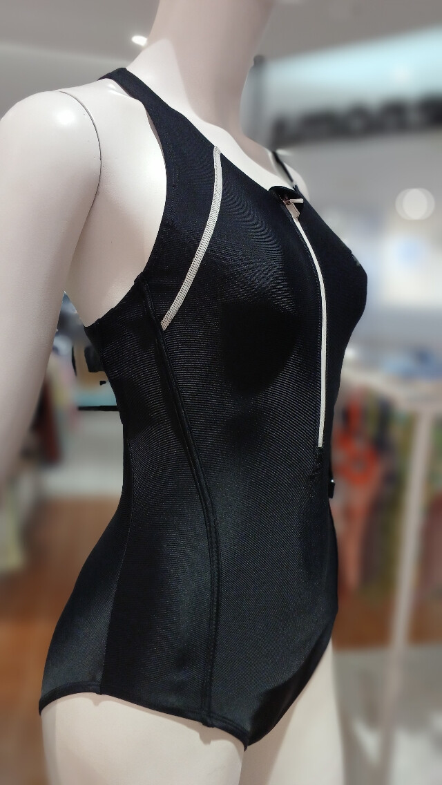 앞지퍼 포인트가 있어 착용하기 편하고 탄탄한 착용 감과 변형된 백 라인 여성 실내 원피스 수영복입니다.