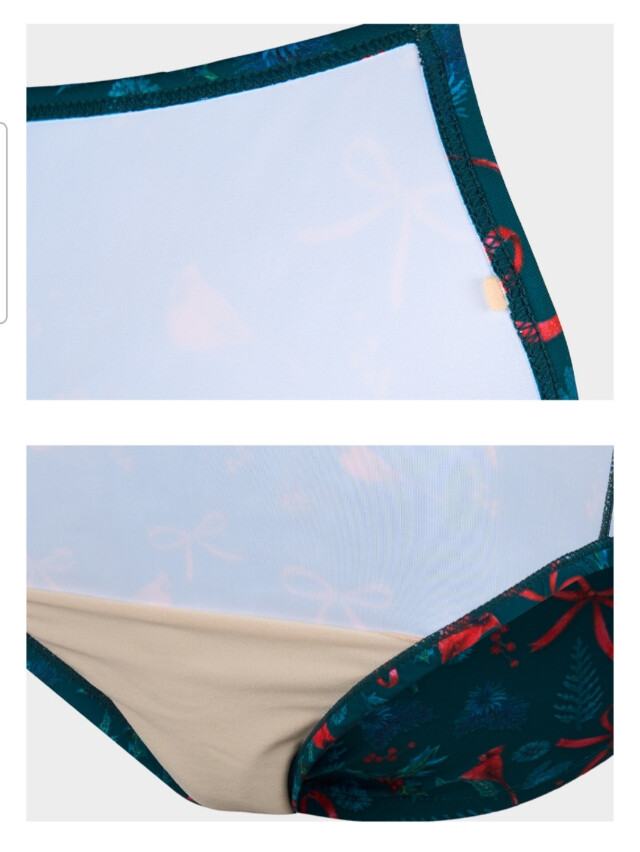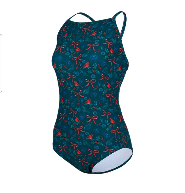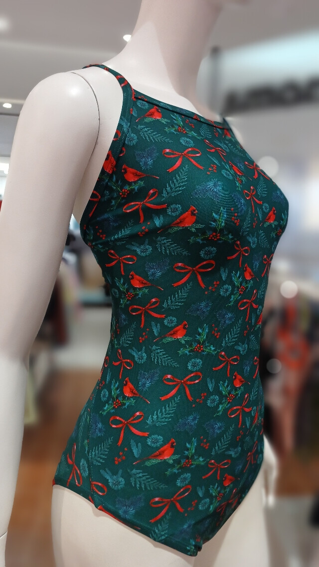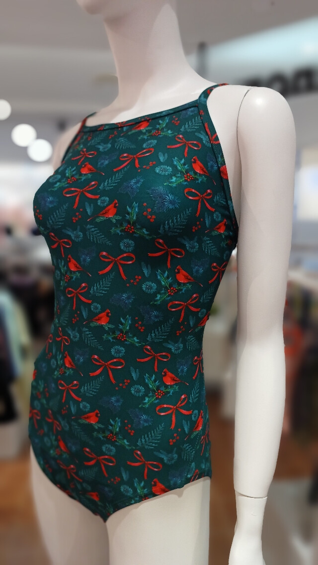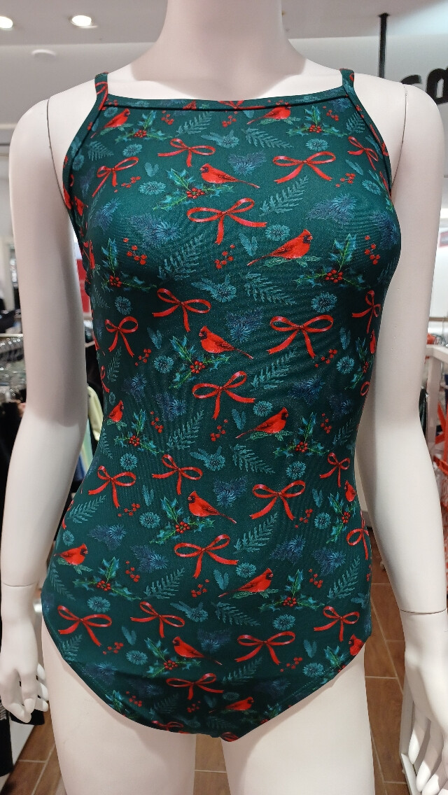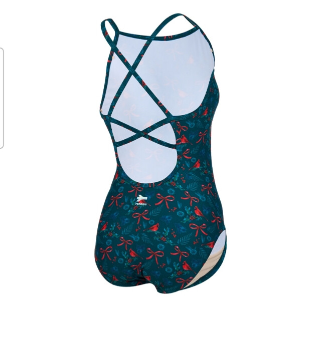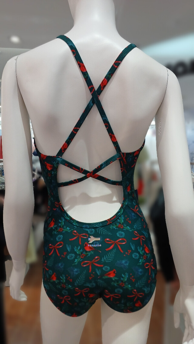 홀리데이 에디션 라인으로 다크 그린 바탕에 리본프린트가 돋보이는 X백 더블 스트랩의 미들컷 실내수영복입니다.