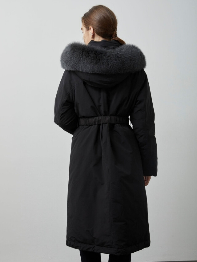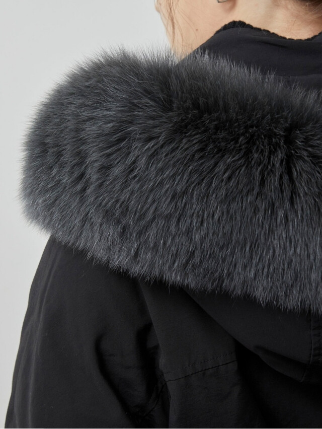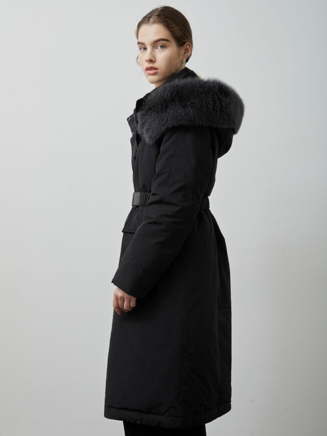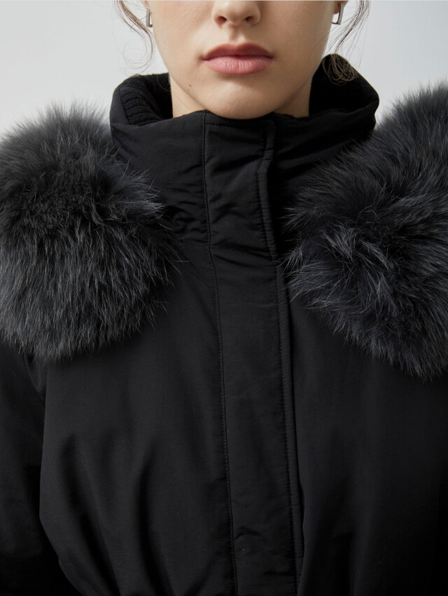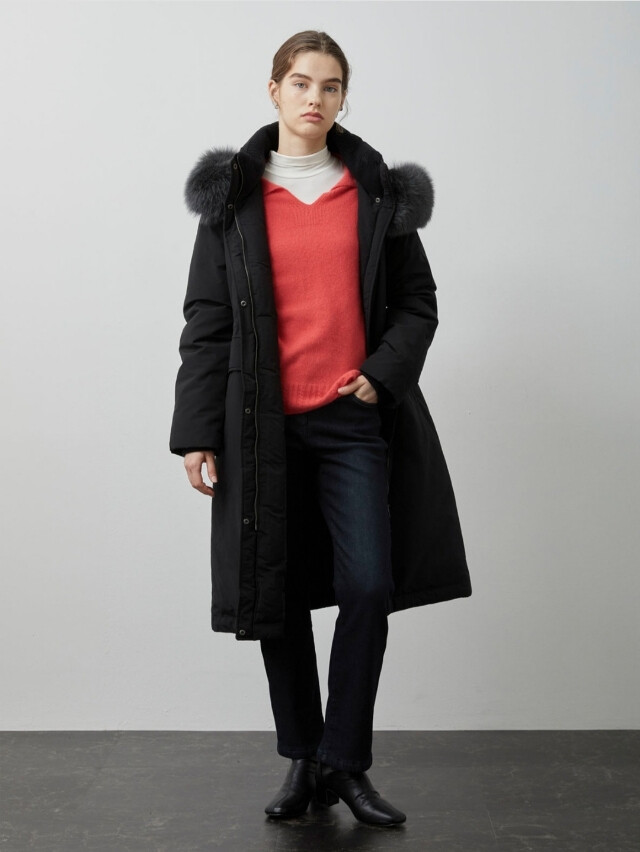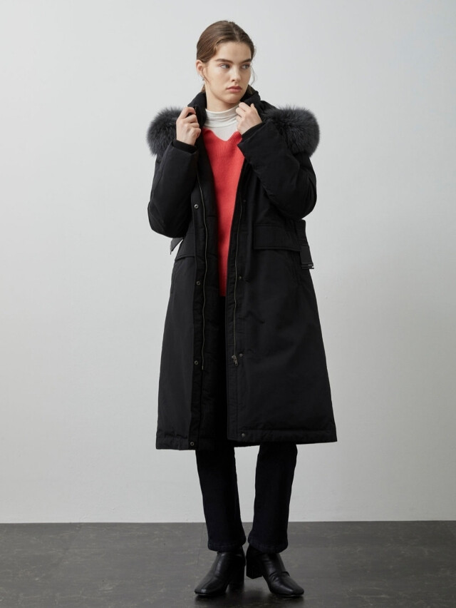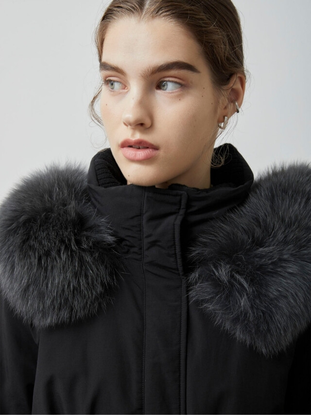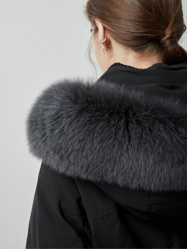 보온성을 높였으며 탈부착 가능한 폭스퍼 디테일을
