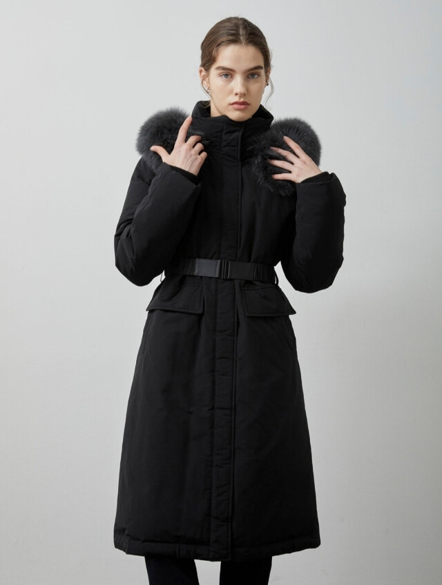패치하여 고급스러움을 더한 후두 롱 다운 점퍼