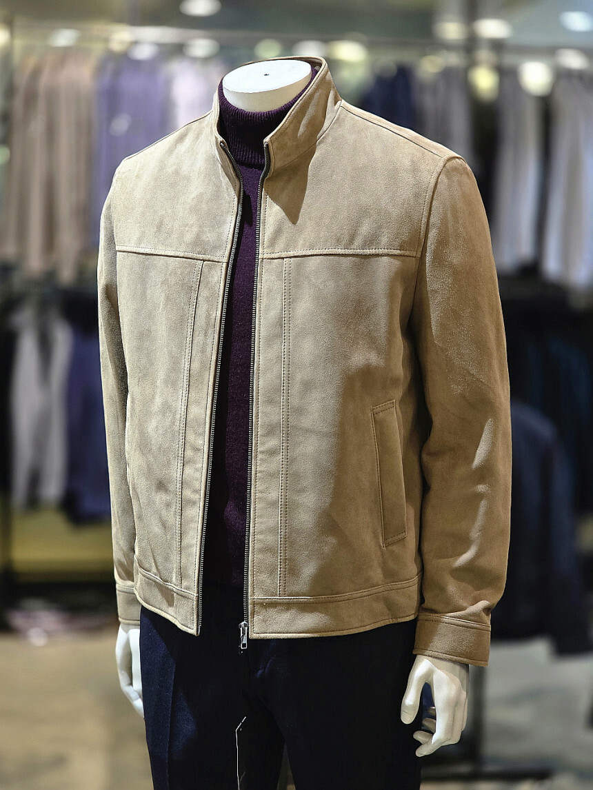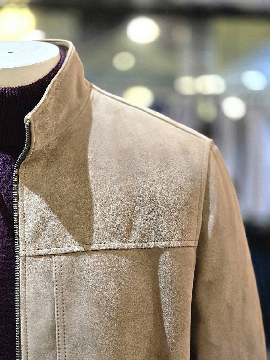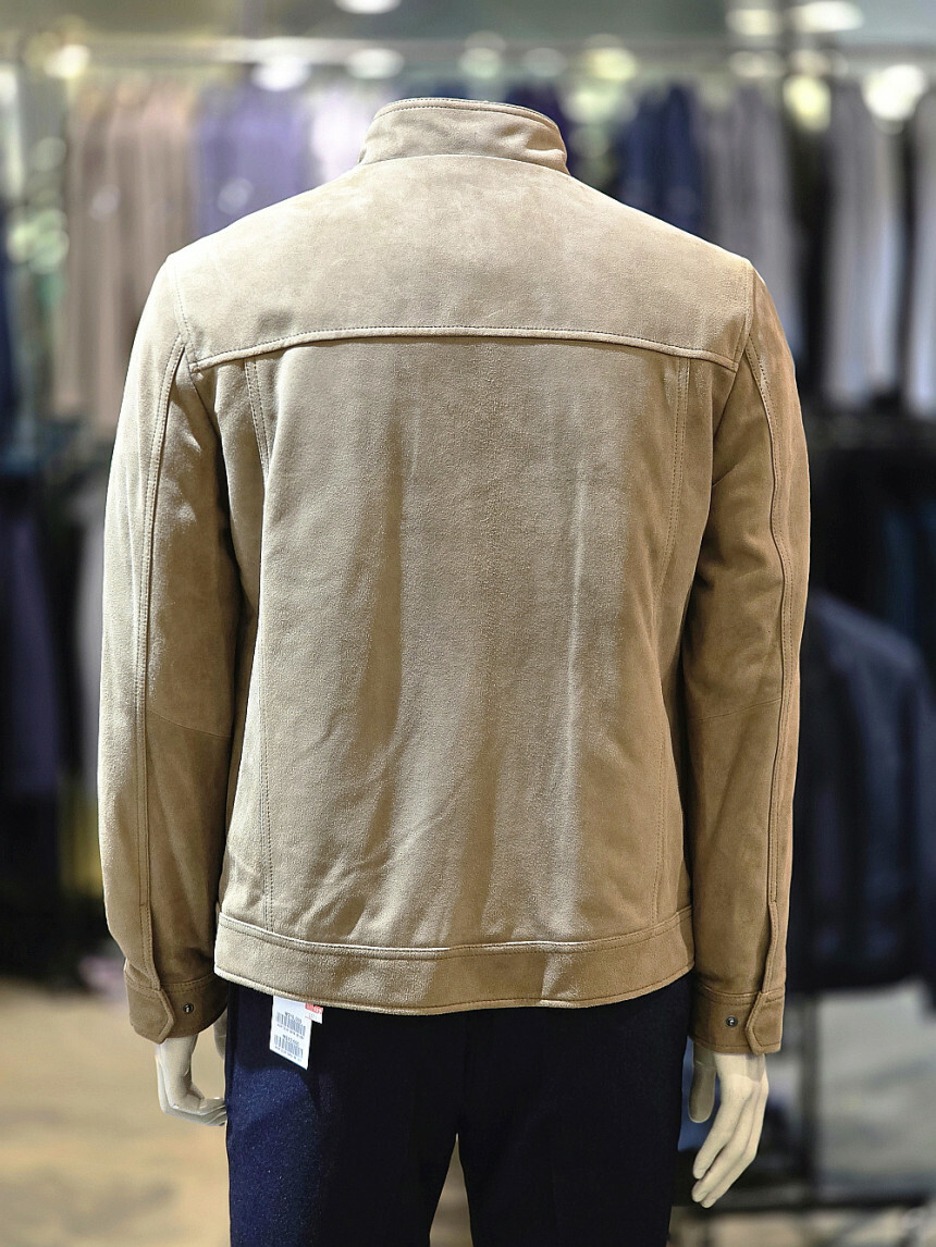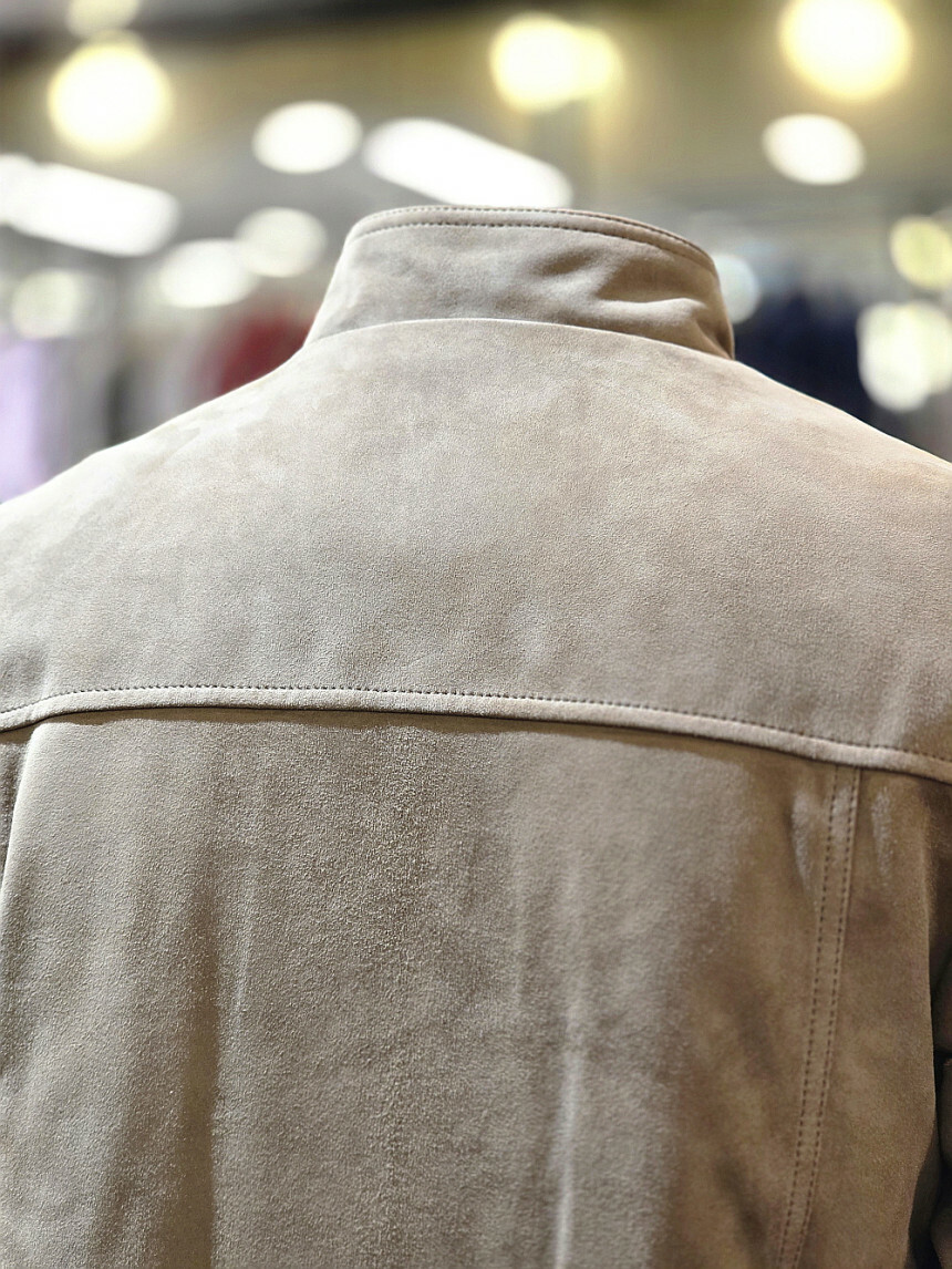 천연 염소가죽(스웨이드)으로 제작된 고급스러운 스탠카라 재킷입니다.