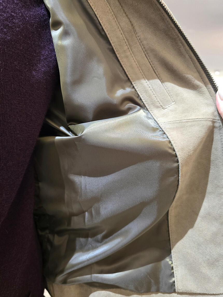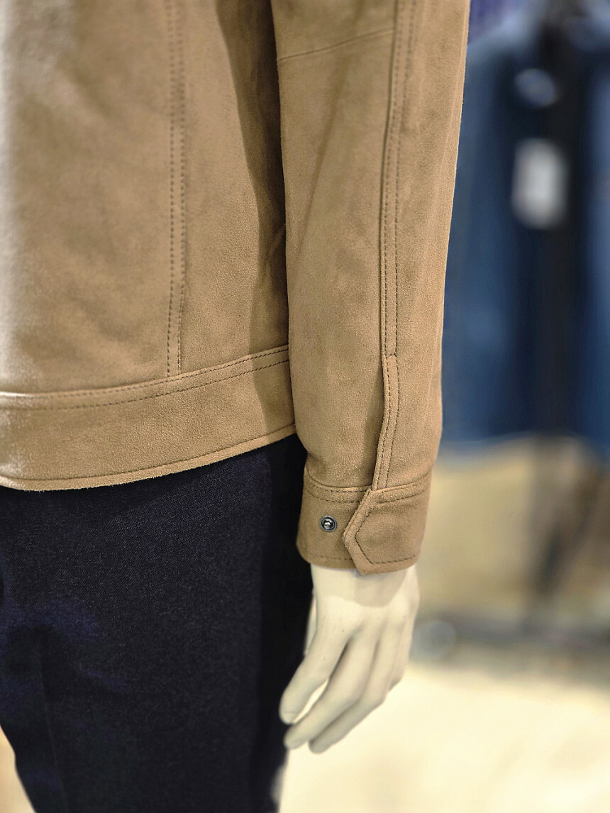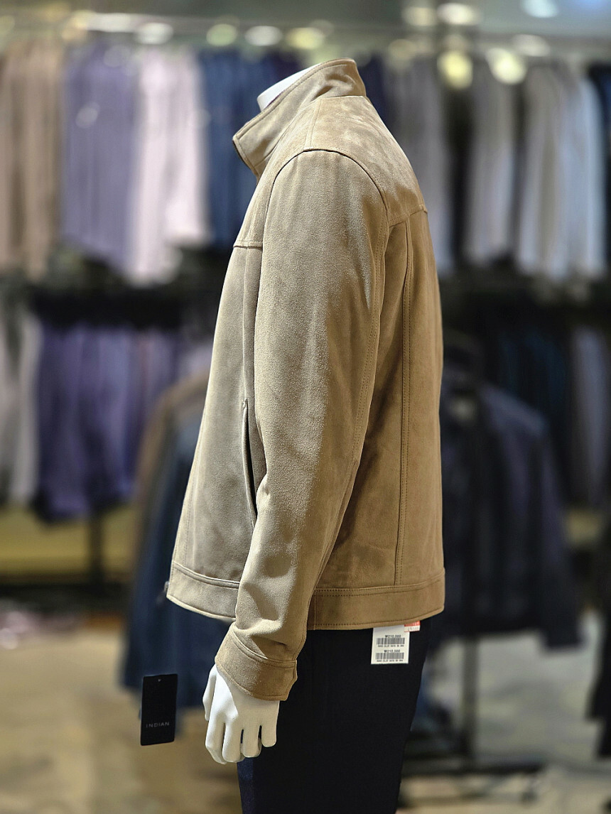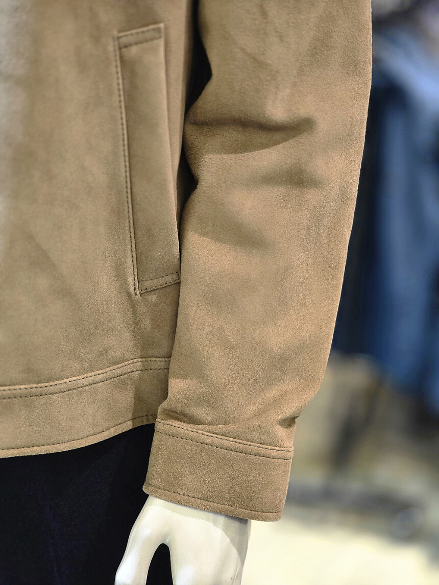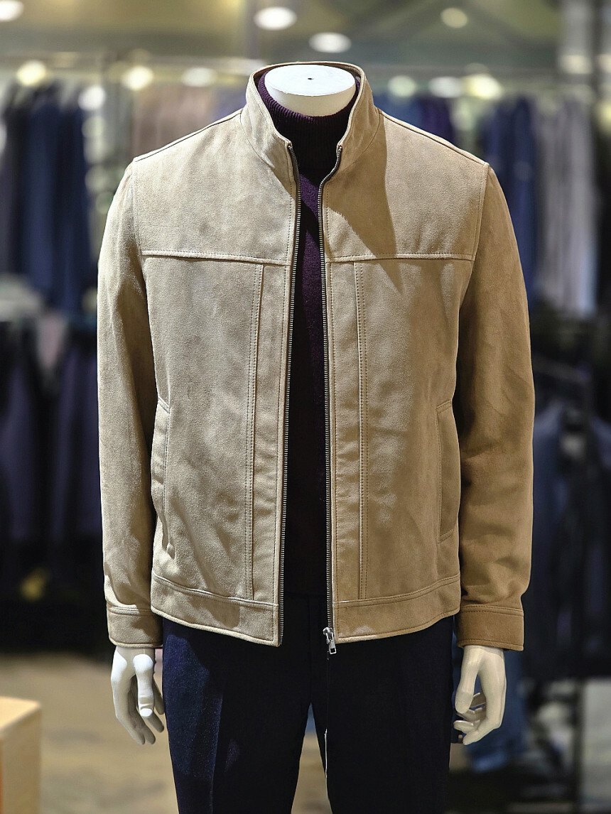 천연 염소가죽(스웨이드)으로 제작된 고급스러운 스탠카라 재킷입니다.
