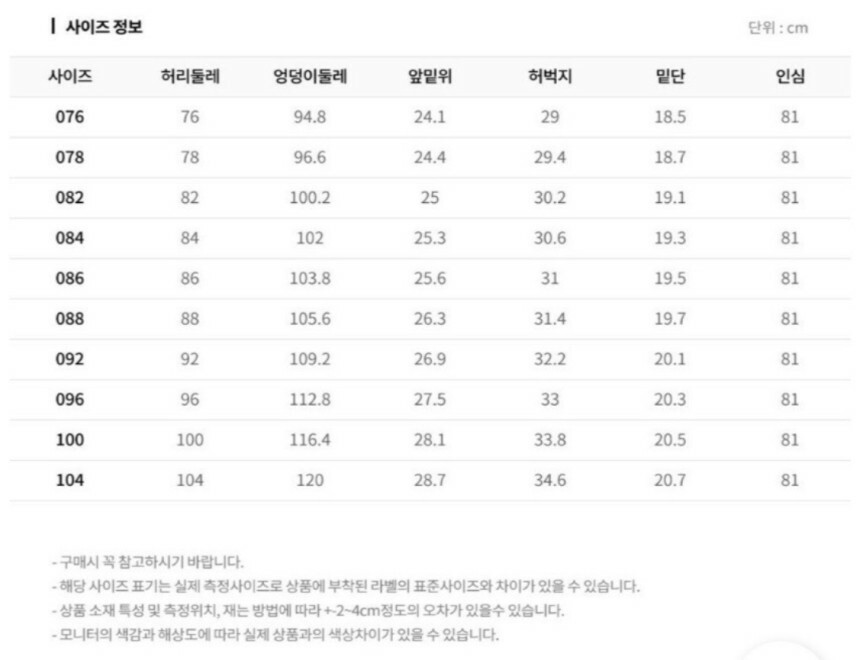 사이즈 : 074(29) 076(30) 078(31) 082(32) 084(33) 086(34) 088(35) 092(36) 096(38) 100(39) 104(41)