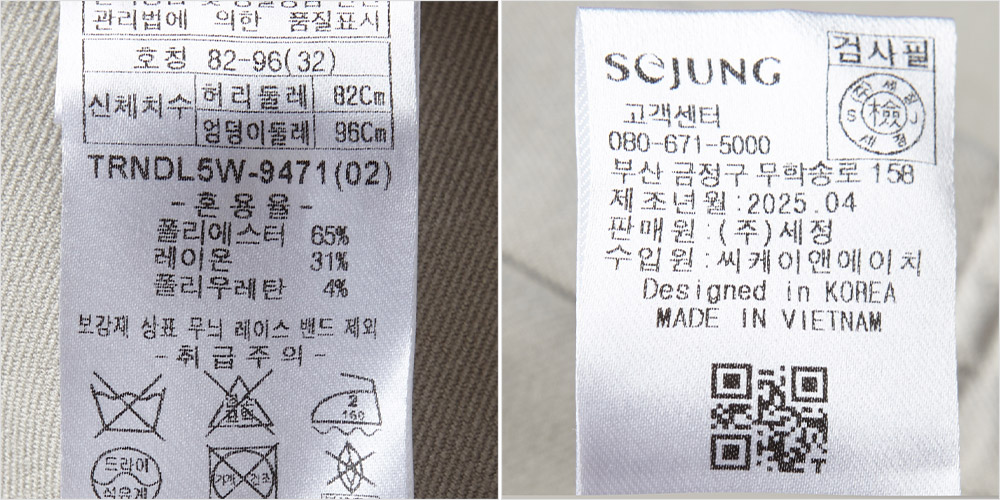 제품소재 : 폴리에스터65%, 레이온31%, 폴리우레탄4%