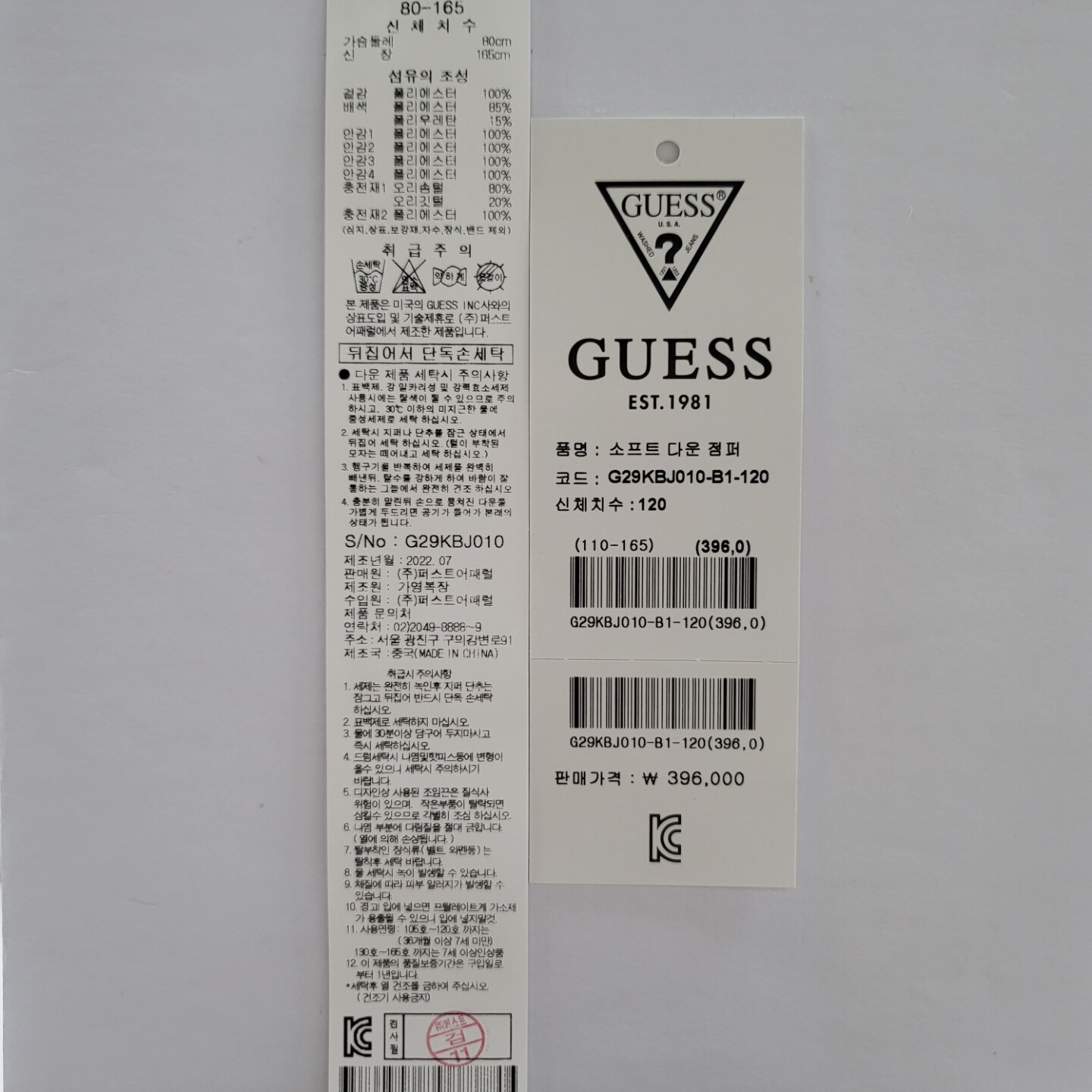 * 혼용율: 겉감 : 폴리에스터 100% 배색 : 폴리에스터 85% 폴리우레탄 15% 안감1 : 폴리에스터 100% 안감2 : 폴리에스터 100% 안감3 : 폴리에스터 100% 안감4 : 폴리에스터 100% 충전재1 : 오리솜털 80% 오리깃털 20% 충전재2 : 폴리에스터 100%