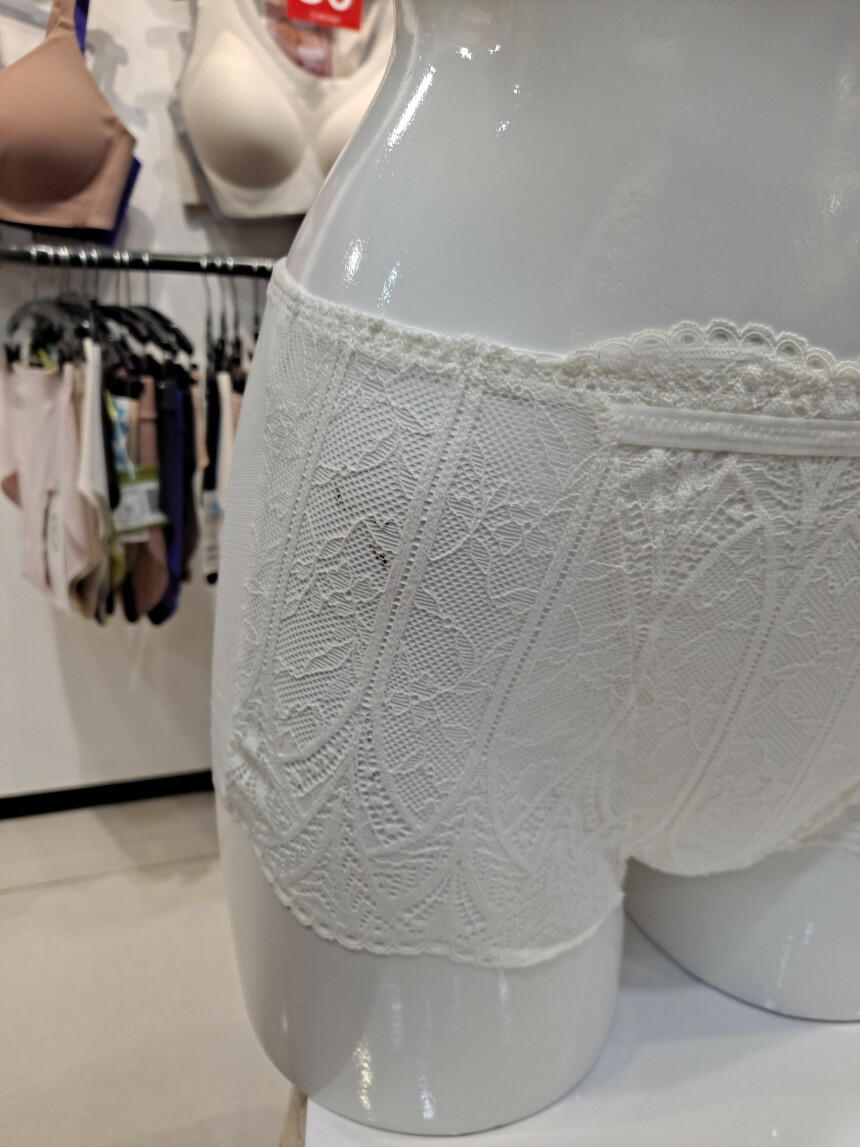 뒷판 중앙 레이스와 PN망을 매치하여 여성스러움을 강조하고 하이웨스트 스타일의 팬티 로