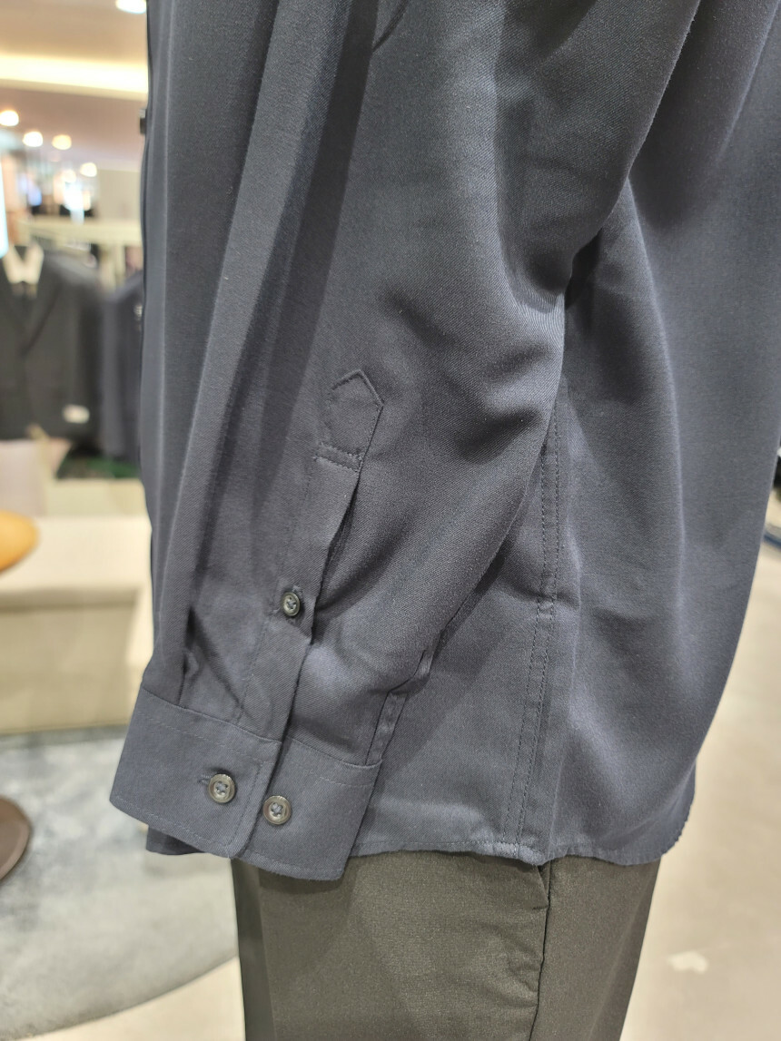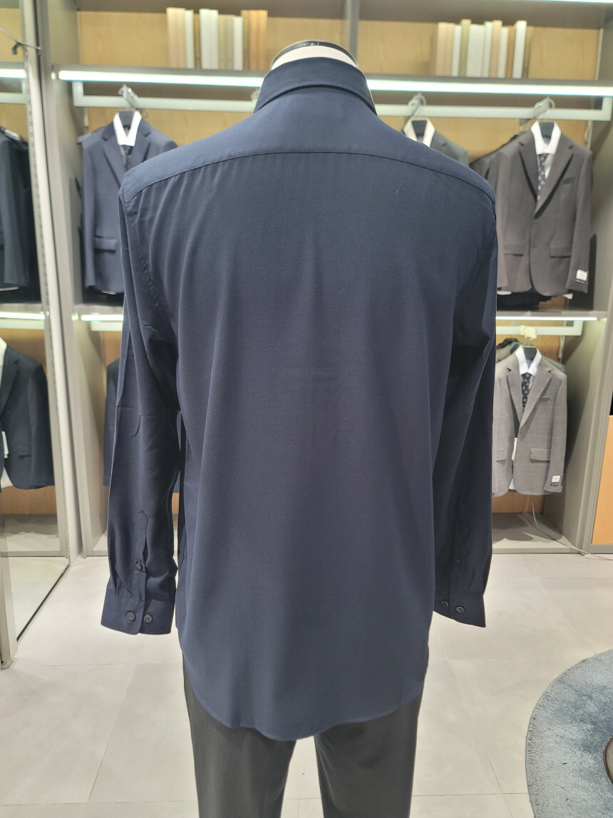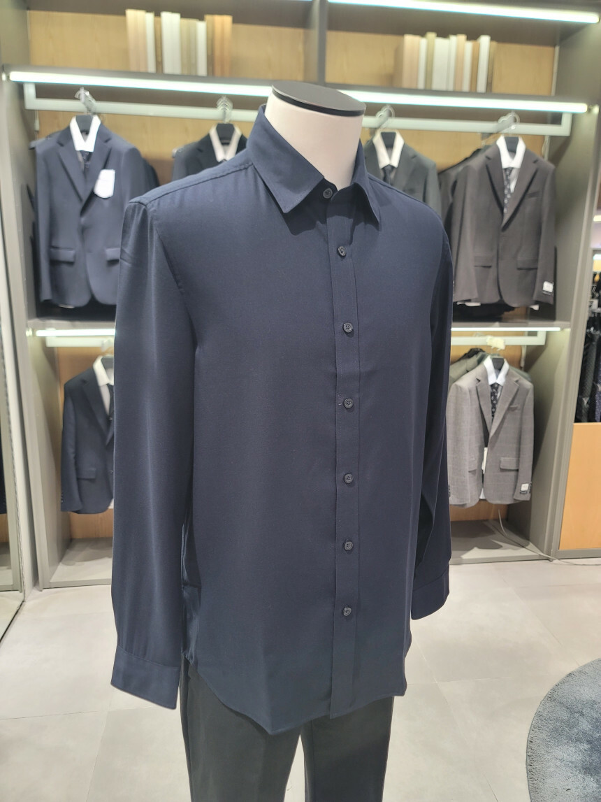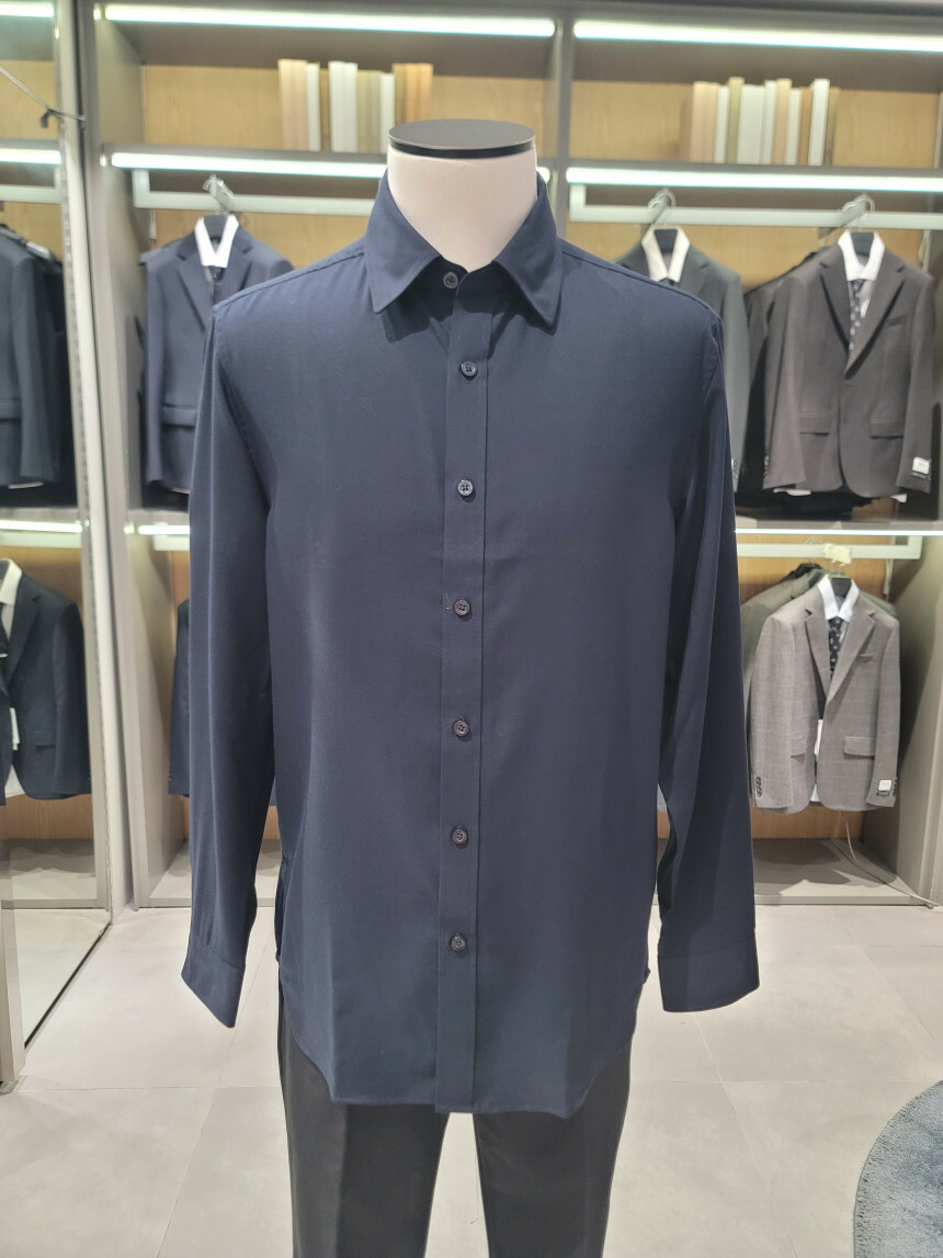구김이 없고 관리가 쉬운 폴리, 레이온 혼방 소재의 베이직 핏 셔츠.