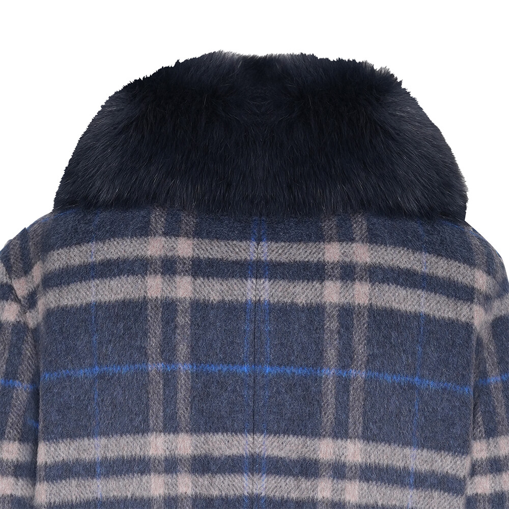 체크 무늬에 알파카 코트입니다. 폭스 퍼가 고급 스럽게 탈부착 되며 스탠 카라에 슬림한 실루엣에 싱글 코트입니다.