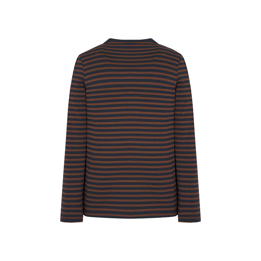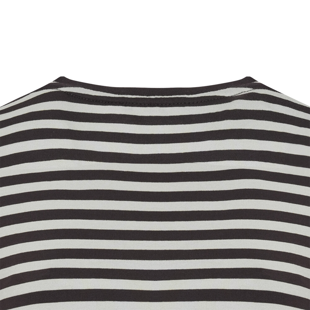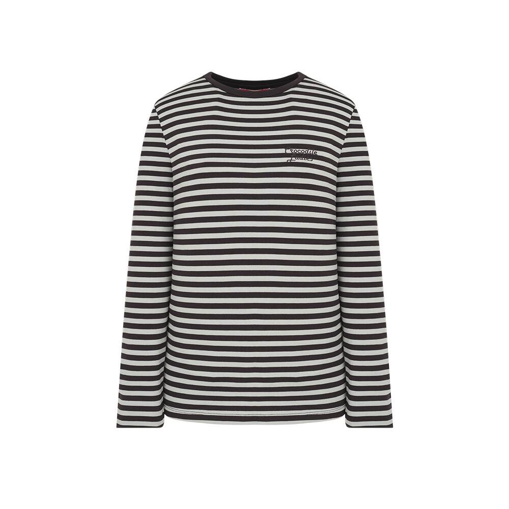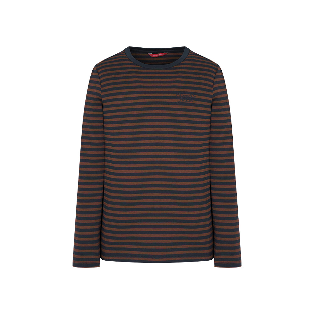 T/R MVS 소재로 부드러우며 전판 선염 스트라이프에 앞판 가슴의 로고레터링 프린트가 포인트인 라운드 티셔츠