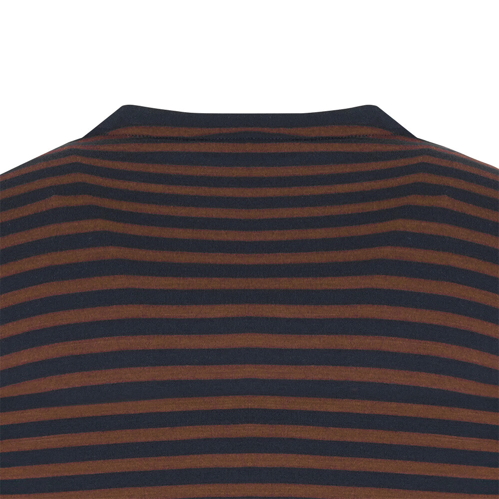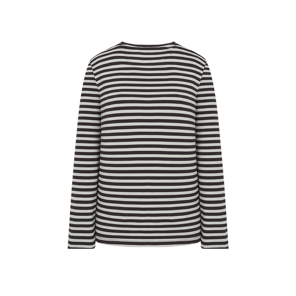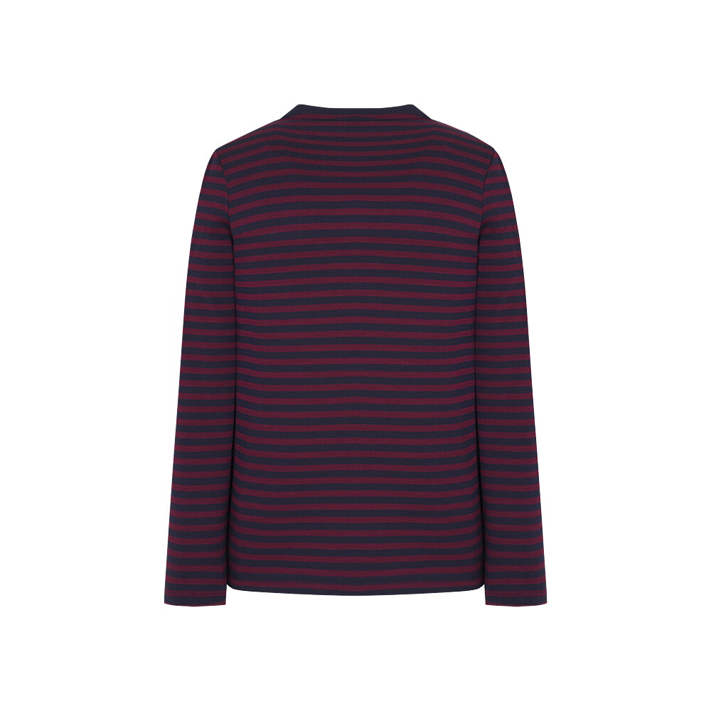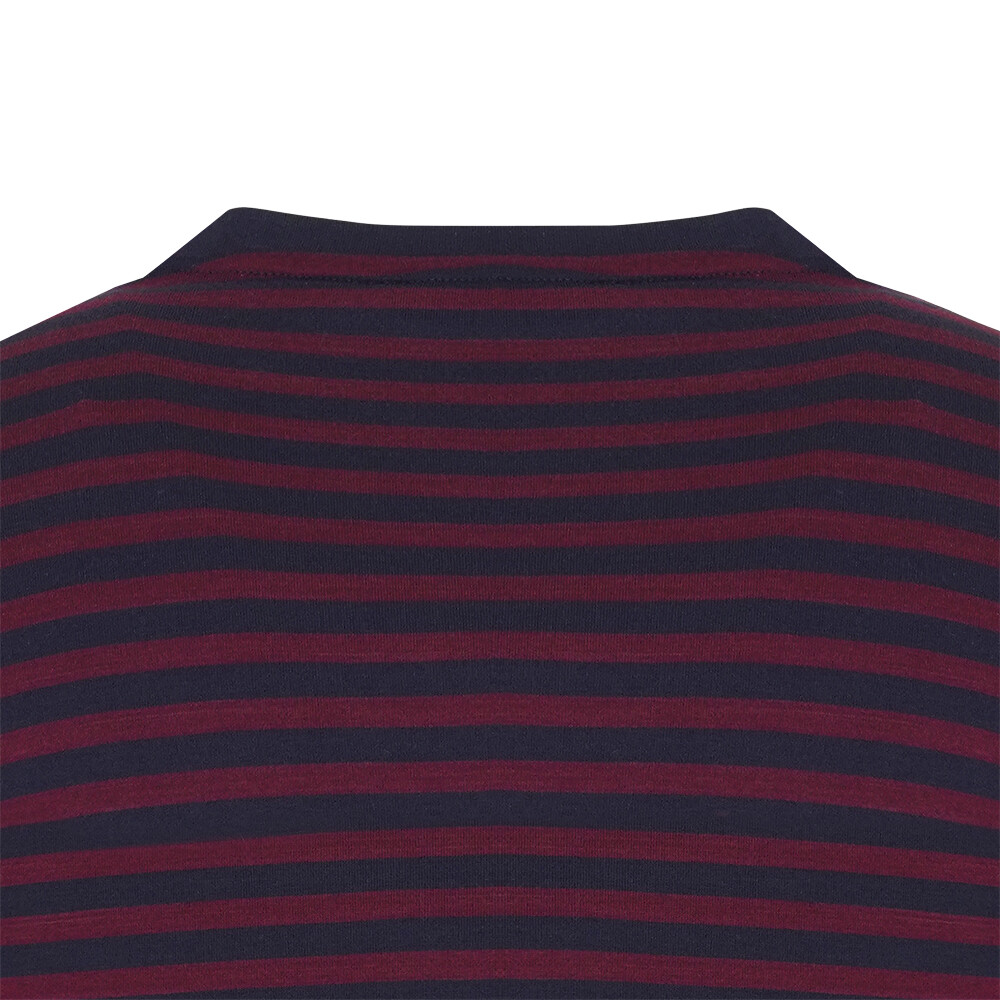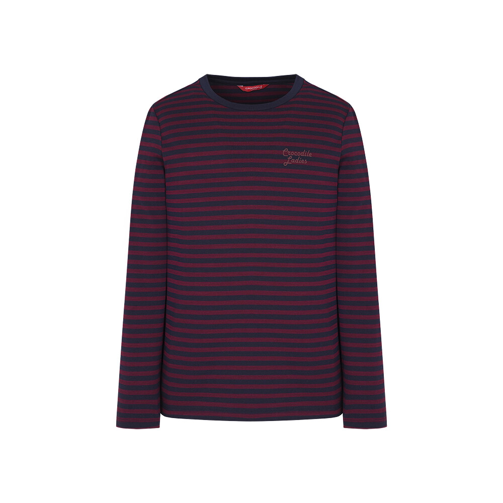 T/R MVS 소재로 부드러우며 전판 선염 스트라이프에 앞판 가슴의 로고레터링 프린트가 포인트인 라운드 티셔츠