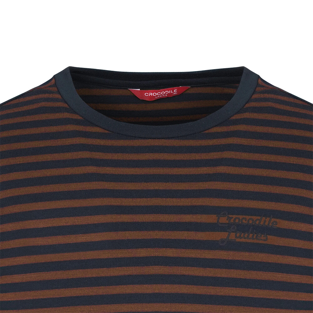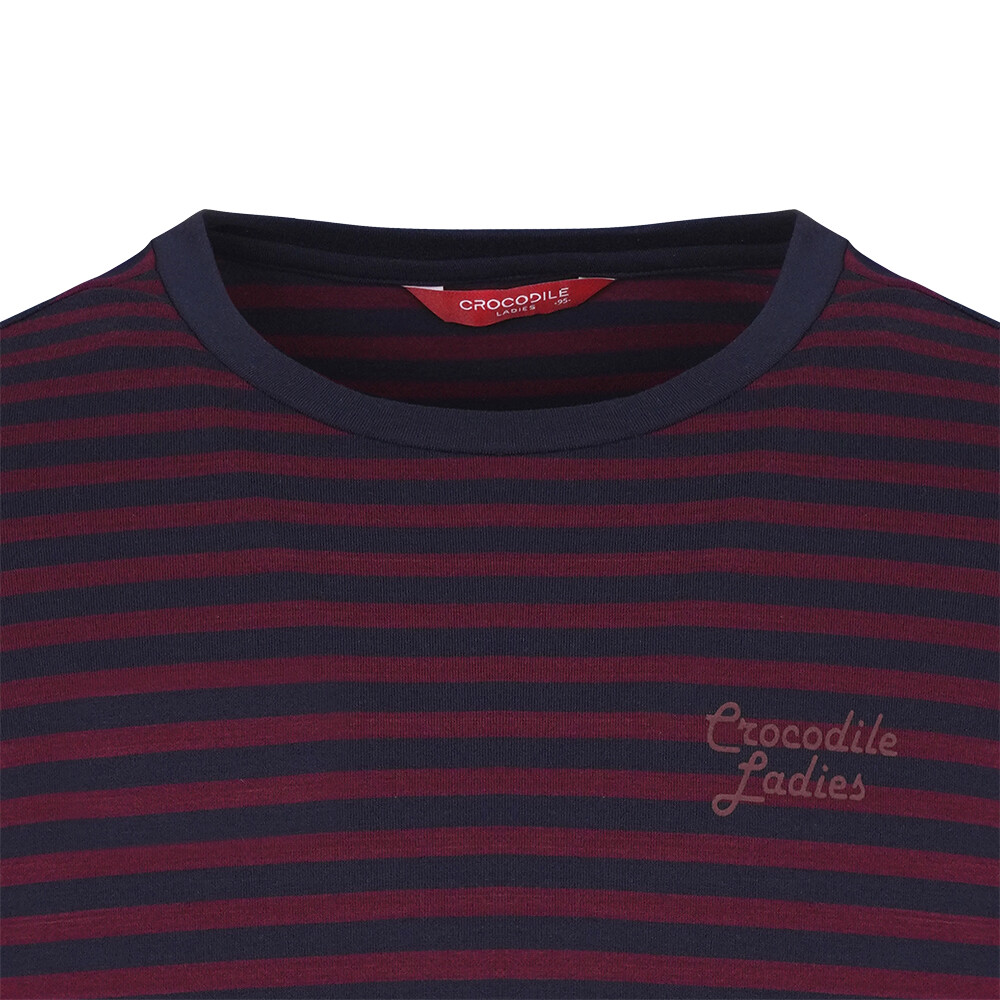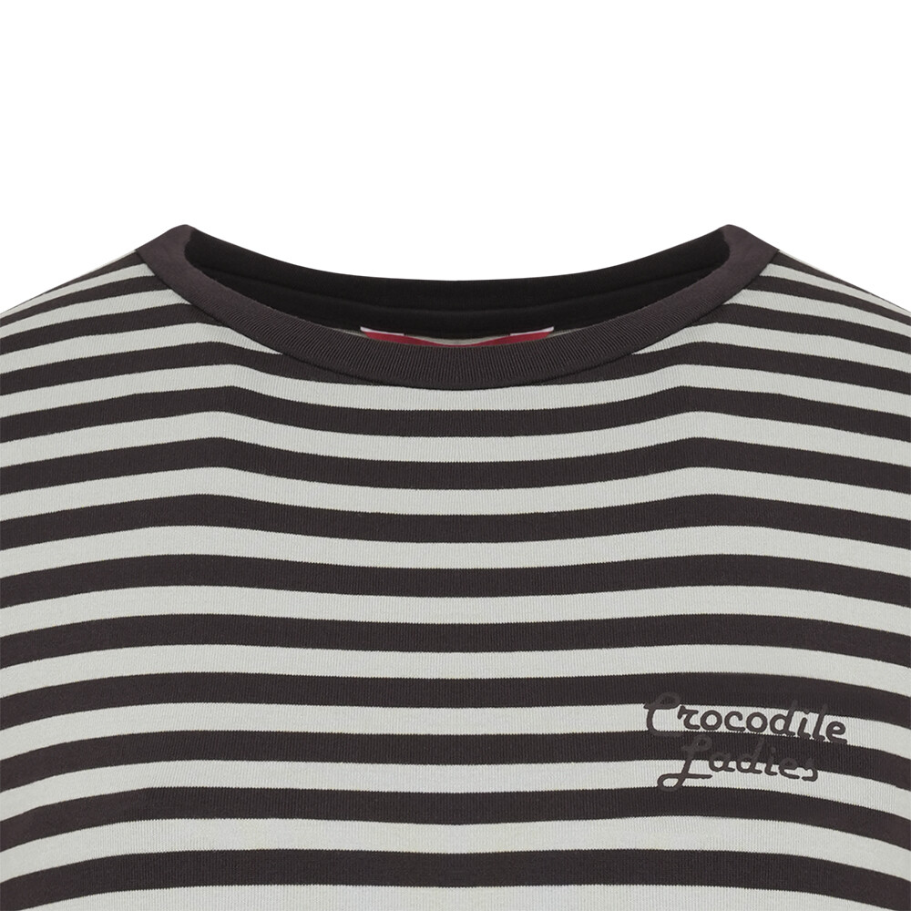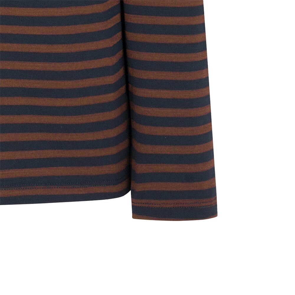 T/R MVS 소재로 부드러우며 전판 선염 스트라이프에 앞판 가슴의 로고레터링 프린트가 포인트인 라운드 티셔츠