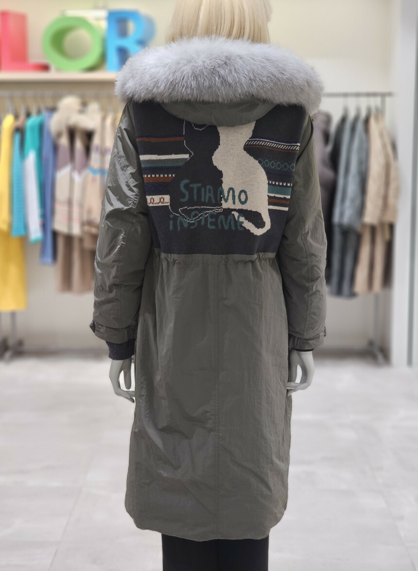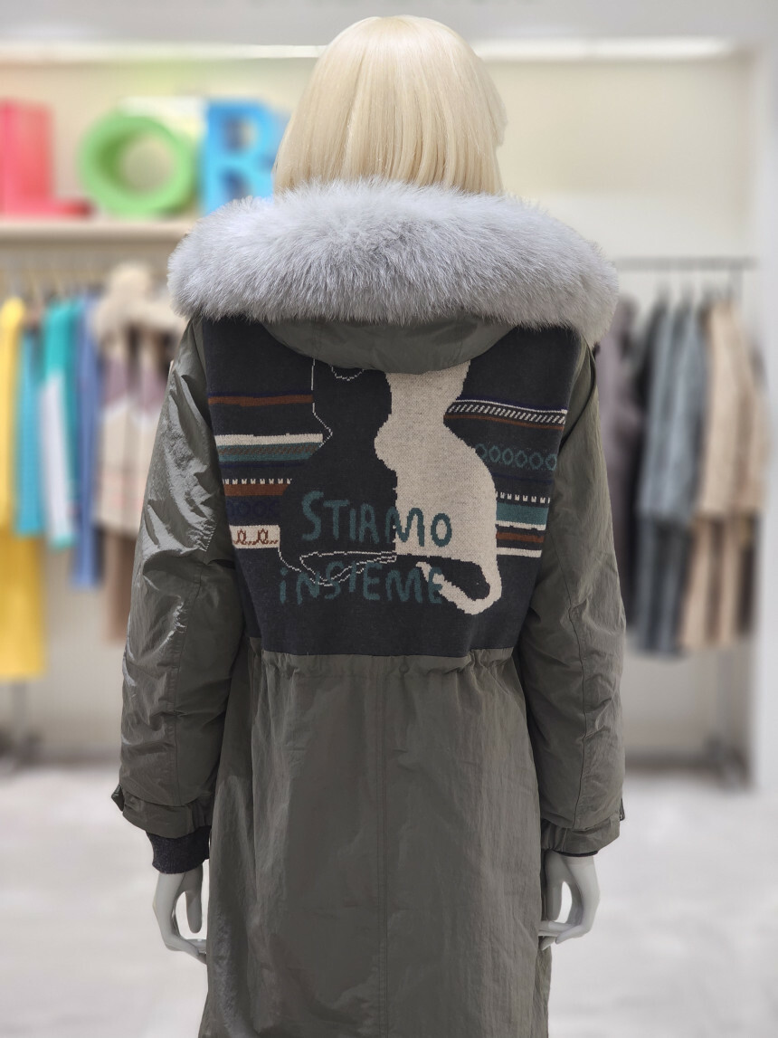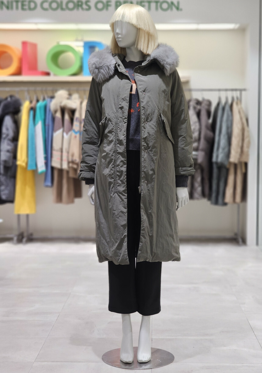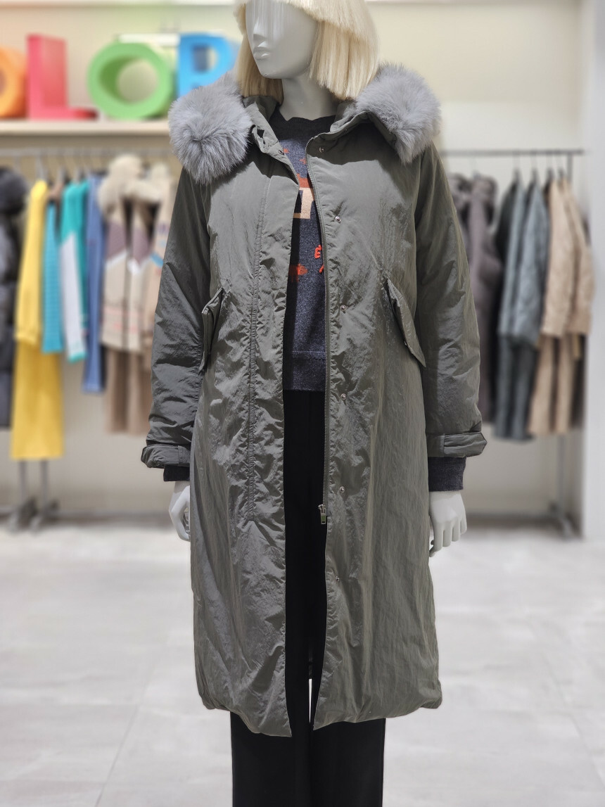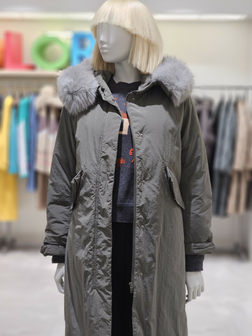 후드에 탈부착 가능한 풍성한 폭스 퍼로 고급스럽게 연출하고,