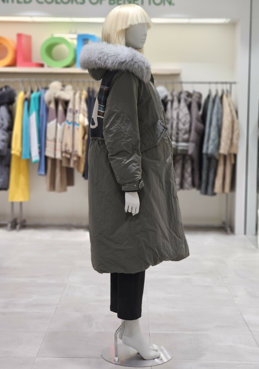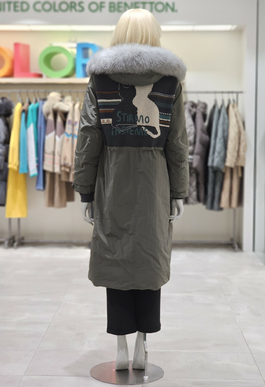 등판 니트 배새으로 캐주얼한 무드를 연출하는 폭스 퍼 구스 롱 패딩.