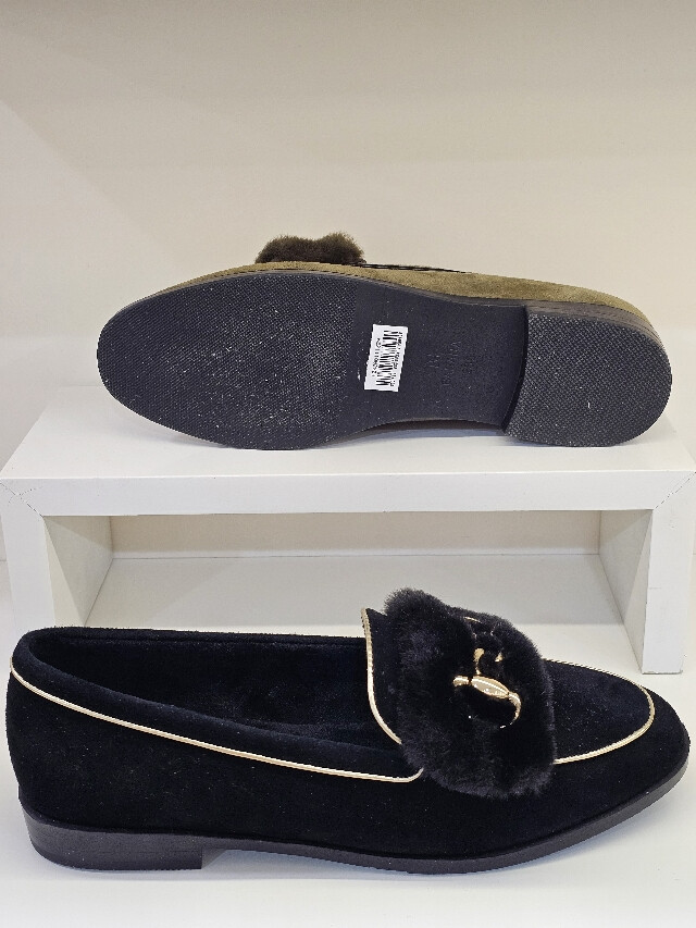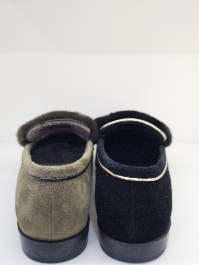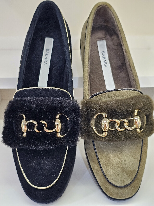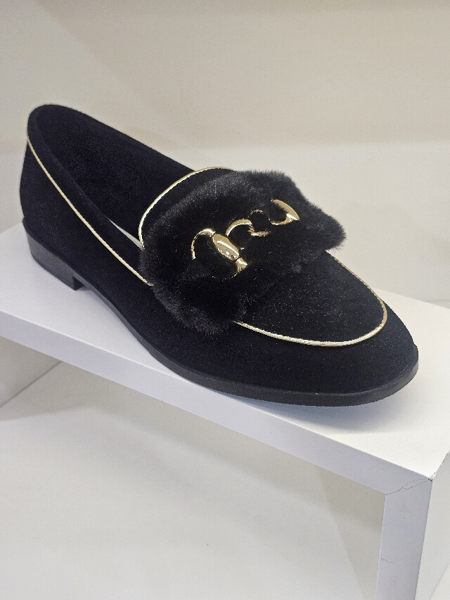 발등에 페이크 퍼를 사용 그 위에 골드 장식을