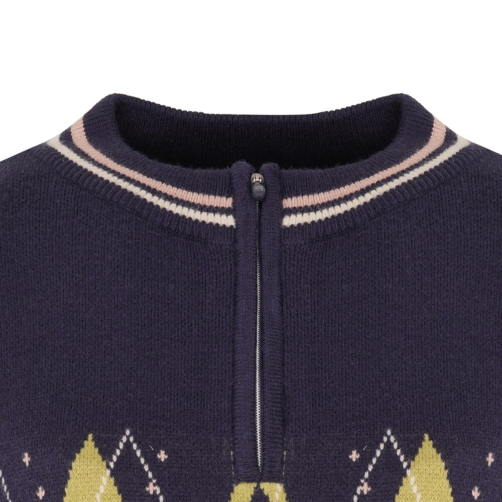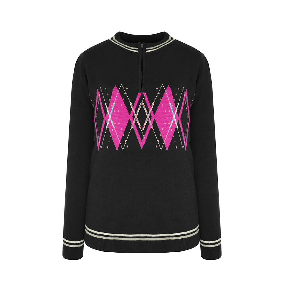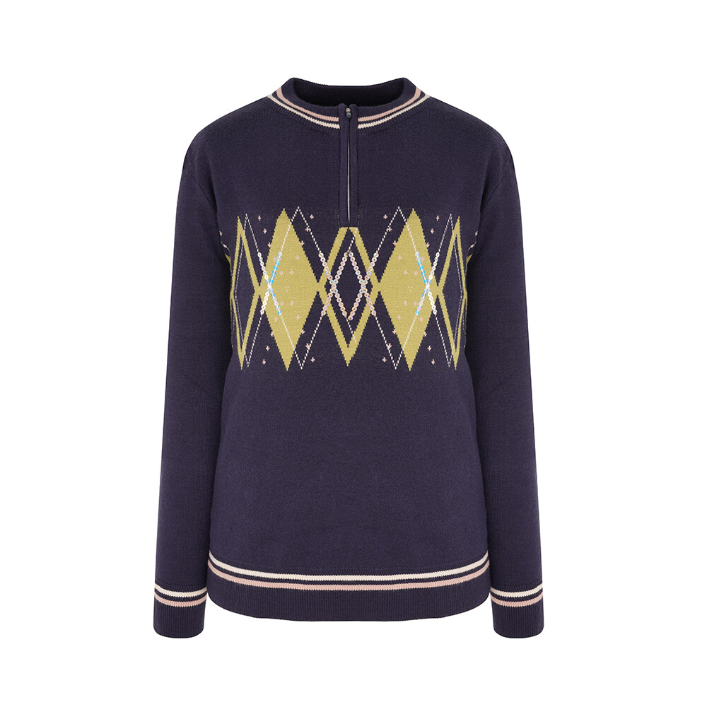앞판 아가일 무늬 자카드와 스팽글 자수가 포인트인 반집업 스웨터