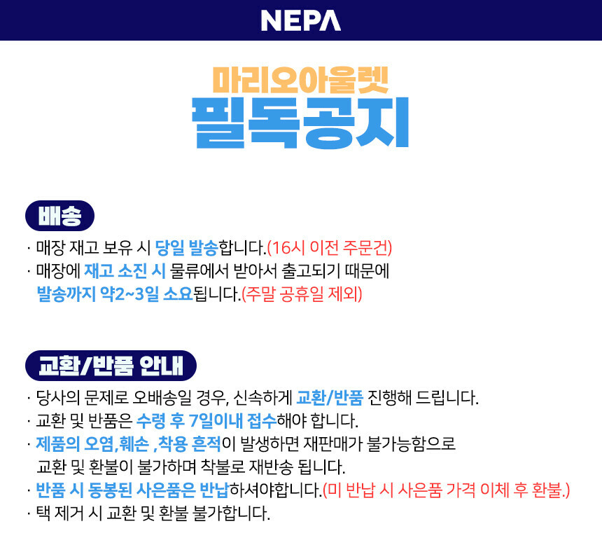 - NEPA만의 mega-C CUSHION 솔이 쿠셔닝은 물론 전면 부틸 고무 70% 함유되어 최상의 접지력 제공
