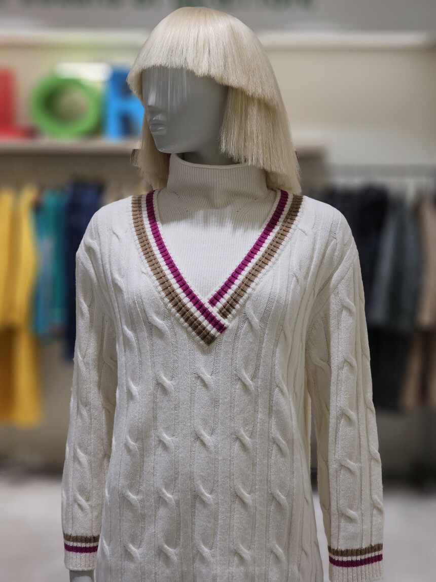 브이넥 케이블 니트와 하이넥 패치를 더하여 편안한 착용.