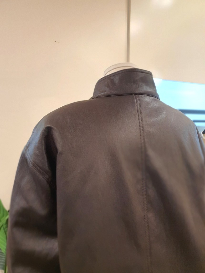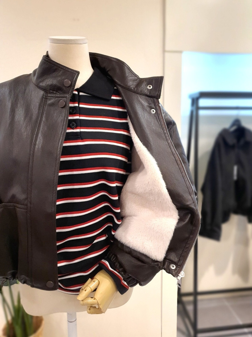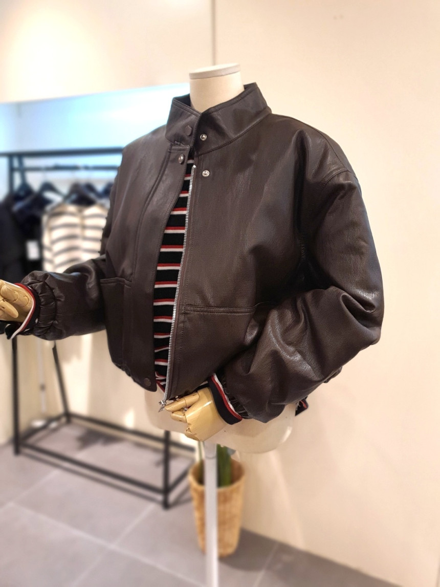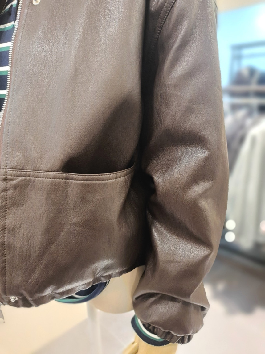 안감 에코퍼 레더점퍼입니다. 차이나 반목 넥라인으로 따뜻하고 멋스러운 디자인입니다.