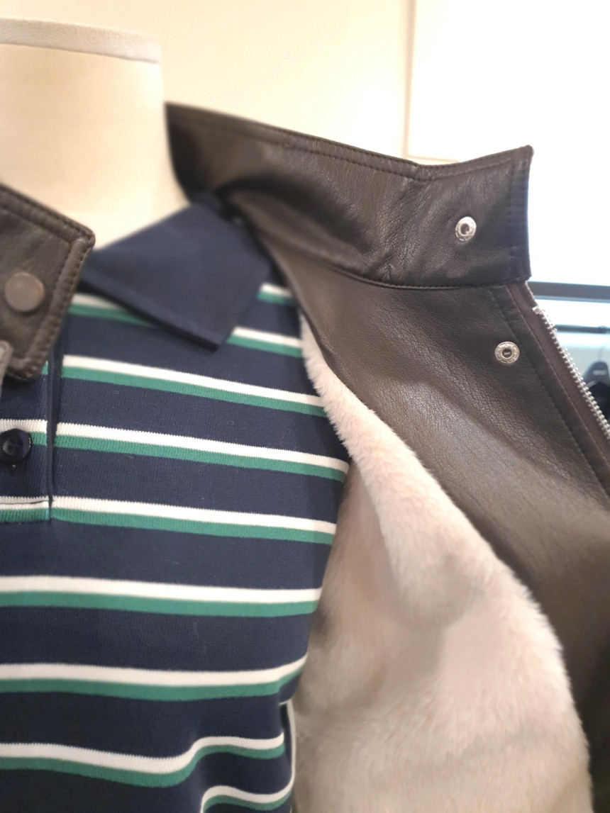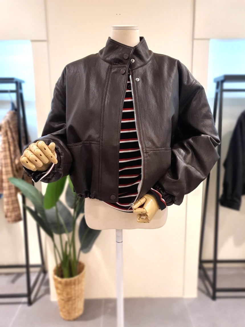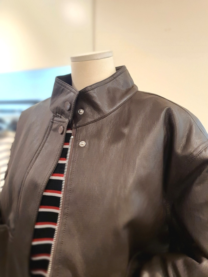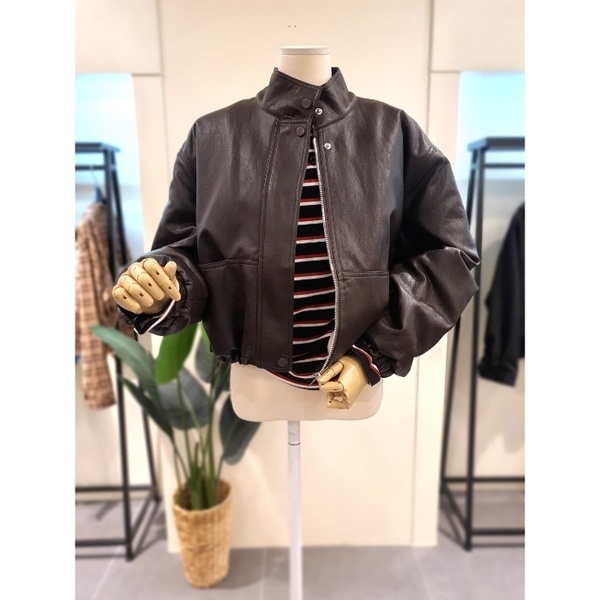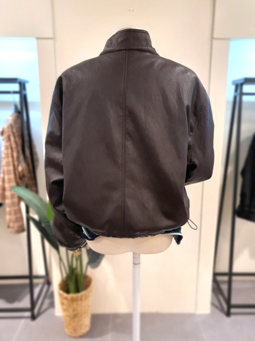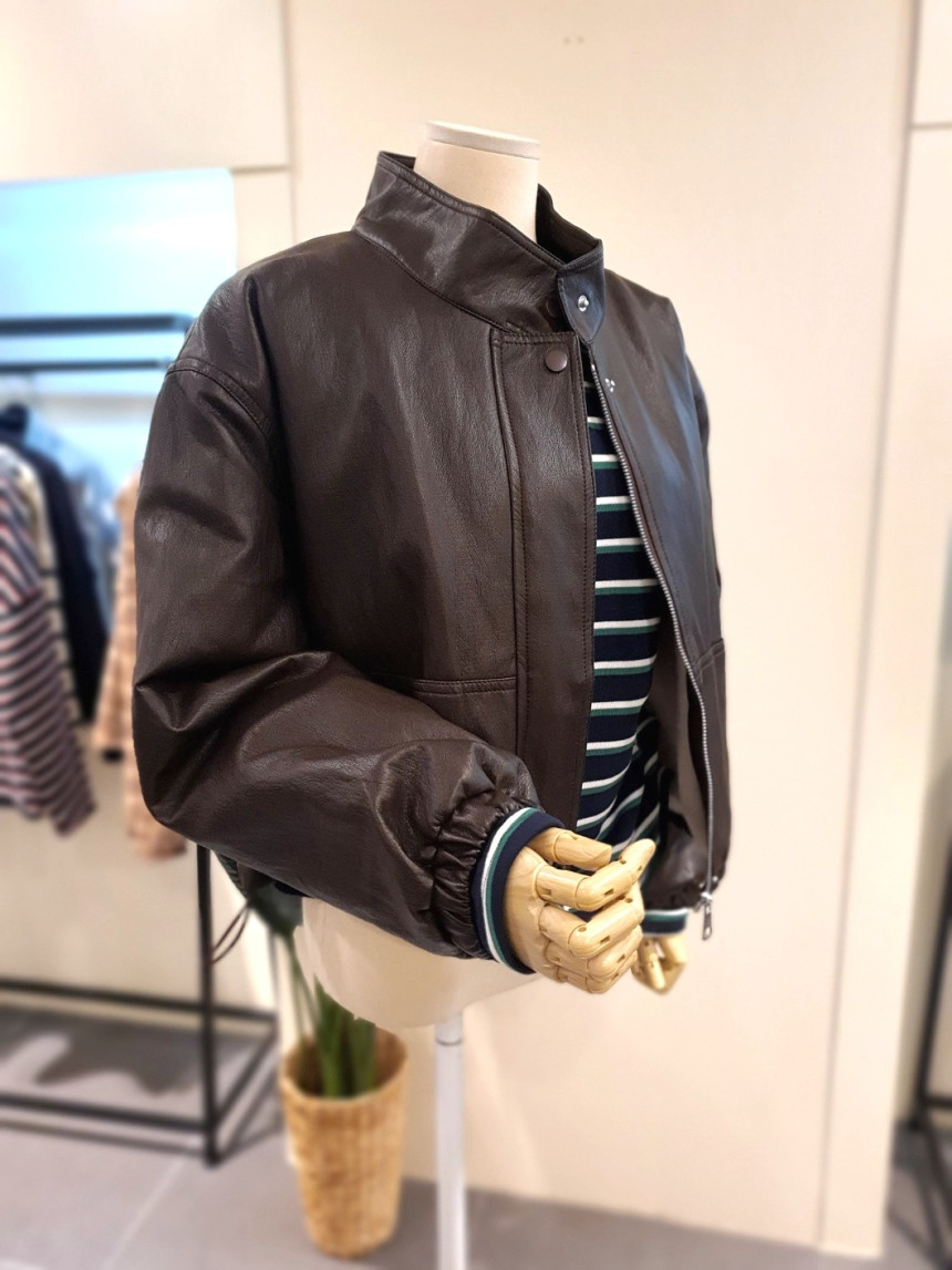 안감 에코퍼 레더점퍼입니다. 차이나 반목 넥라인으로 따뜻하고 멋스러운 디자인입니다.