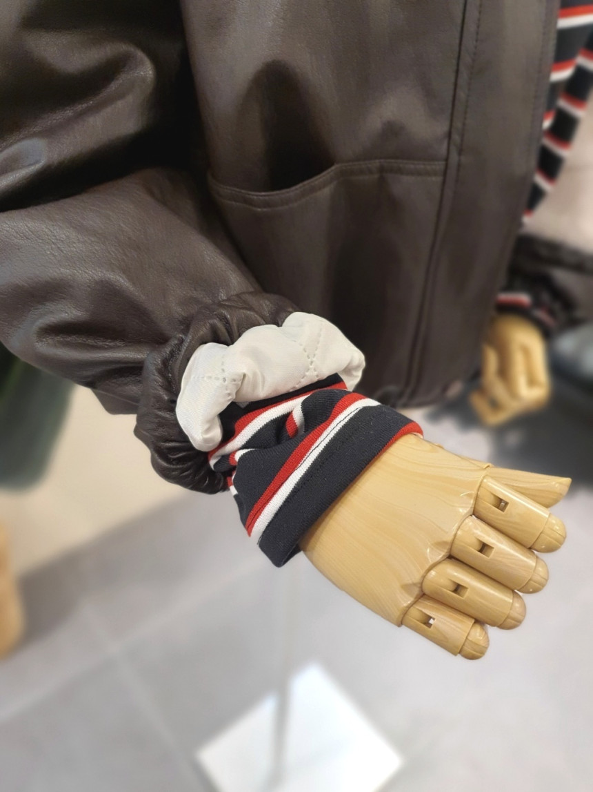 주머니 있습니다. 소매 밴딩입니다. 암감과 가죽모두 페이크입니다.