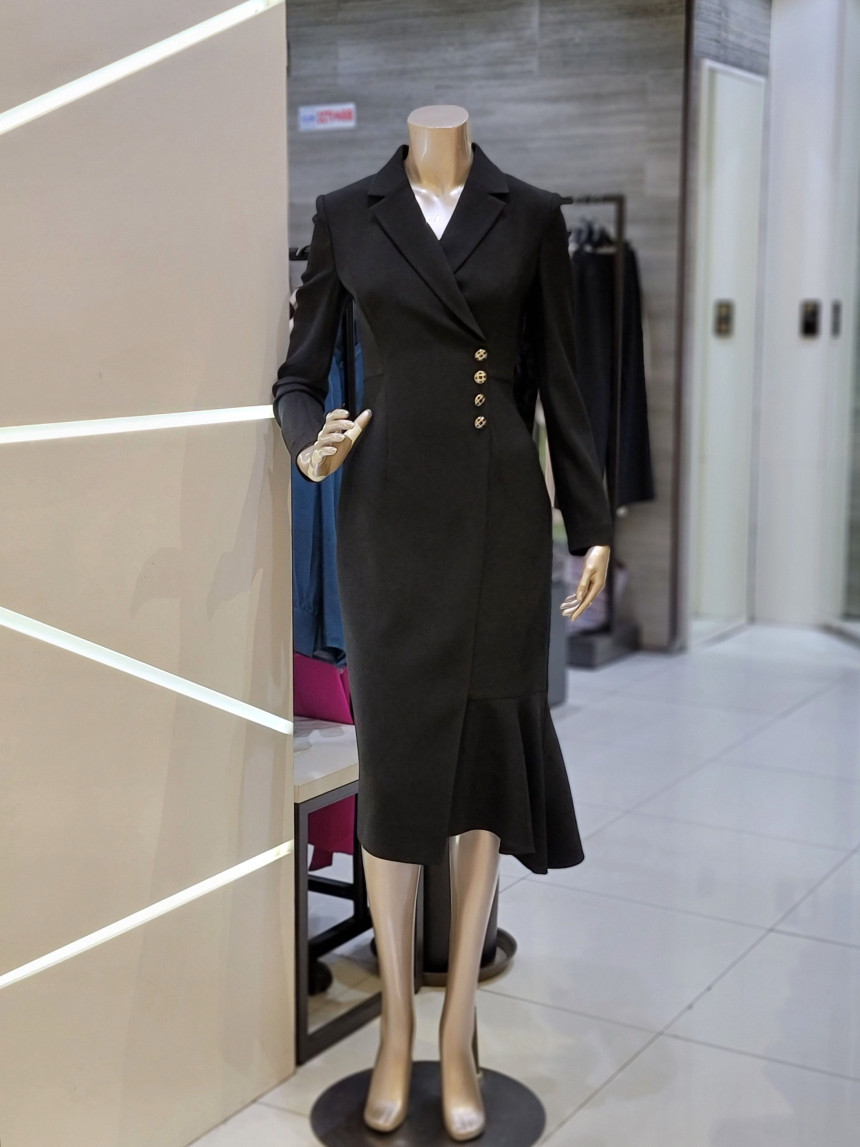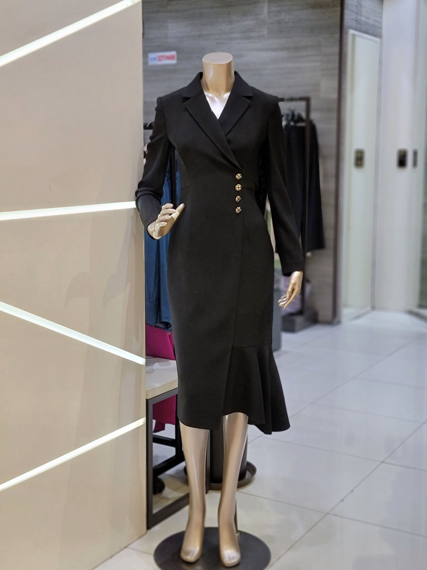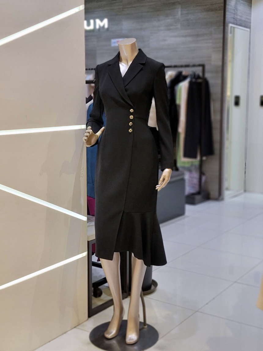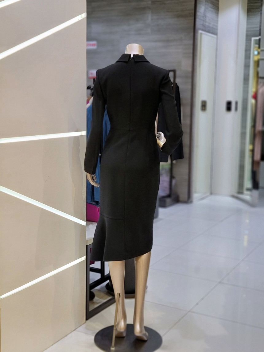허리 라인 사이드 버튼 장식과 밑단 슬릿 디테일로